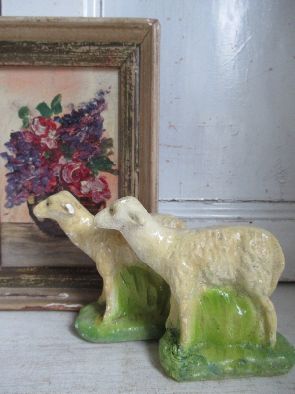 • 2 oude liggende schaapjes, gips