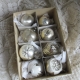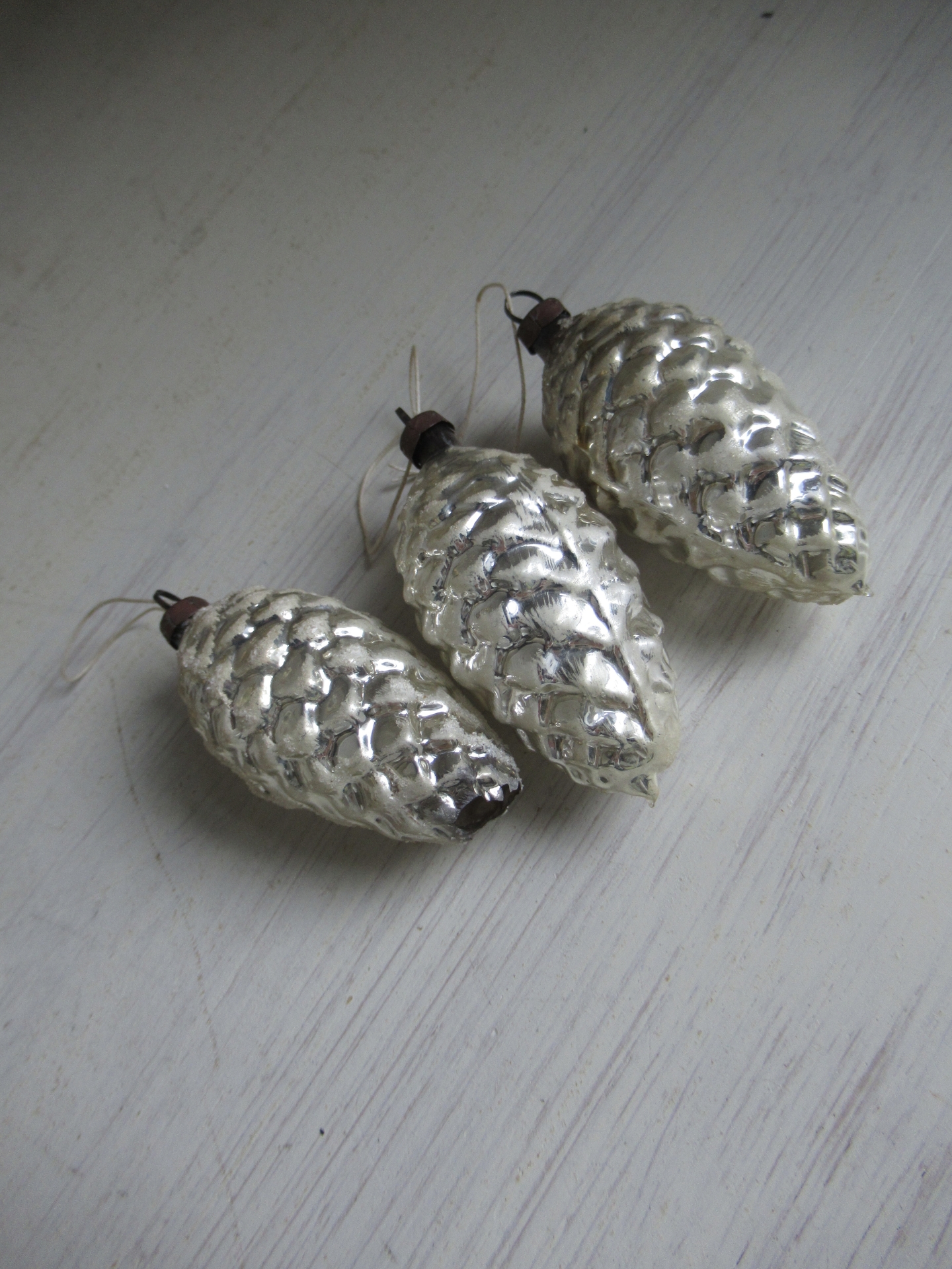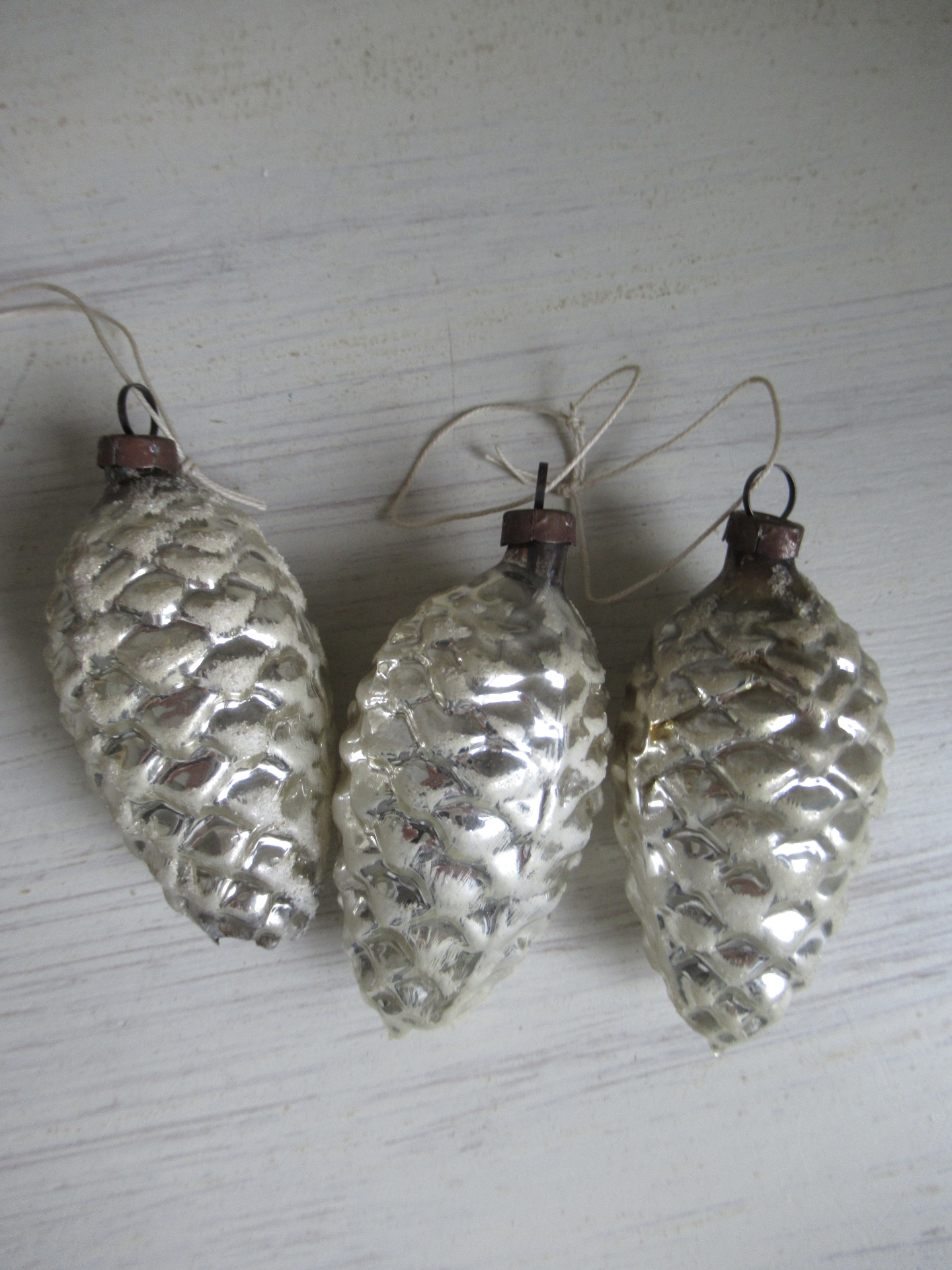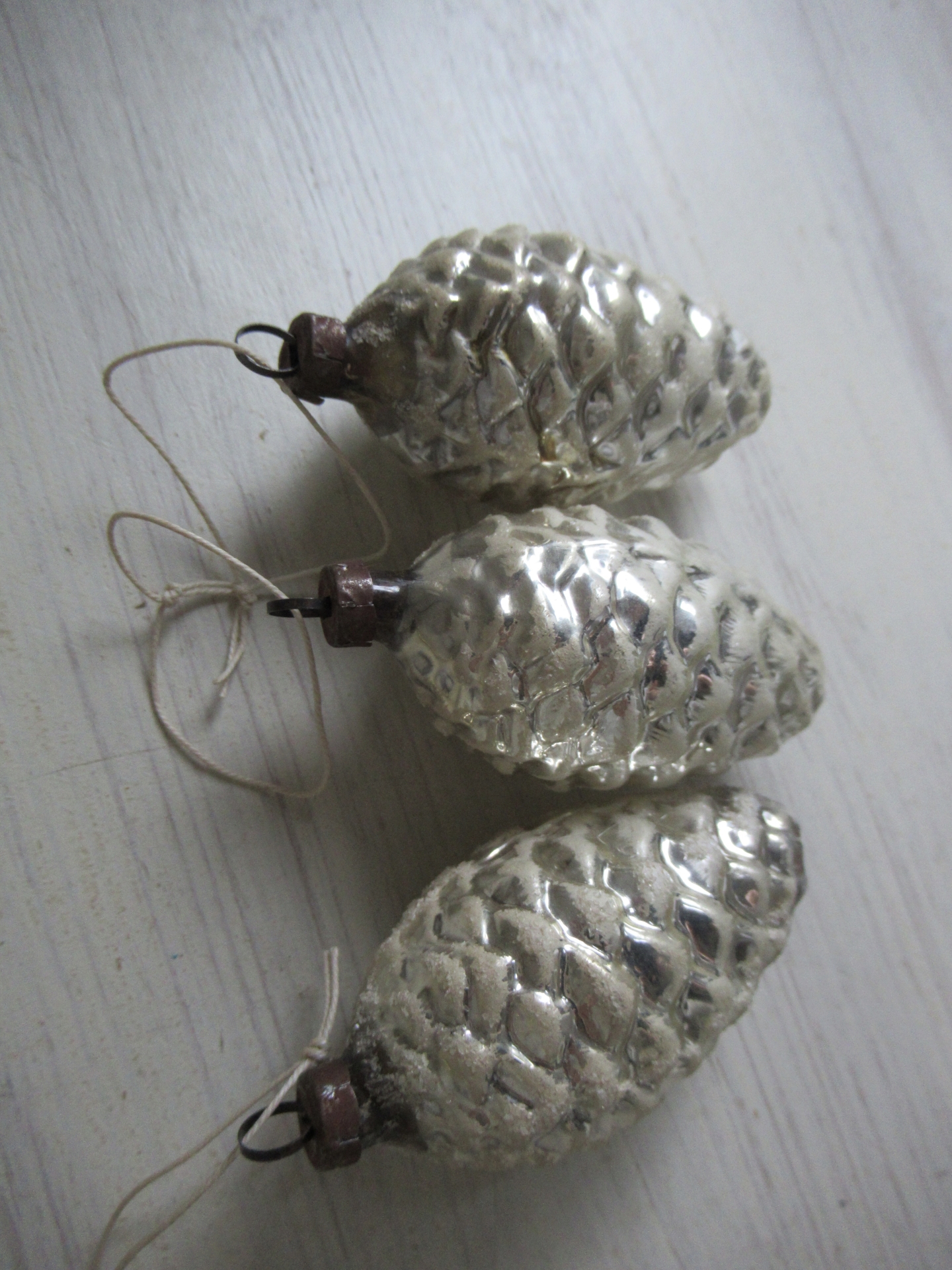 3 oude kerstballen, dennenappels, 1 heeft een gat onderin, de andere 2 zijn gaaf, setprijs (lengte 7,5 cm)