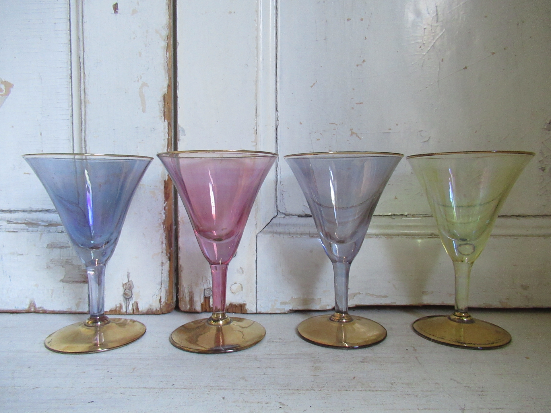 4 oude Franse glazen, 4 verschillende kleuren, met parelmoerglans en goudkleurige details, setprijs (hoogte 11 cm)