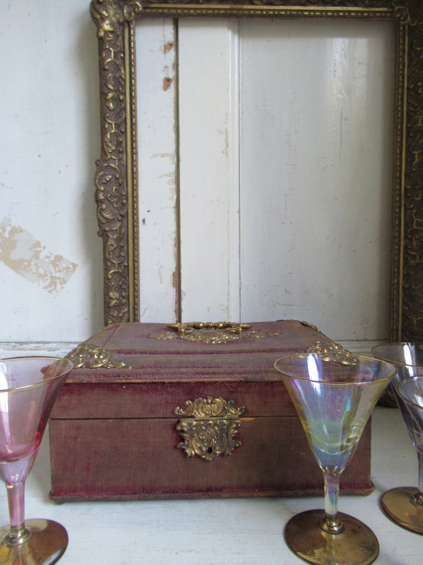 antiek shabby sieraden kistje, meegenomen uit Frankrijk, sleets verstorven rood fluweel, sluiting is niet compleet, deksel ‘wiebelt’ wat, maar deze is prachtig! (24 bij 17 cm, hoogte 11 cm exclusief handvat)