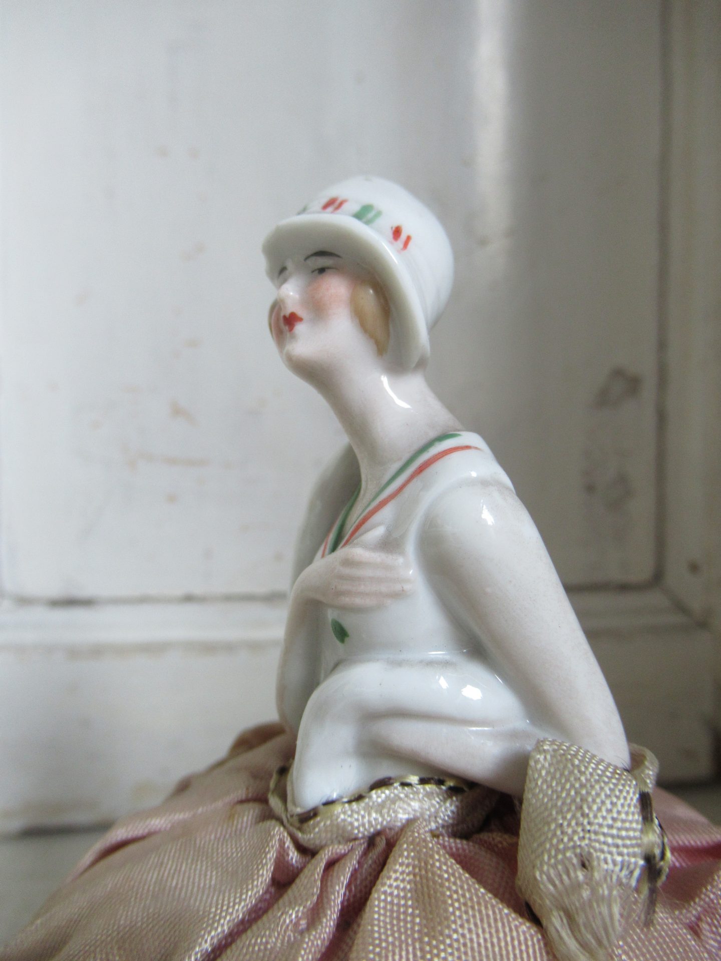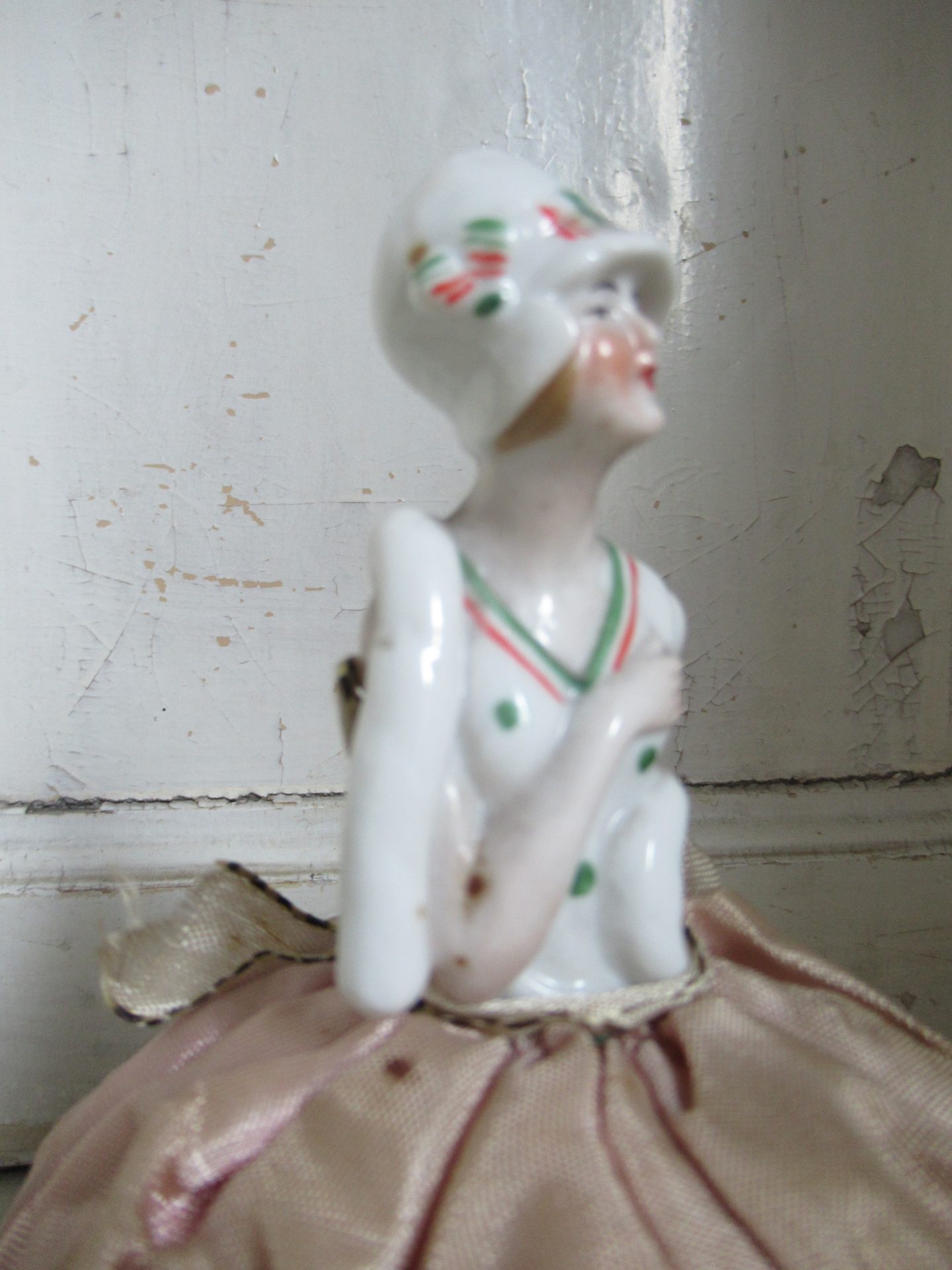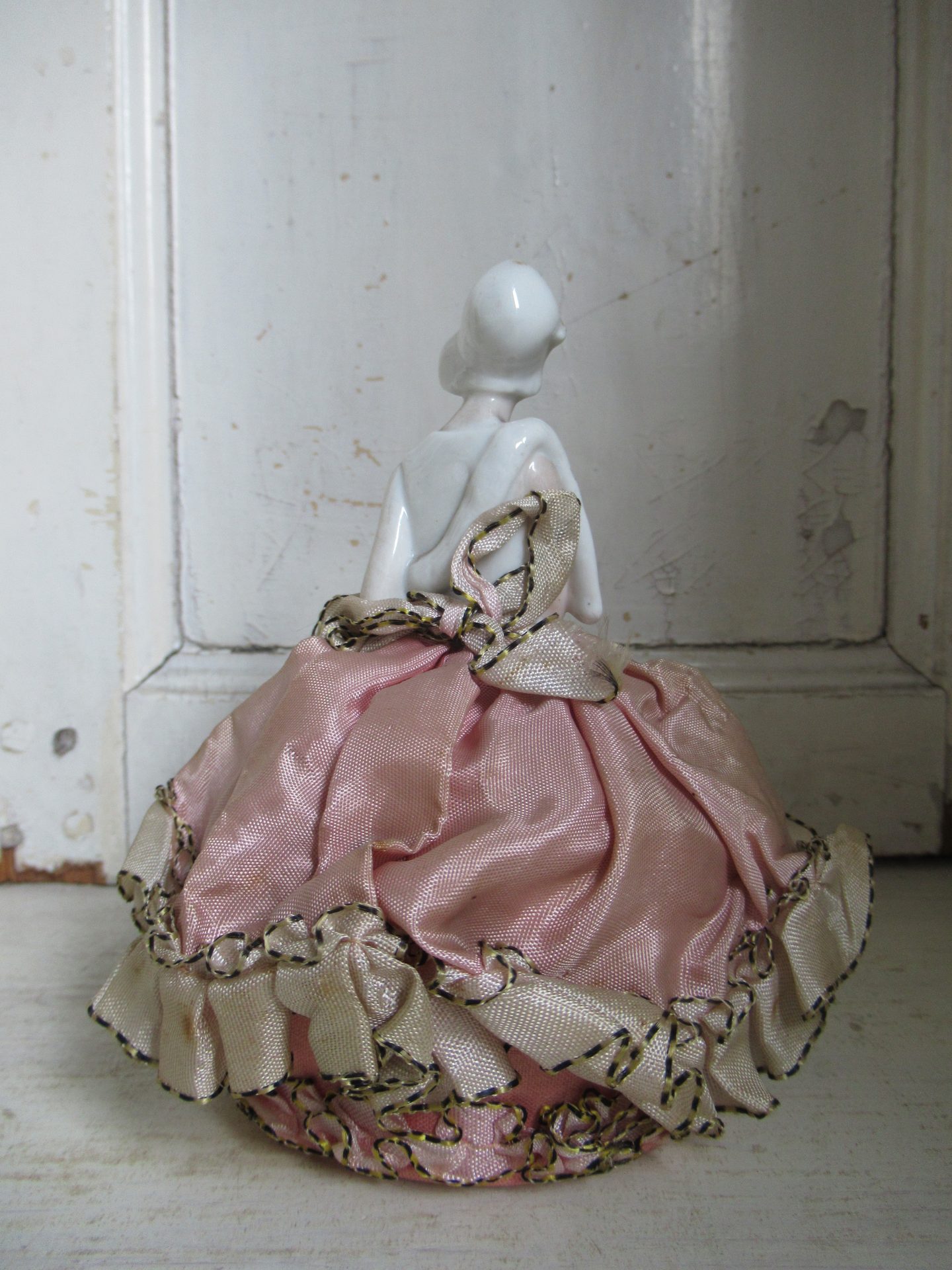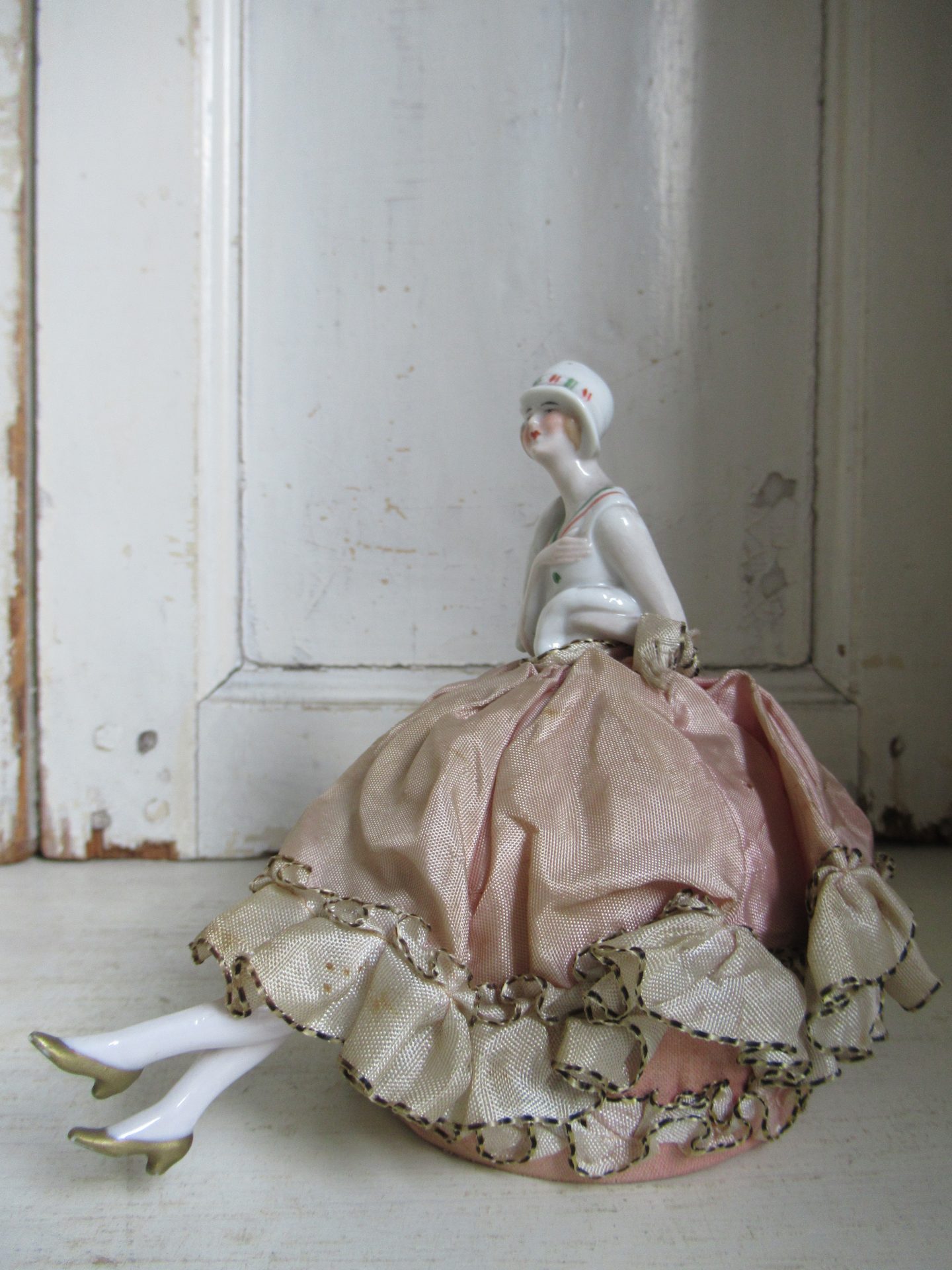 antieke Franse half doll, speldenkussen, in prachtige staat, ook de beentjes, stof is mooi verstorven roze (hoogte 15 cm)