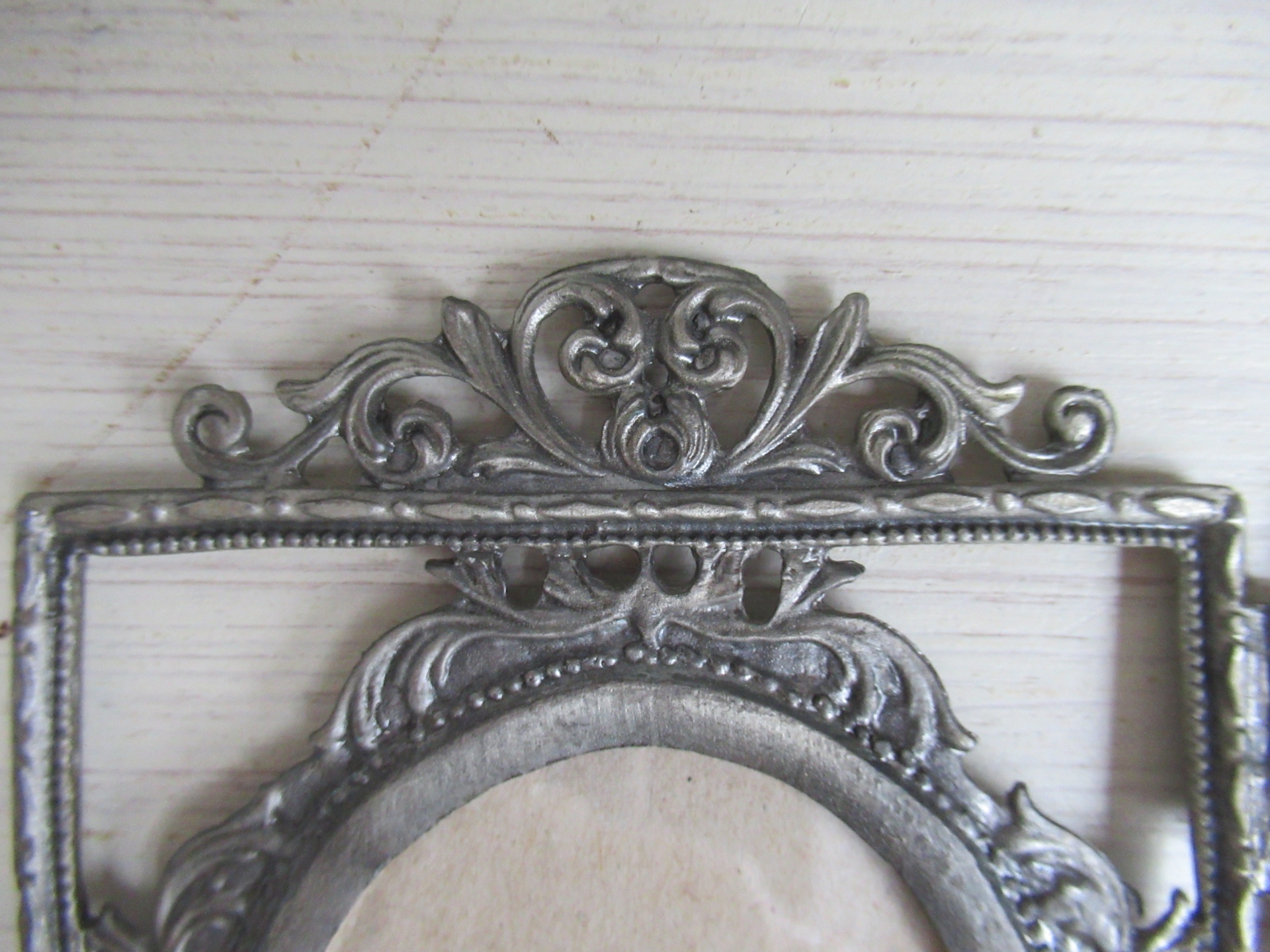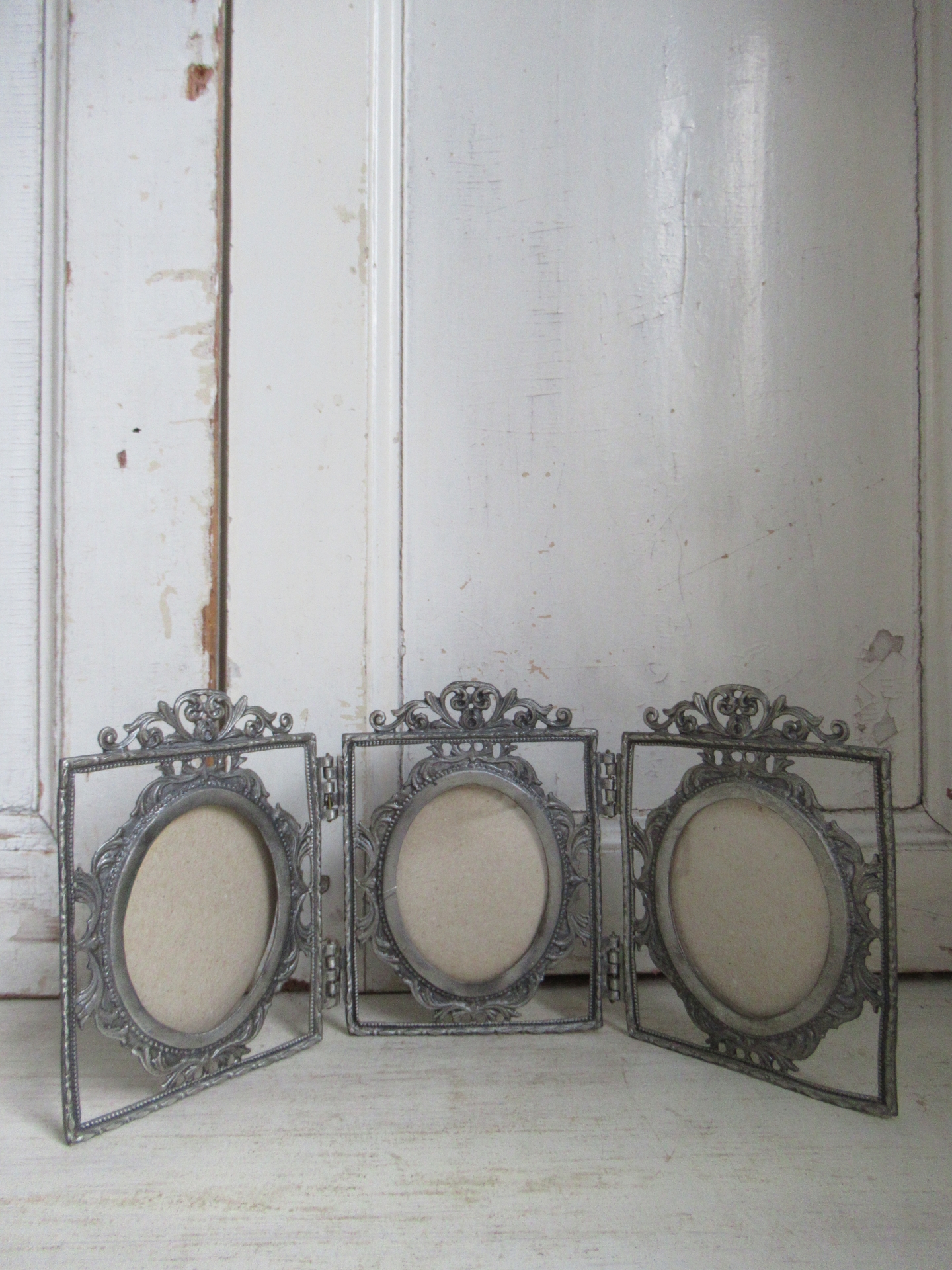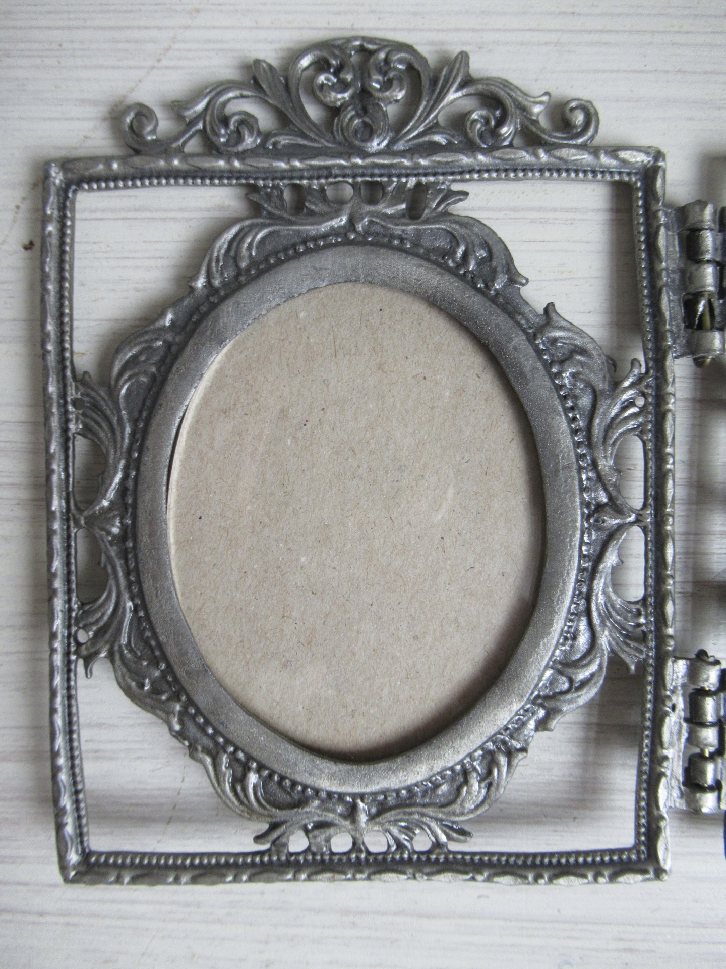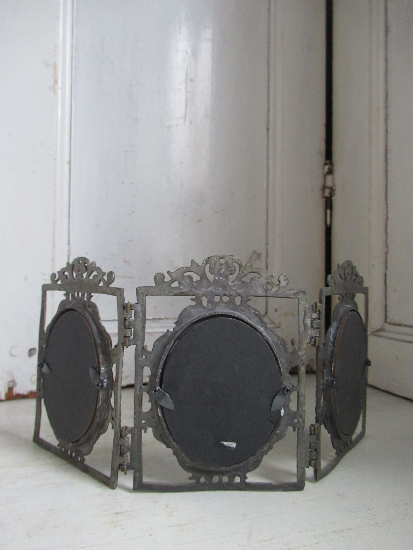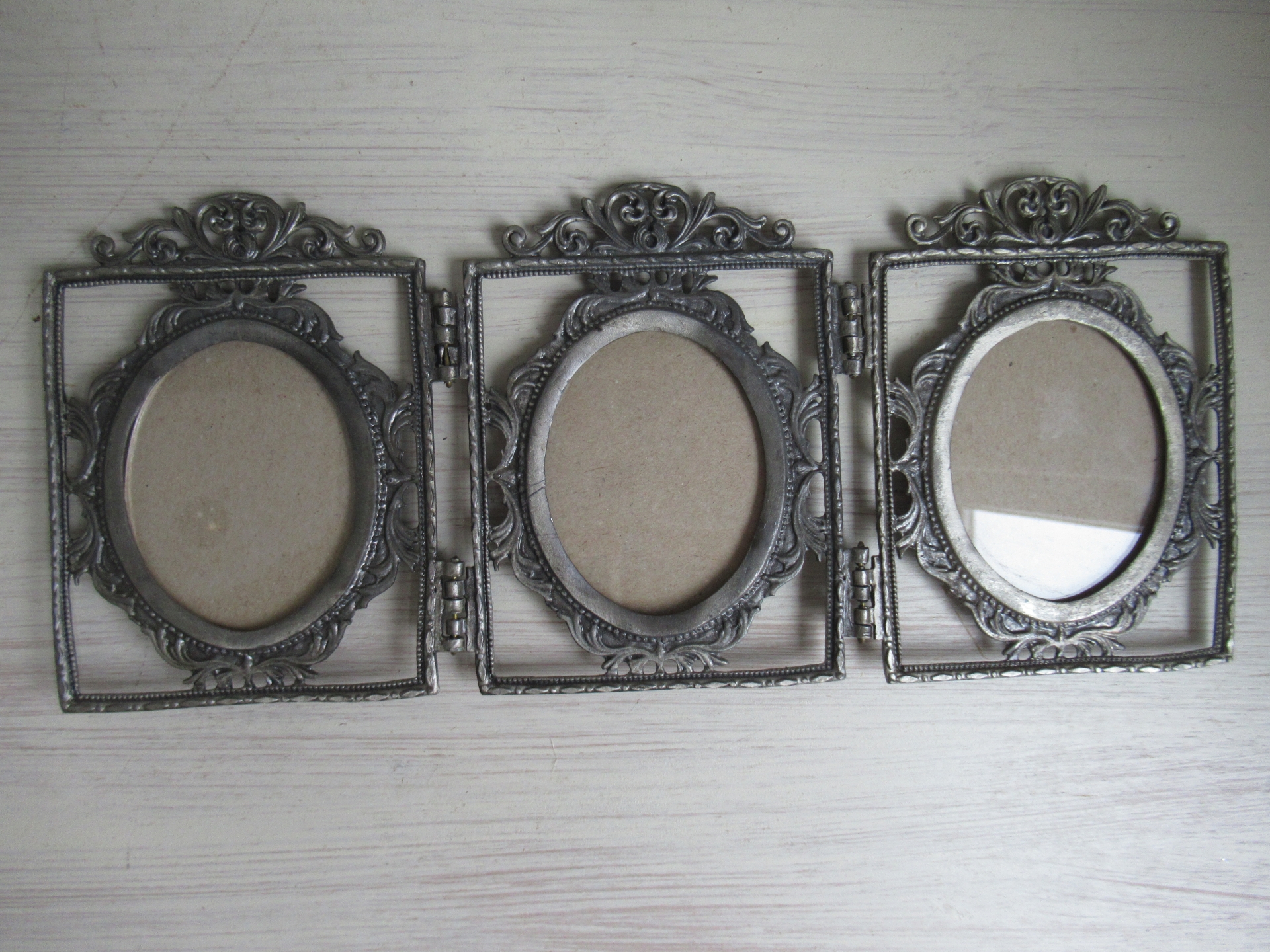 bijzonder fotolijstje, 3-luik, lijkt oud, maar de achterkant ziet er niet oud uit (30 bij 13 cm, ruimte voor afbeelding 7 bij 5,5 cm)