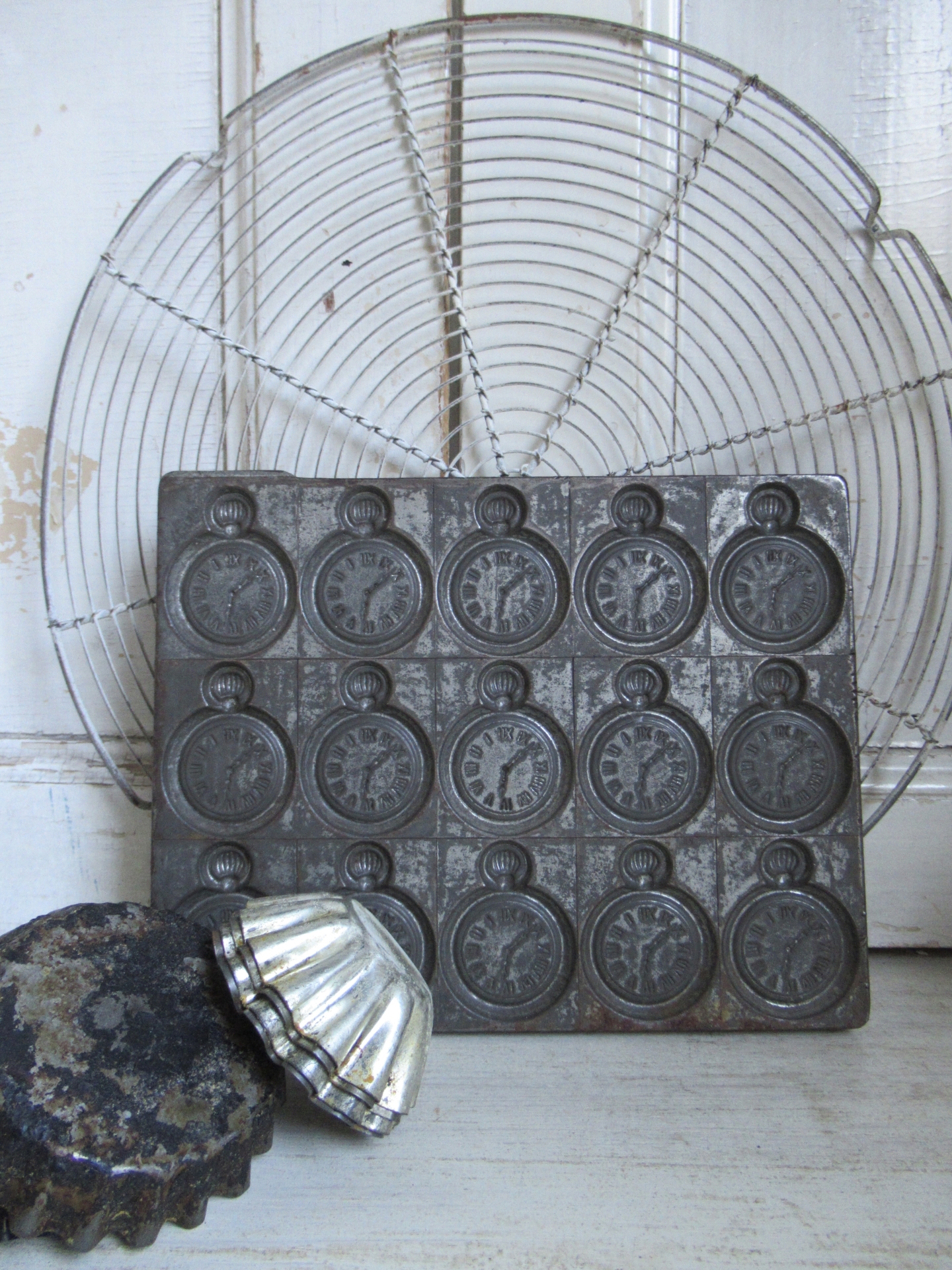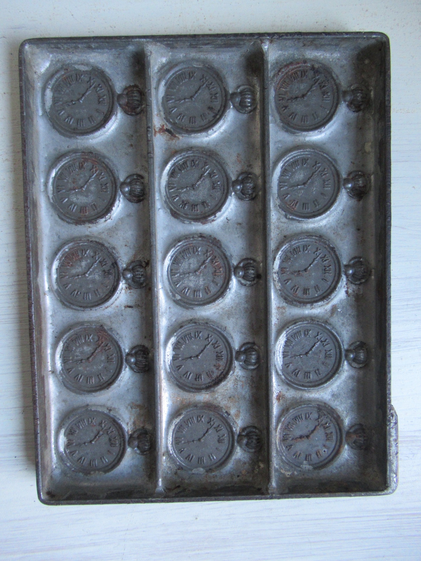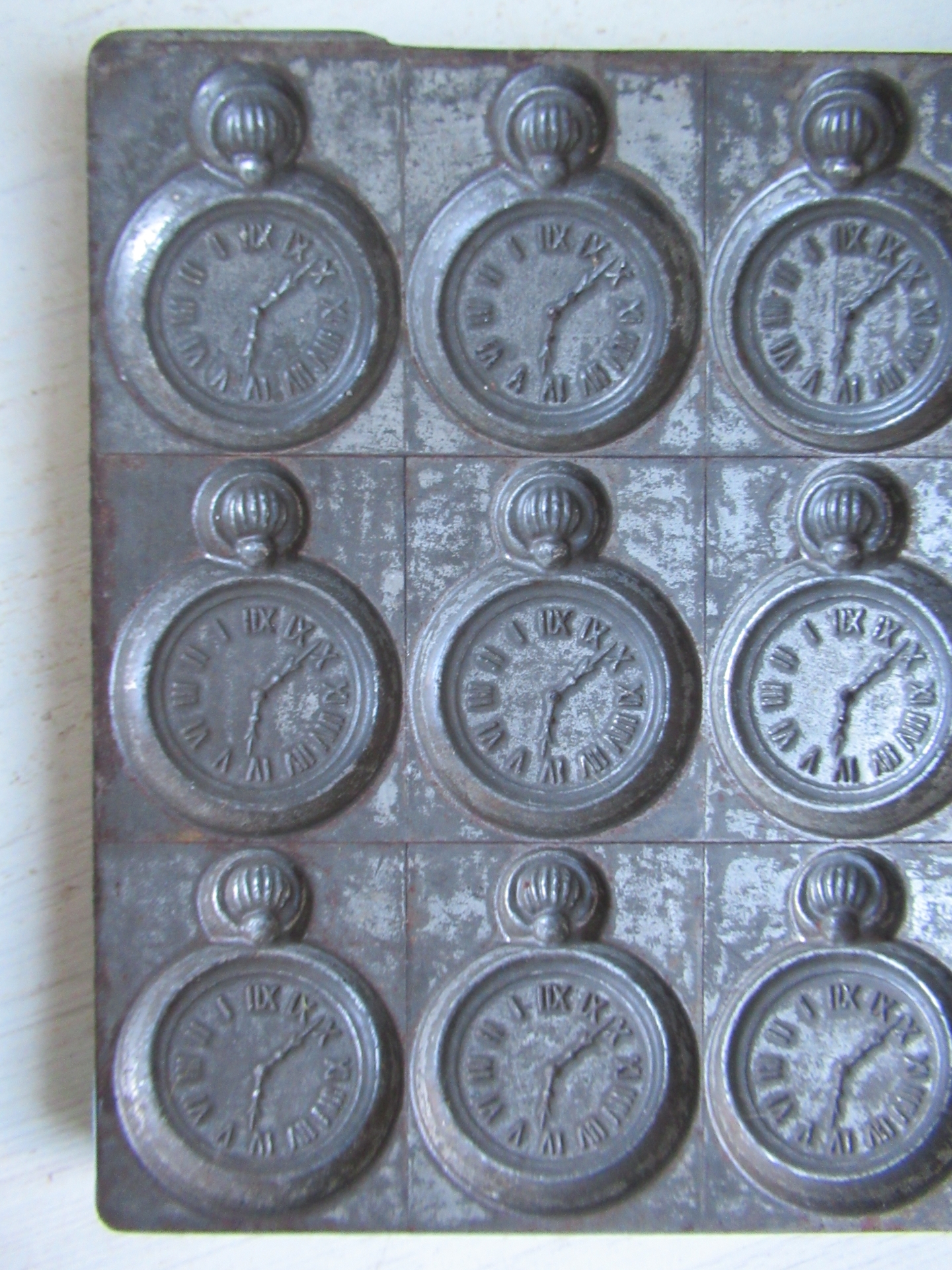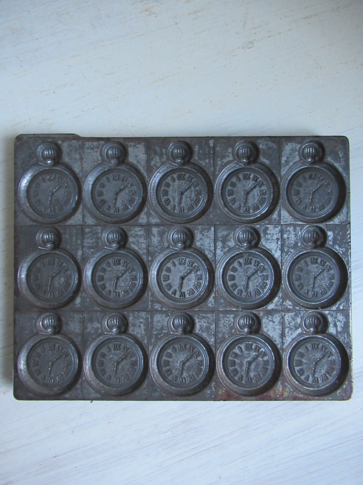 bijzondere oude chocoladevorm, klokken (20,5 bij 16 cm, 1,5 cm hoog)