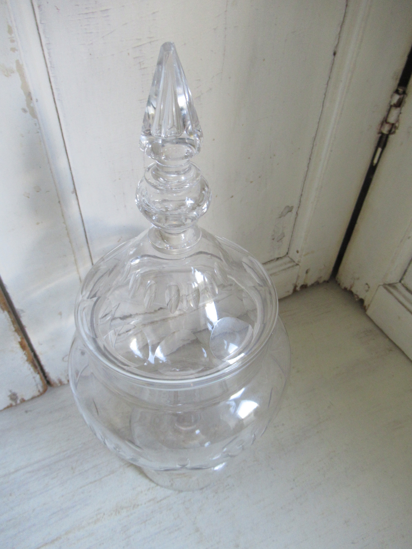 bijzondere oude glazen bowlschaal op voet met deksel, punt van deksel mist een stukje, maar valt niet erg op, langs de rand van de schaal zitten wat schaafjes, zie je nauwelijks als de deksel erop zit (hoogte 36 cm)