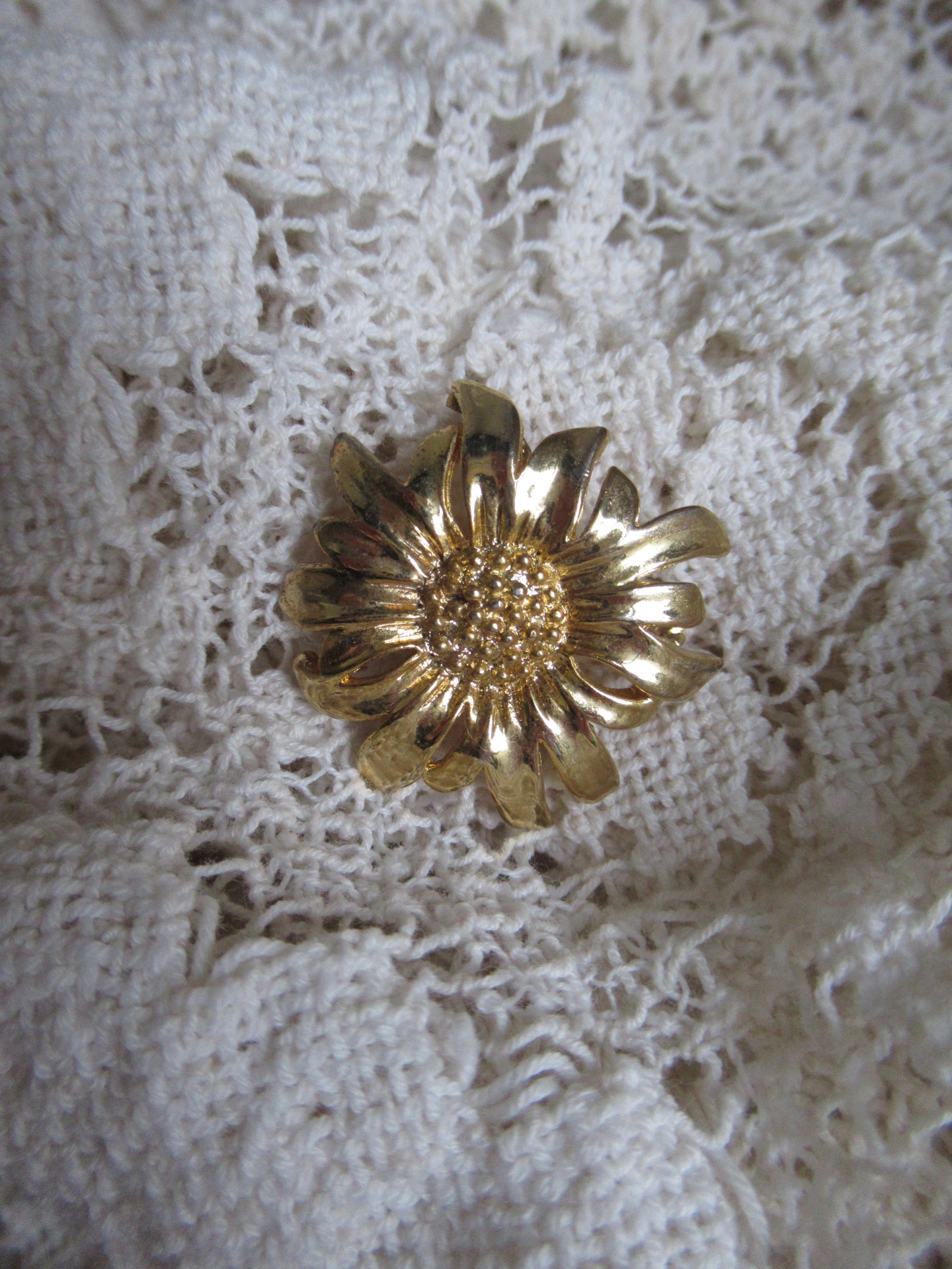 eenvoudige broche, goudkleurig metaal, geen idee hoe oud, met veiligheidssluiting (doorsnede 3 cm)