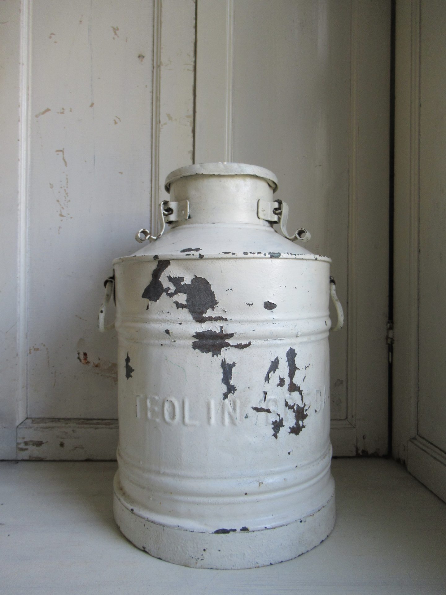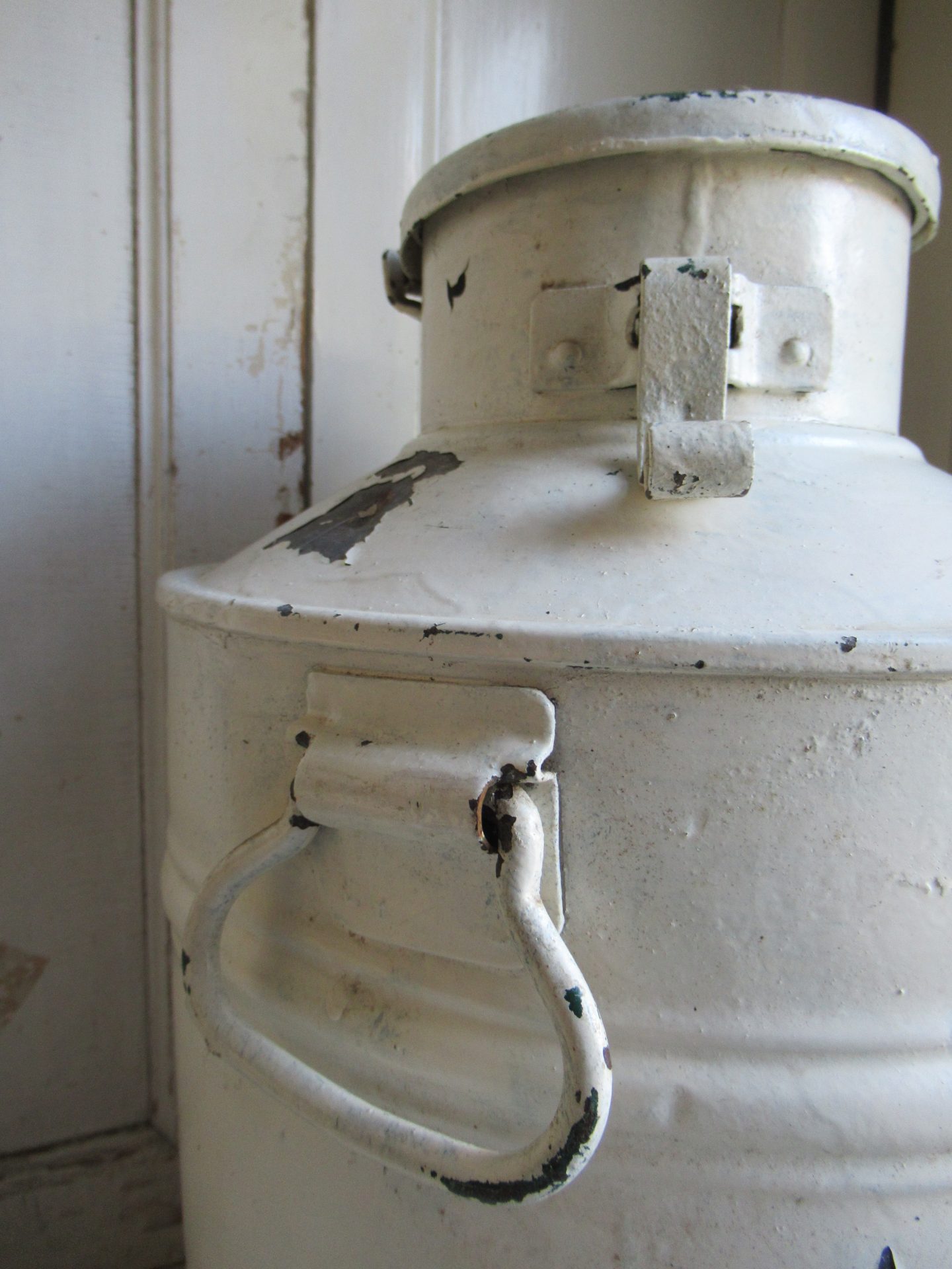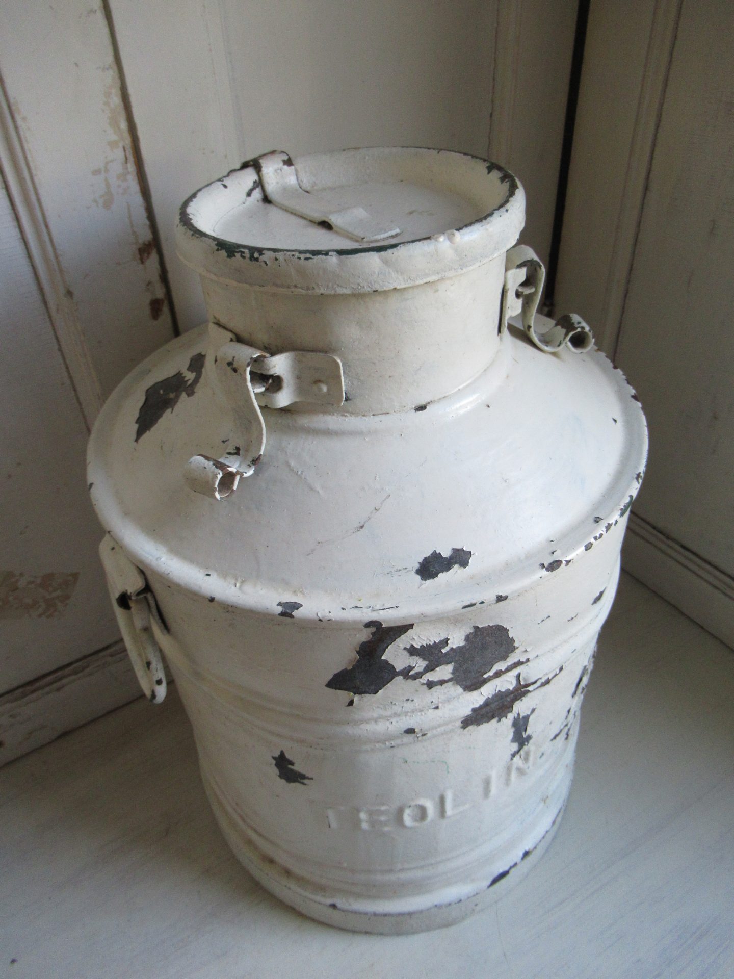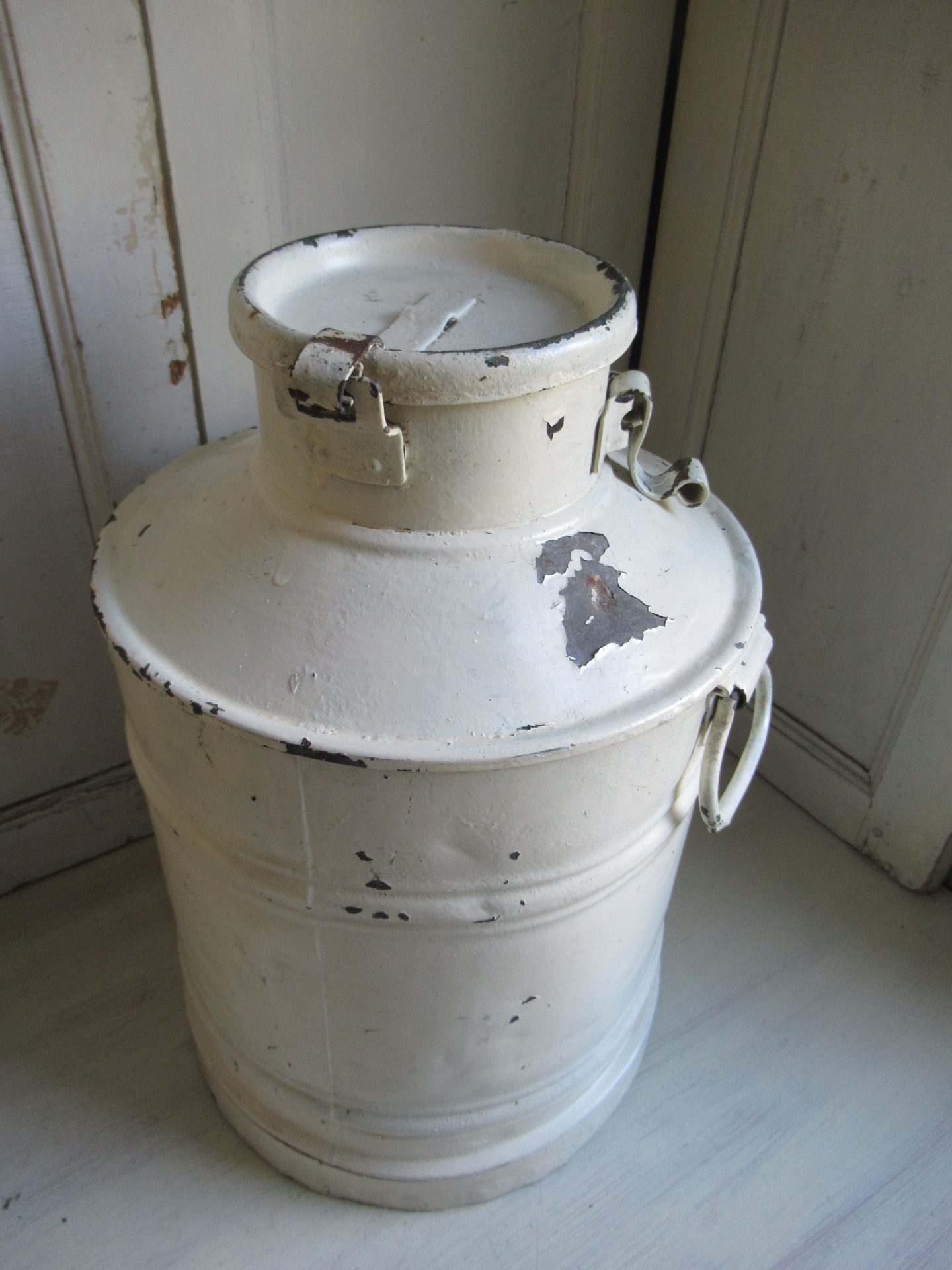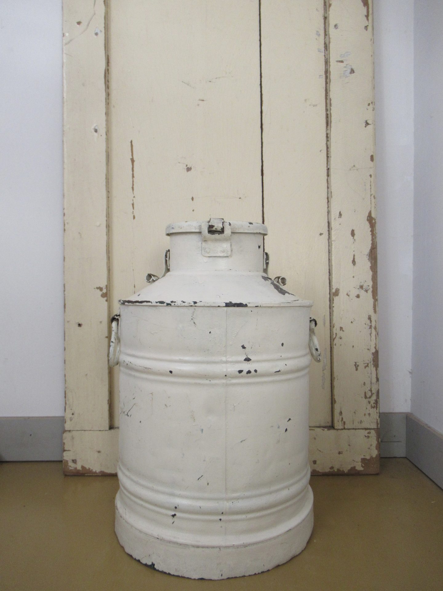 grote oude melkemmer, geverfd in een mooie kleur, verf bladdert aan 1 kant een klein beetje af, ik krijg de deksel niet open, misschien als je sterker bent dat het wel lukt, decoratief item! (hoogte 48 cm)