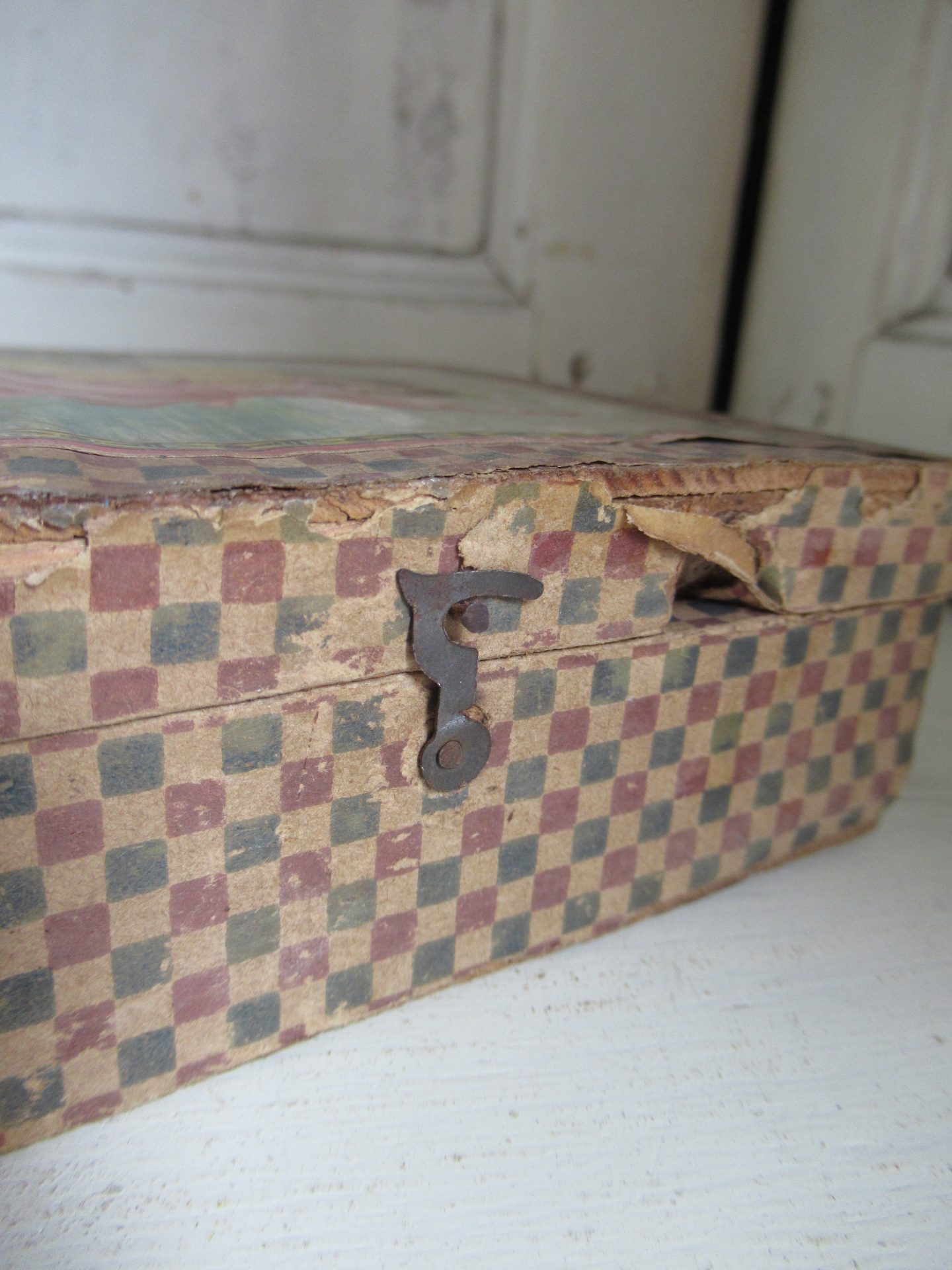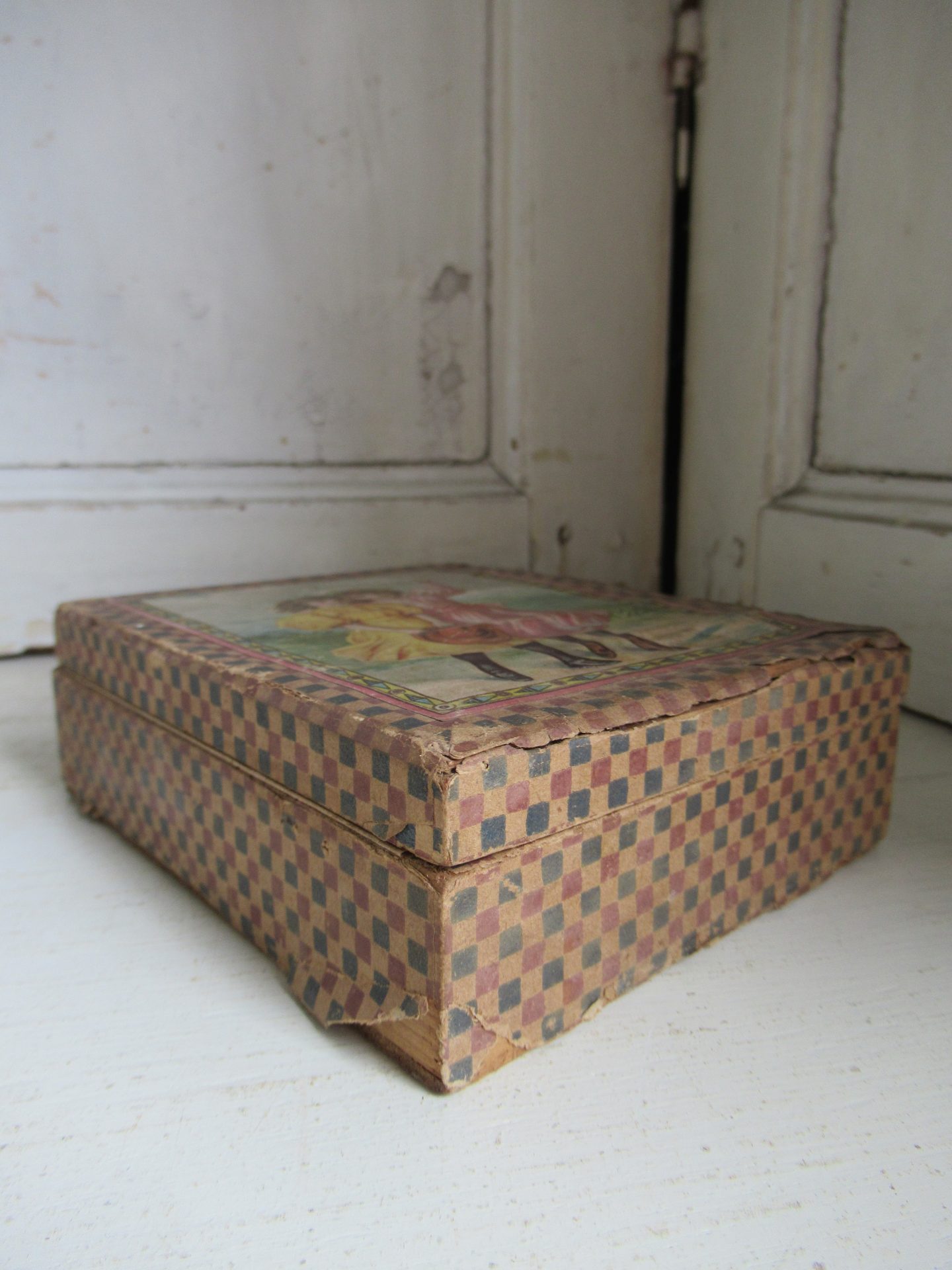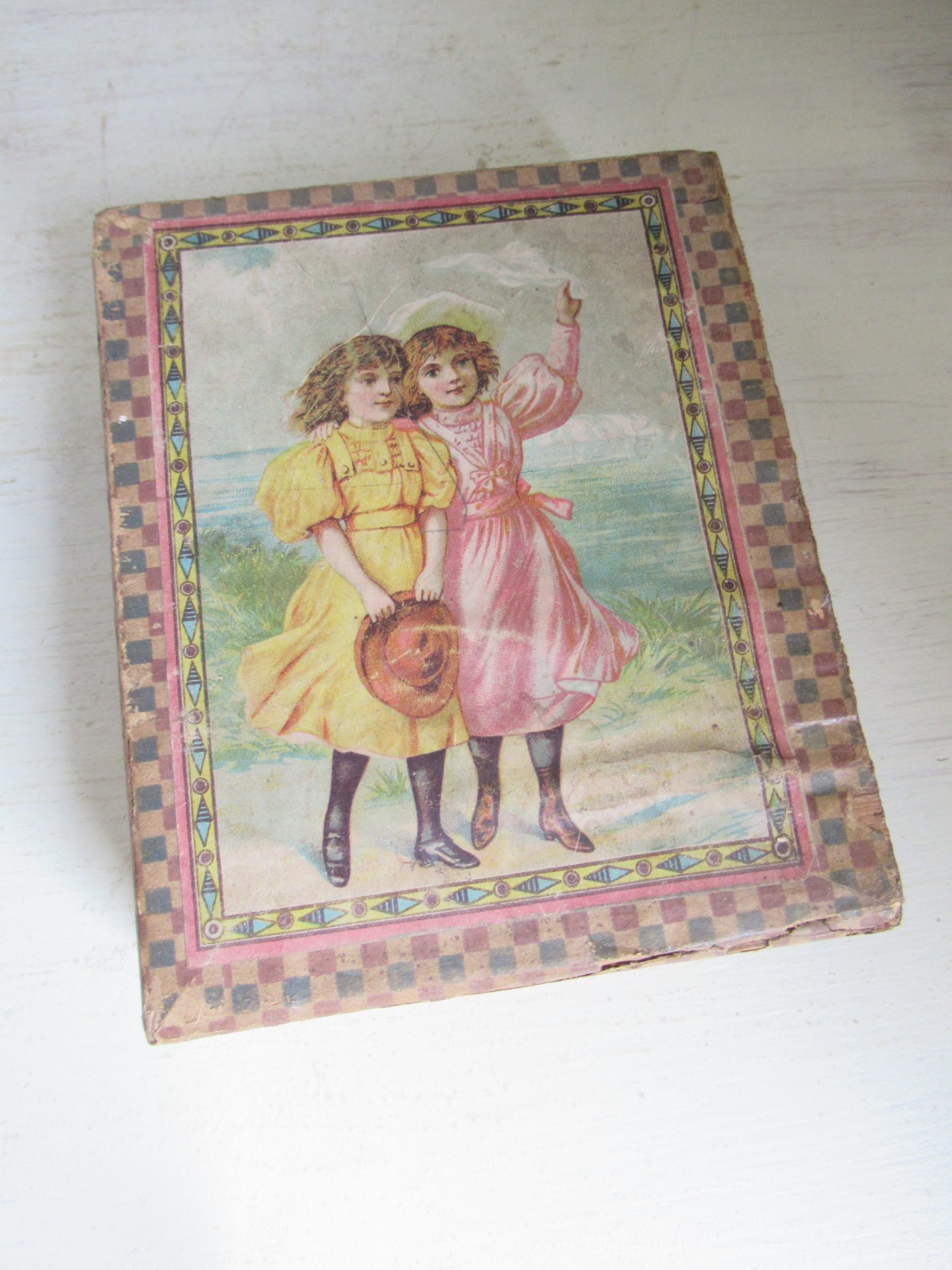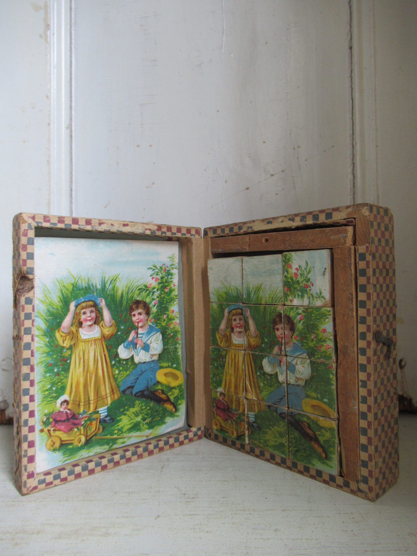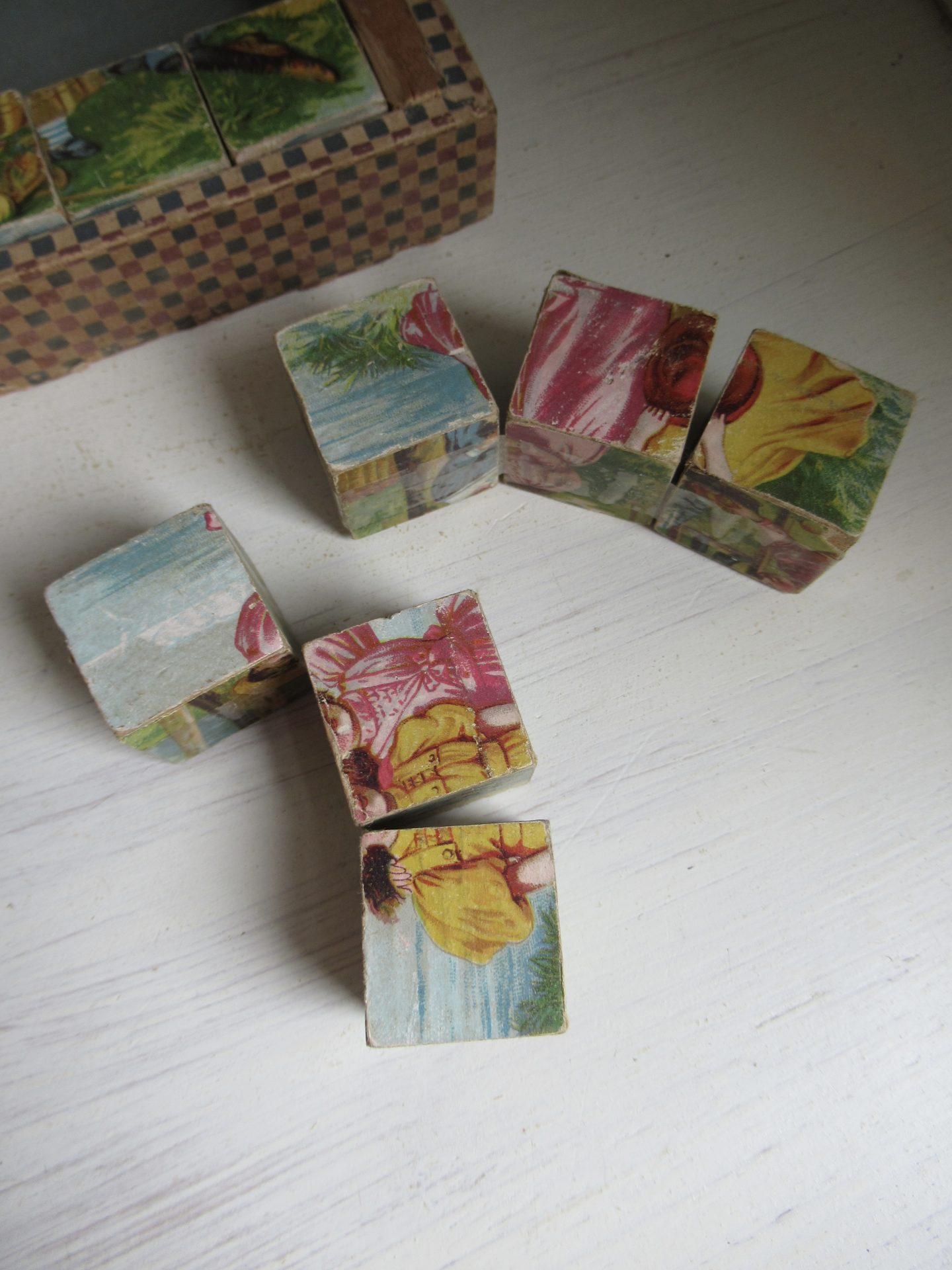heel oud blokkendoosje, ik viel voorla op het doosje, maar toen ik het opende zag ik de blokjespuzzel, de blokjes zijn per 3 aan elkaar geplakt met plakband, dat lijkt me niet helemaal de bedoeling, omdat de achterkanten dan niet bij elkaar passen (14 bij 11,5 cm, hoogte 4,5 cm)