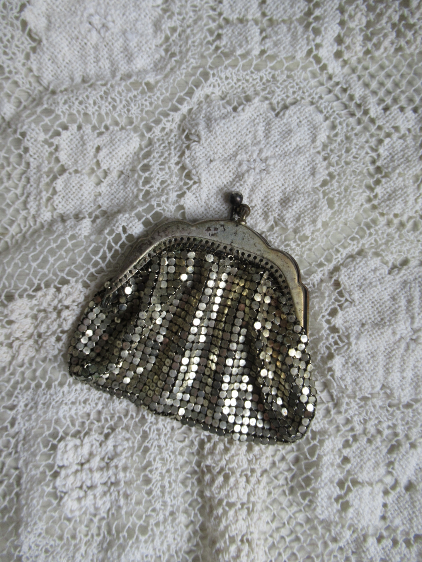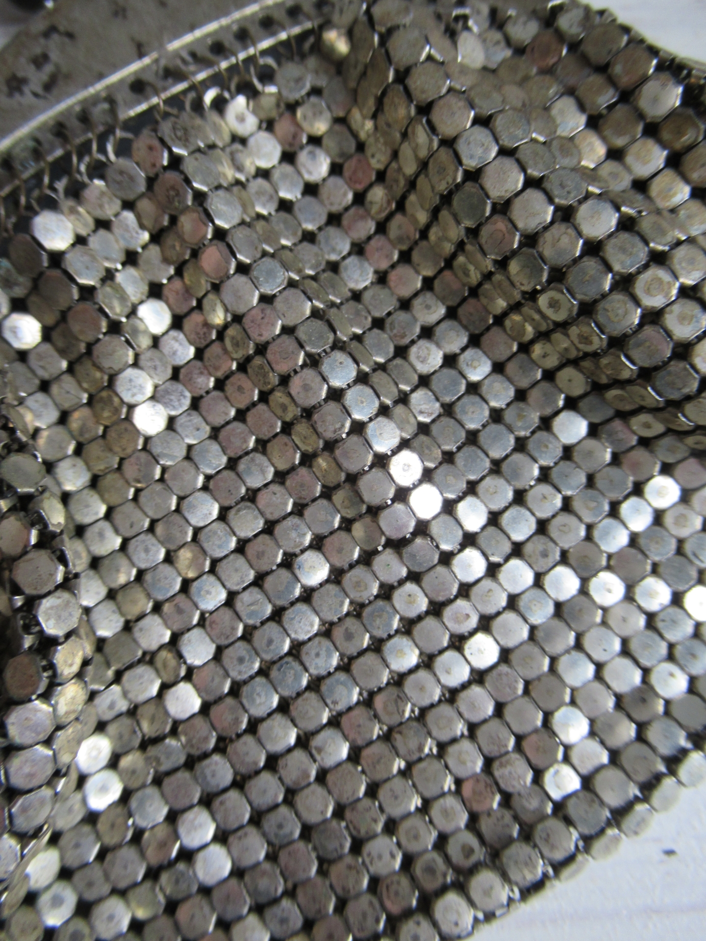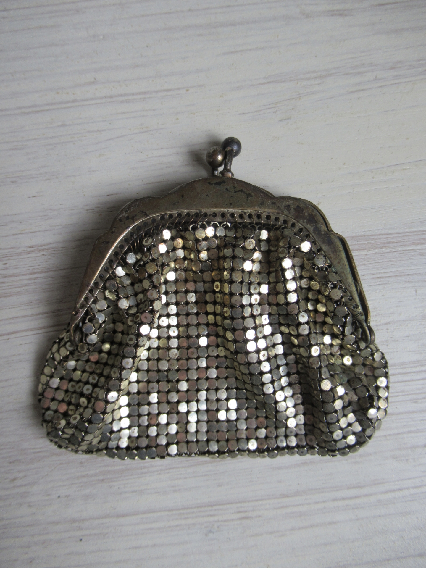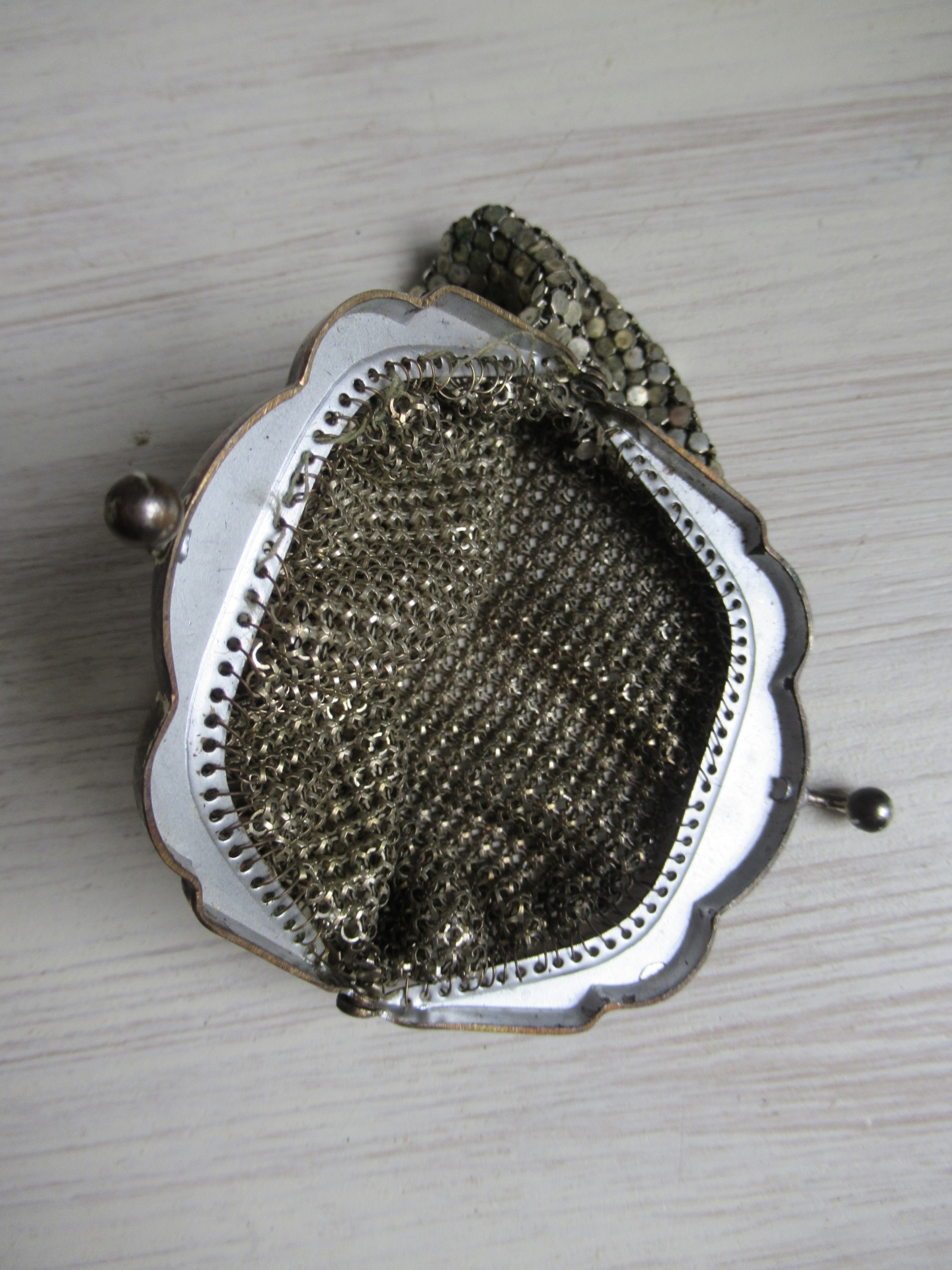 klein oud beursje, allemaal kleine metalen pailletjes, sluit goed, maar de sluiting is wel een beetje krom, misschien te verhelpen, maar in ieder geval niet storend (10 cm breed en 9 cm hoog)