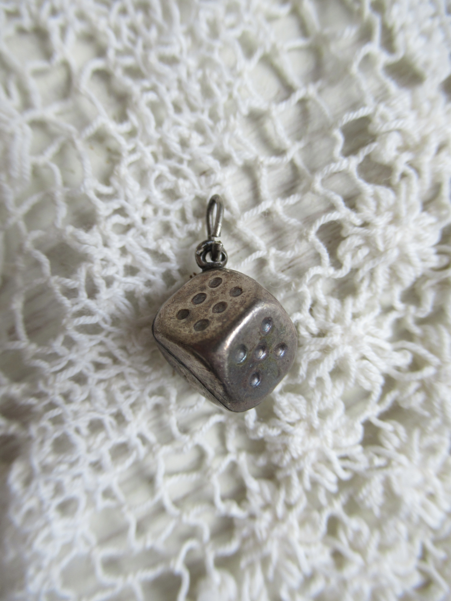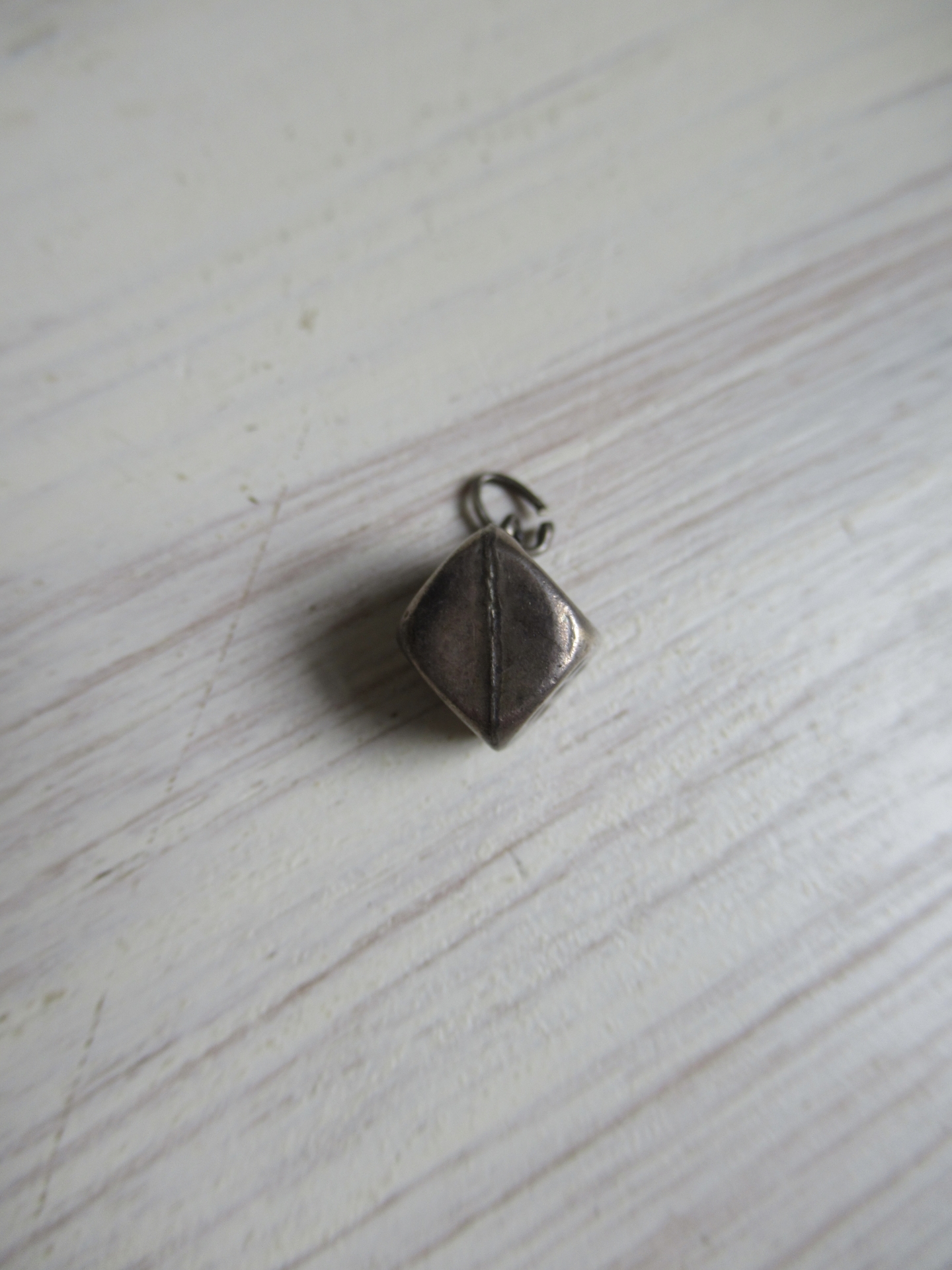 klein oud hangertje, bedeltje, dobbelsteen, zilver? (1 bij 1 cm)