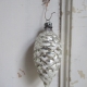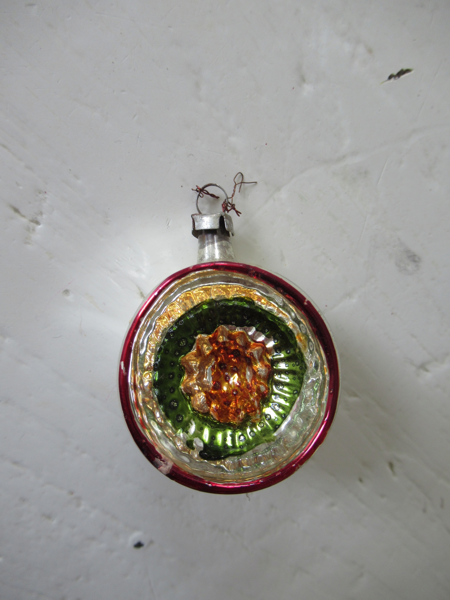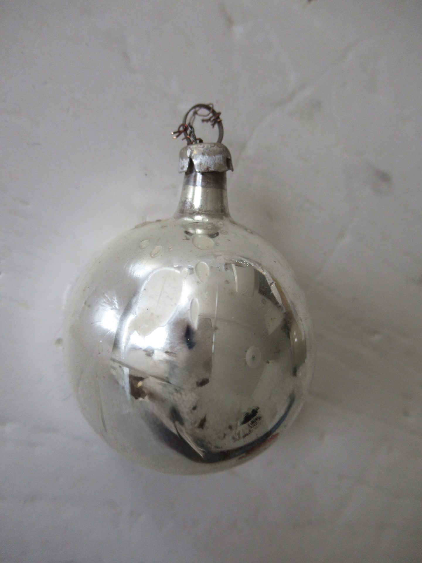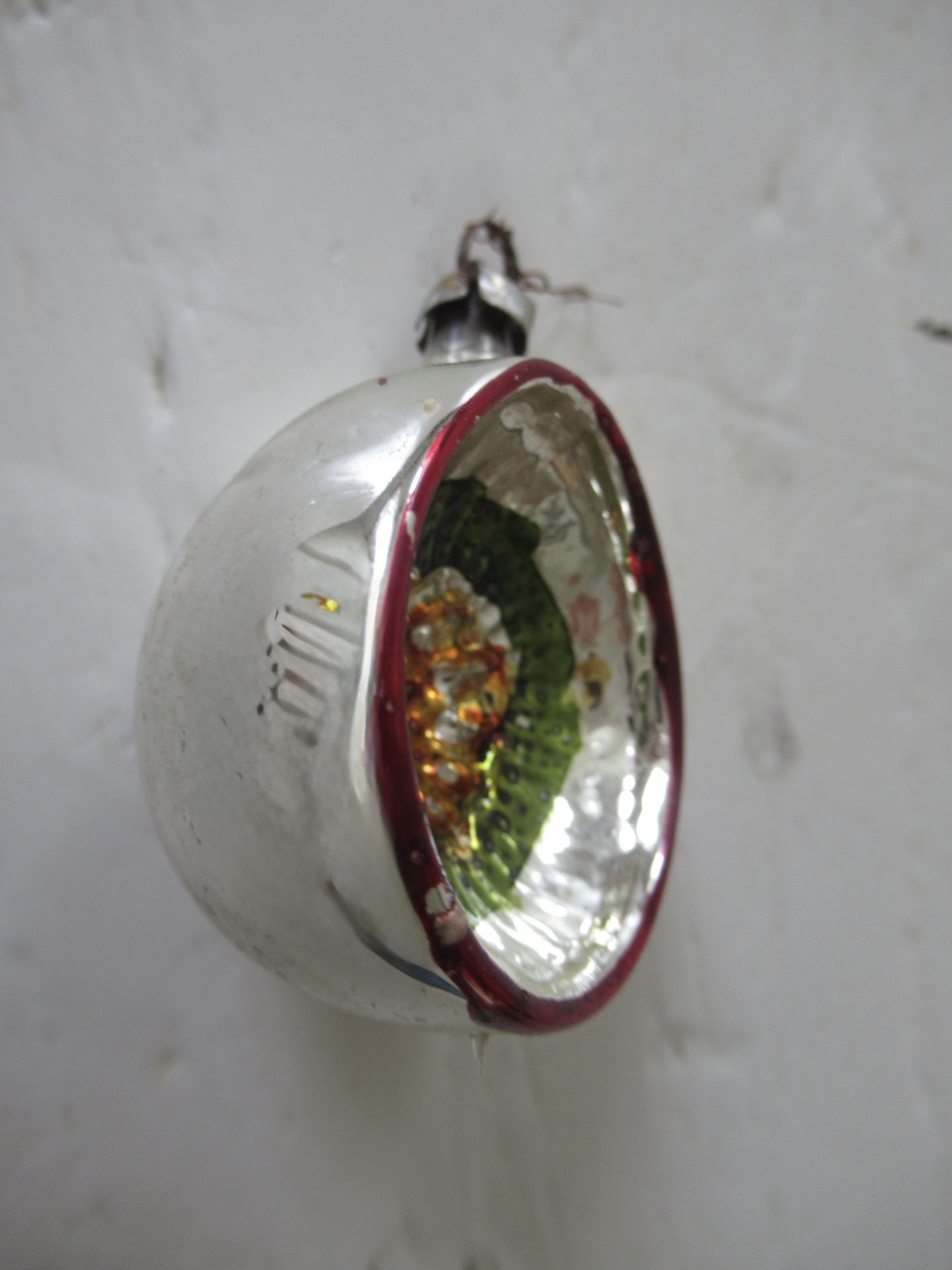 klein oud kerstballetje, deukbal, zilverkleurig met rood, goud en groen (doorsnede ongeveer 4 cm)