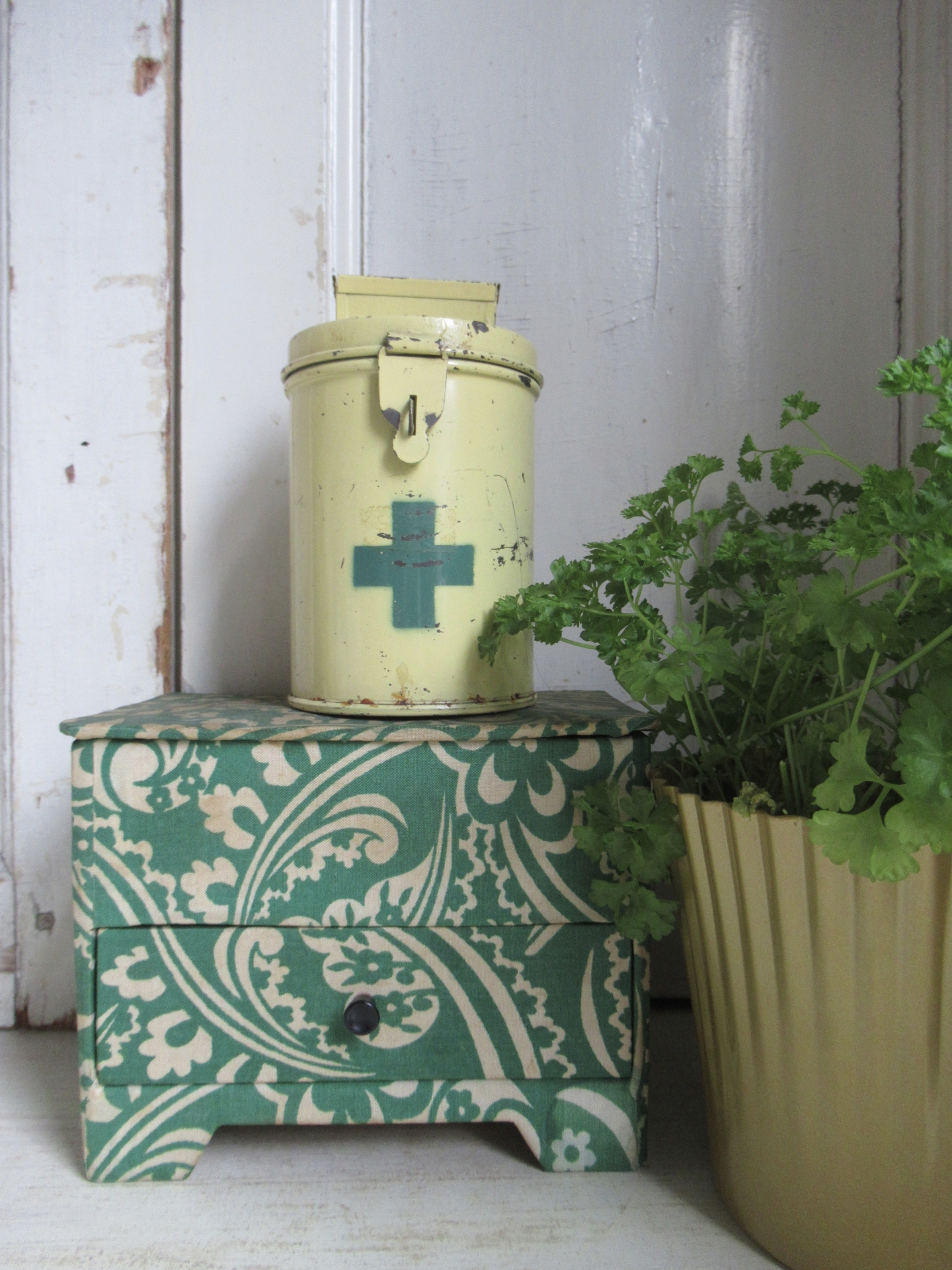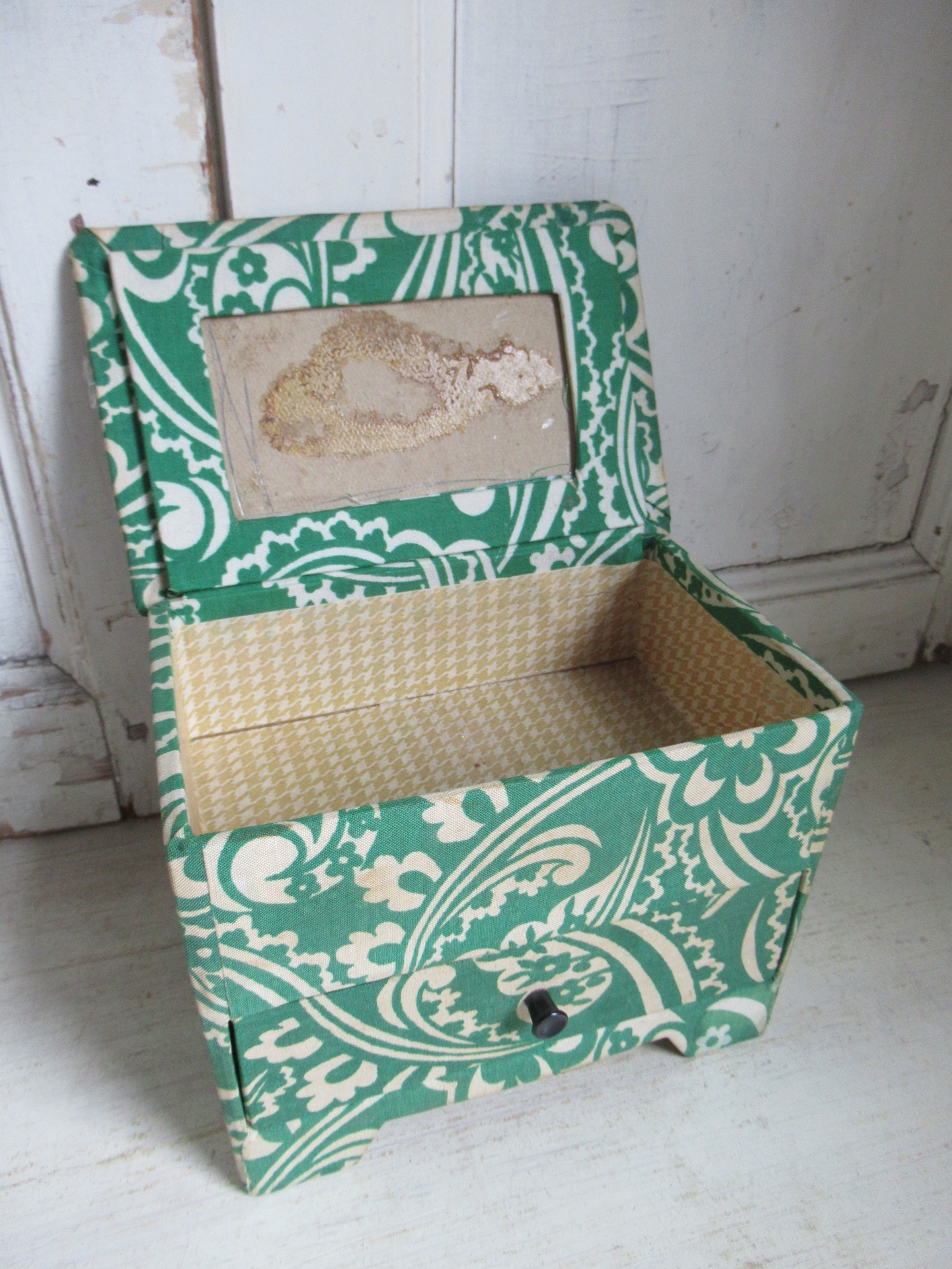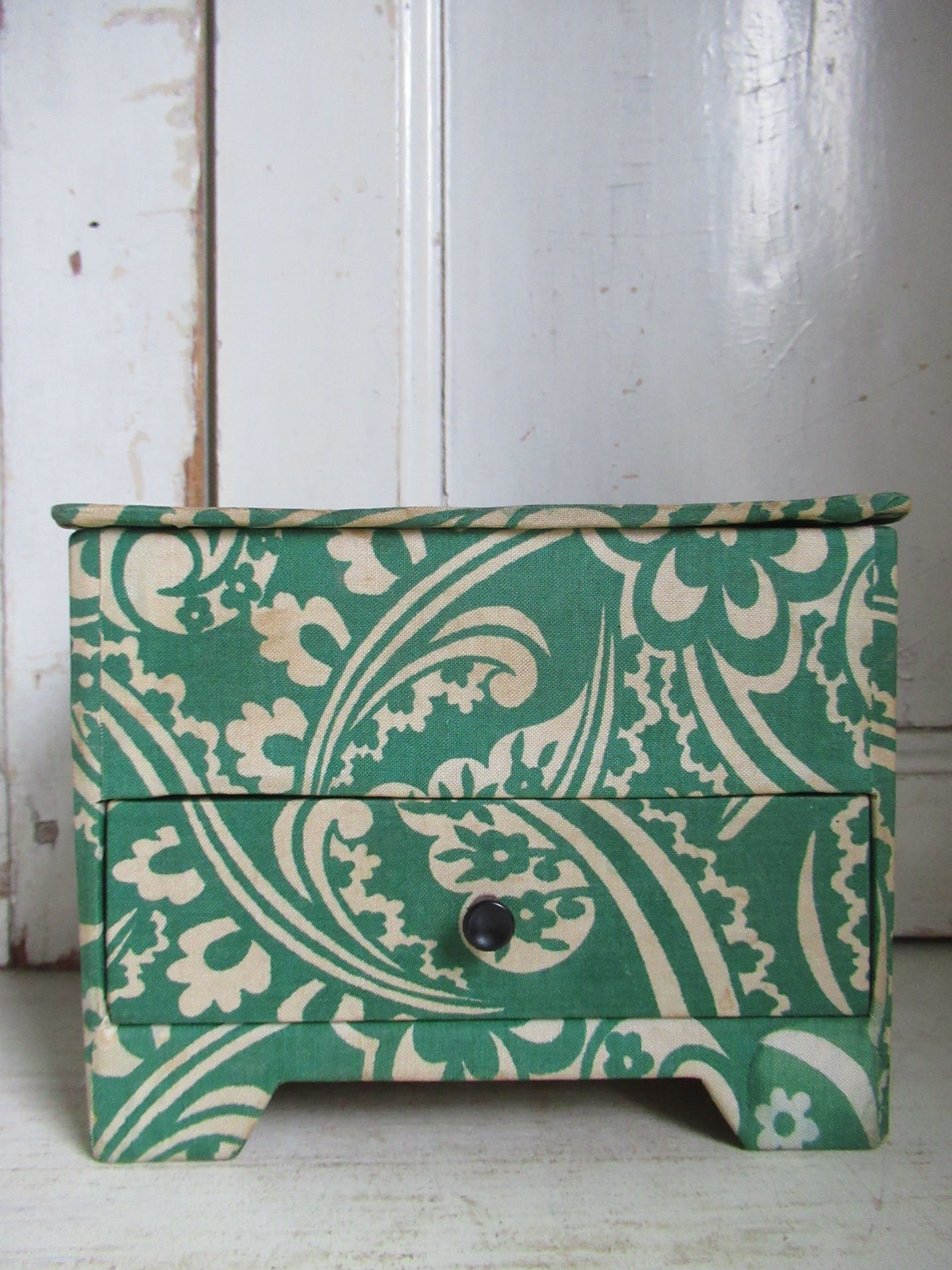 klein oud stoffen ladenkastje, leuk model heeft een lade en de deksel kan open, daar heeft oorspronkelijk een spiegeltje in geplakt gezeten, dei ontbreekt helaas, bovenkant is een beetje smoezelig (17 bij 11 cm, hoogte 13 cm)
