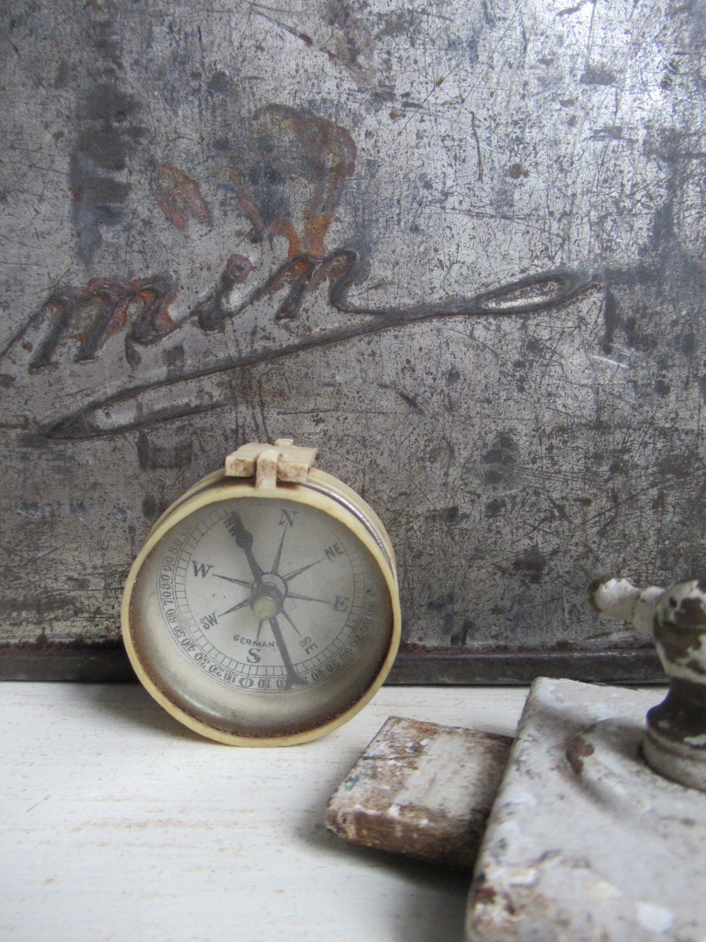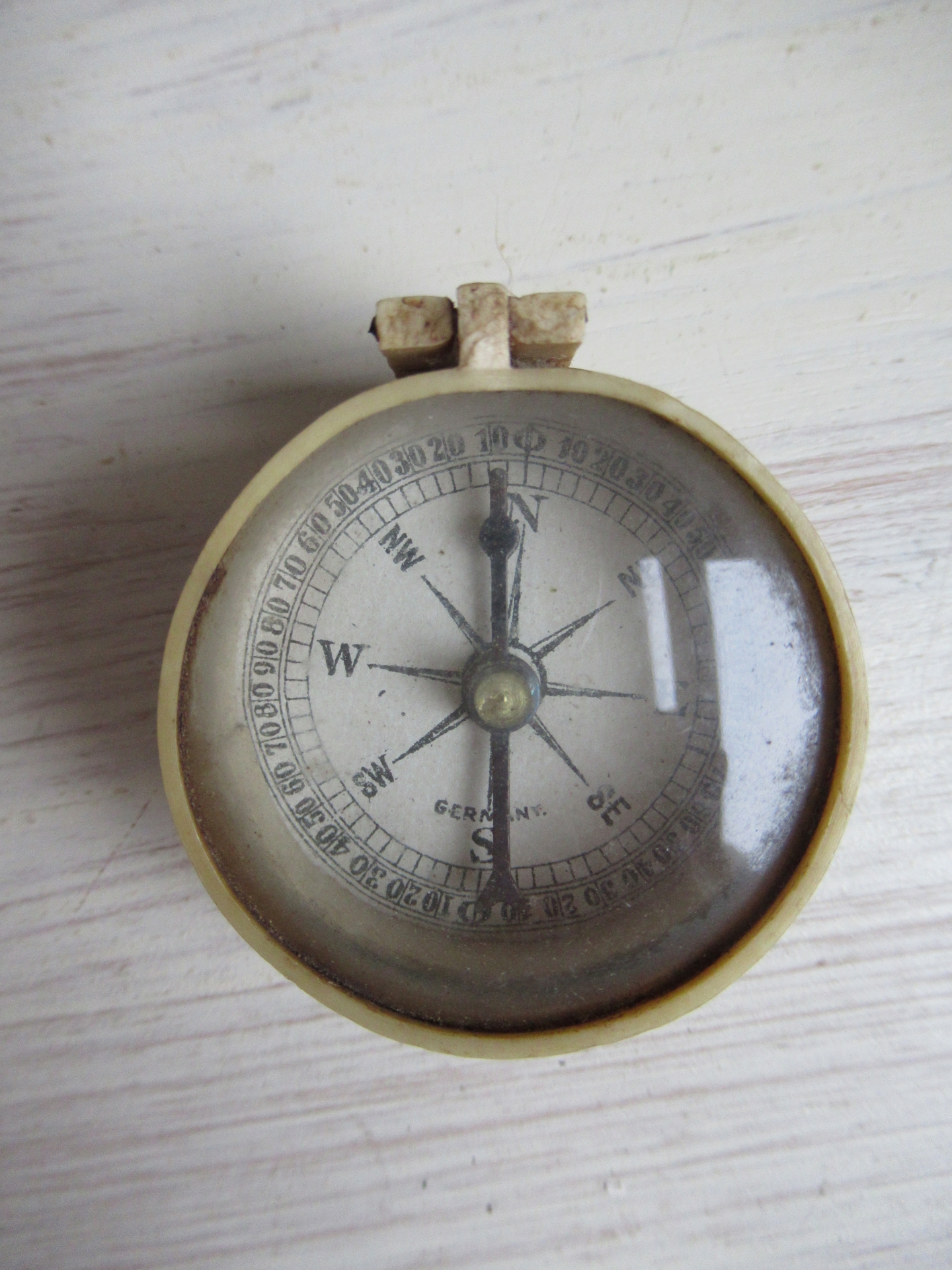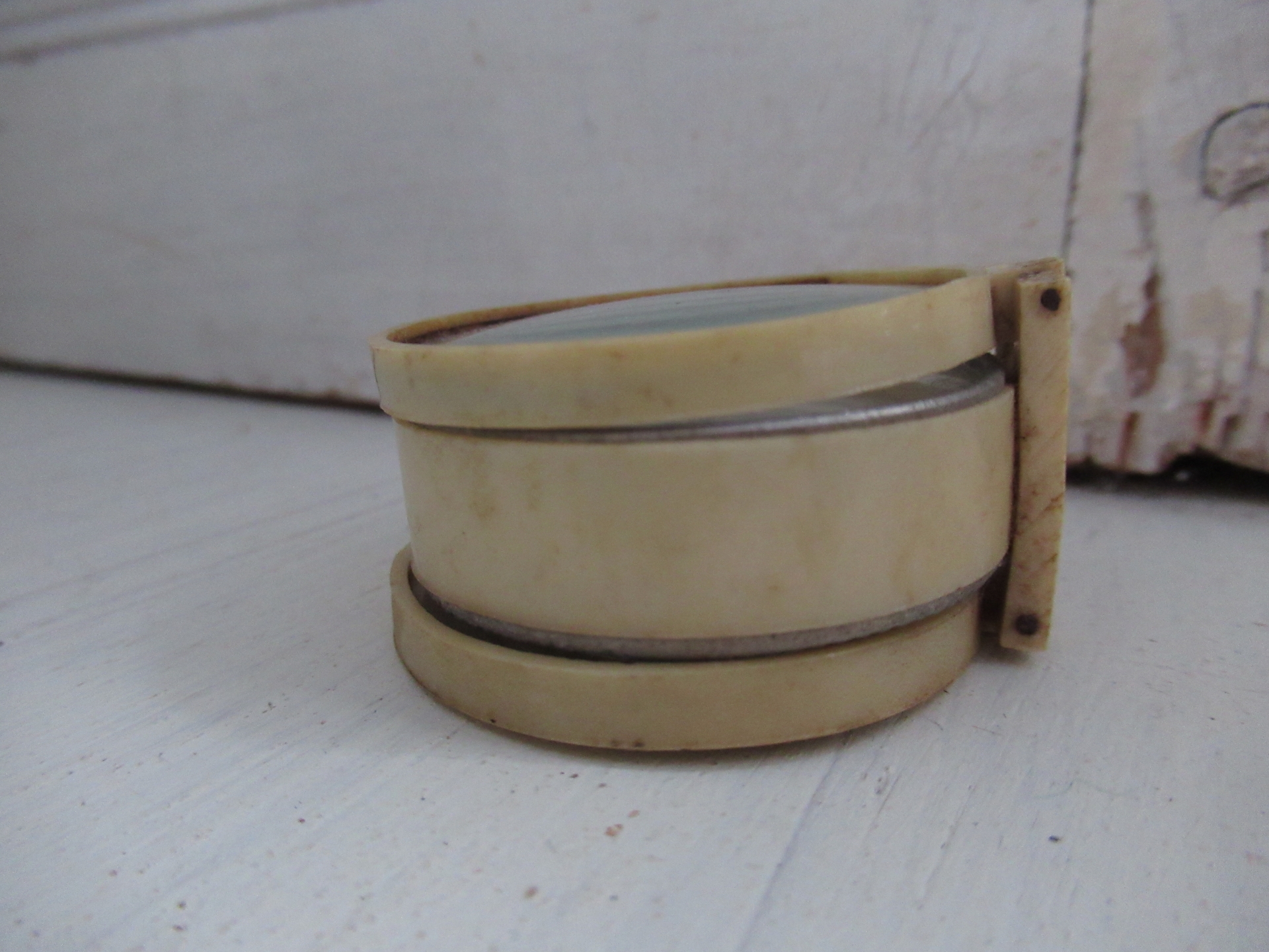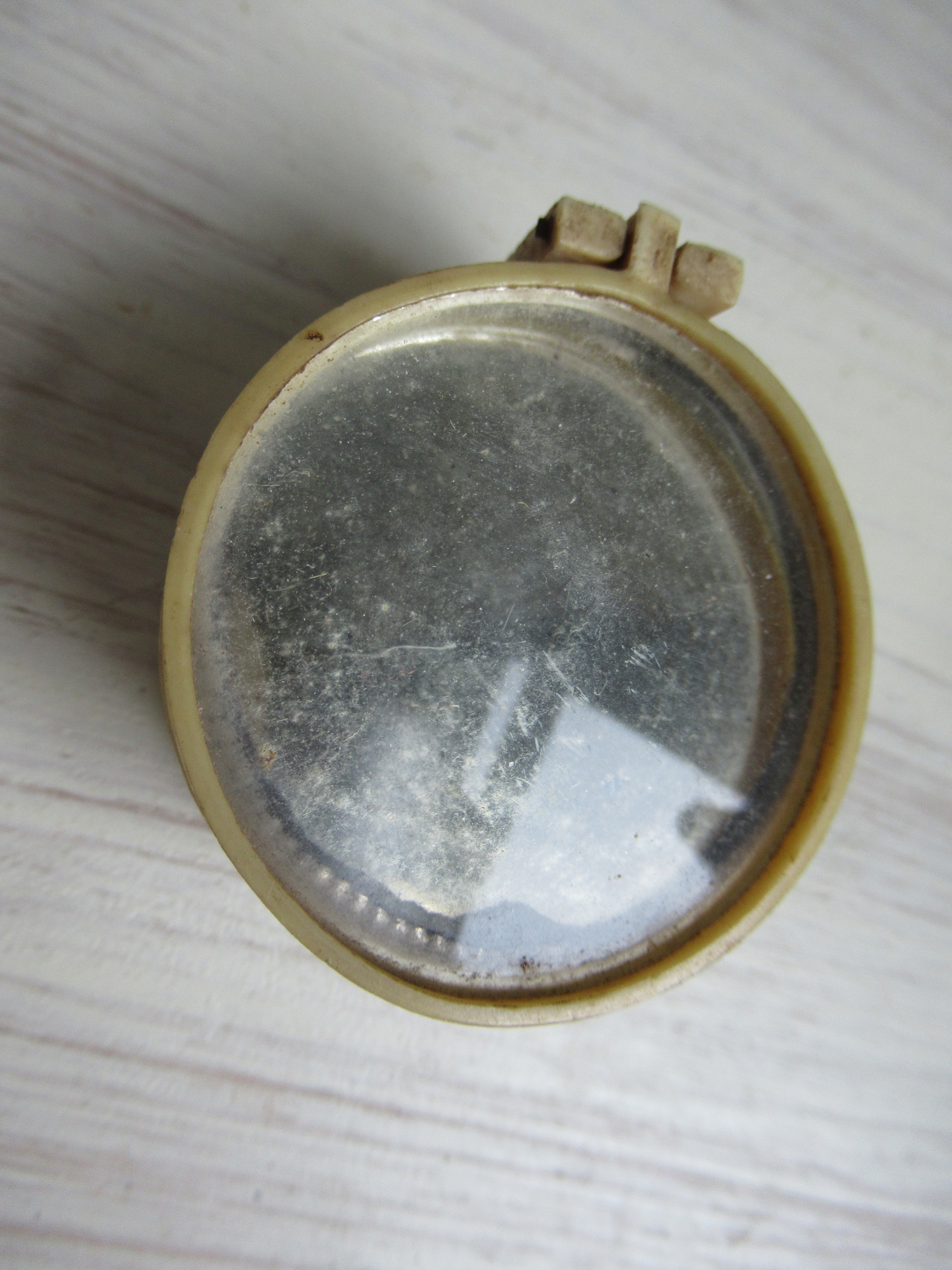 kleine oude kompas, achterkant een klein spiegeltje met vergrootglaasje (doorsnede 4 cm)