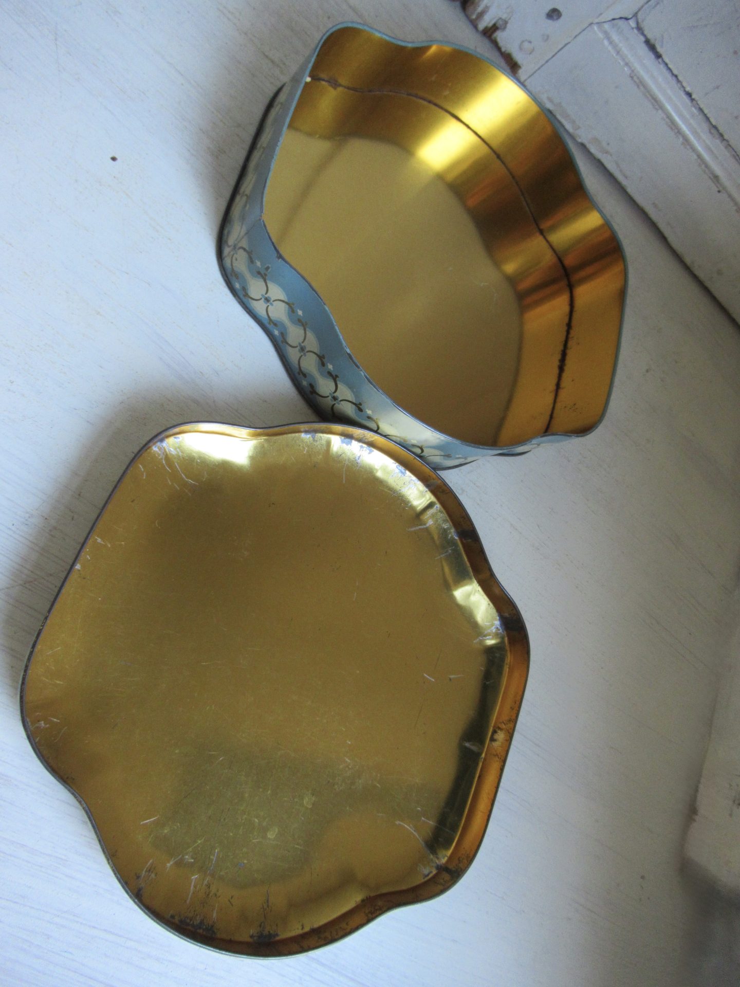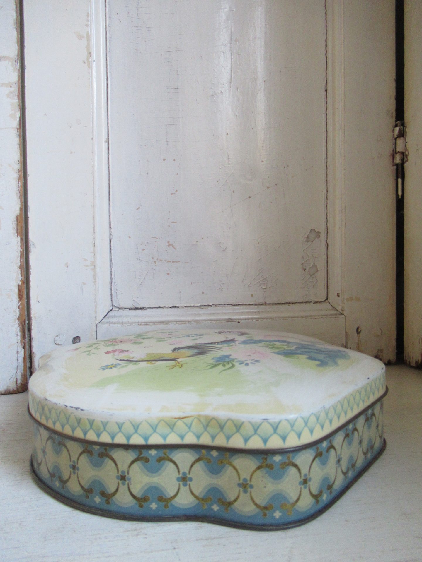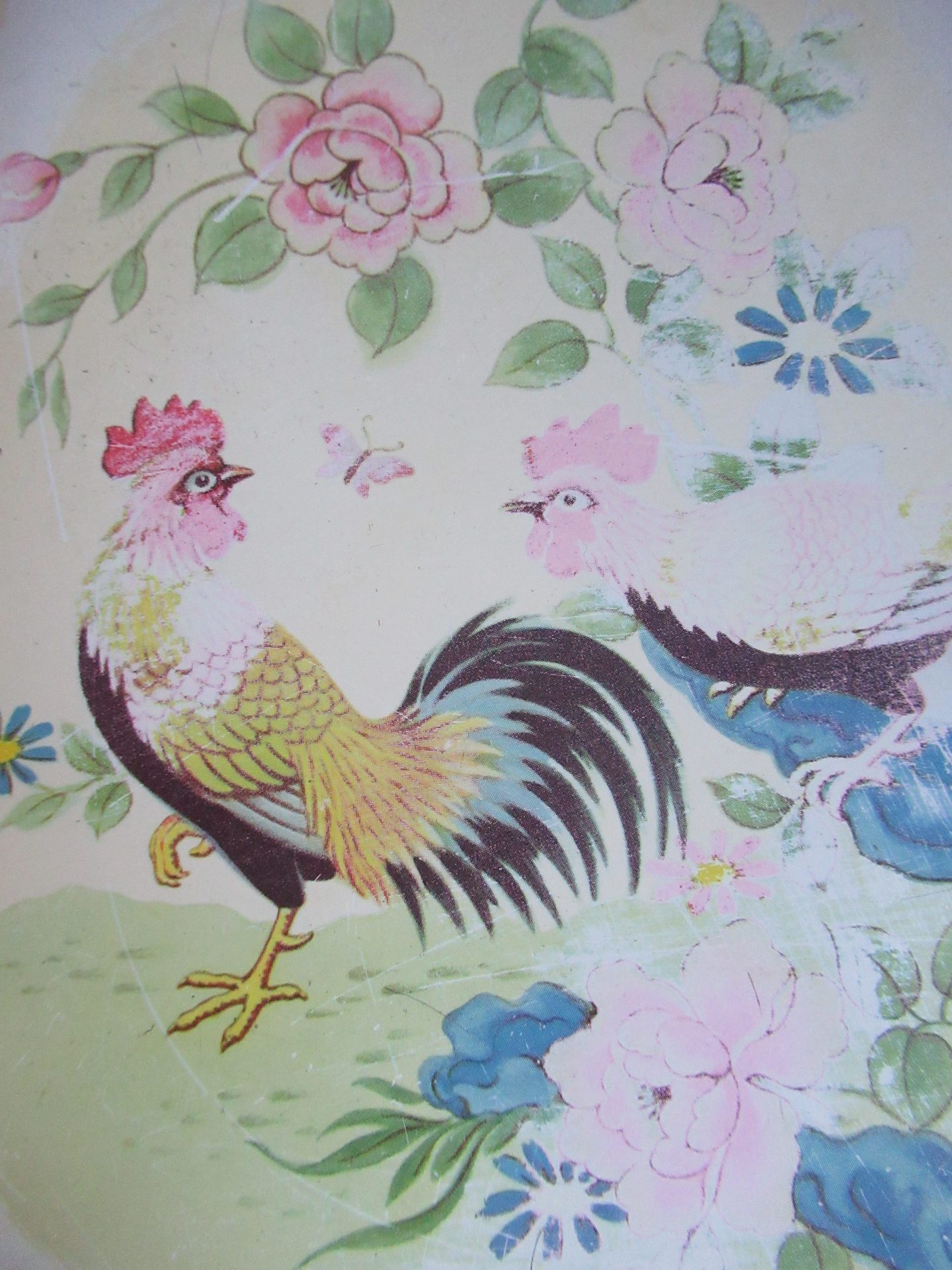 leuk oud blik, pastelkleuren, kippen (22 bij 22 cm, 5 cm hoog)