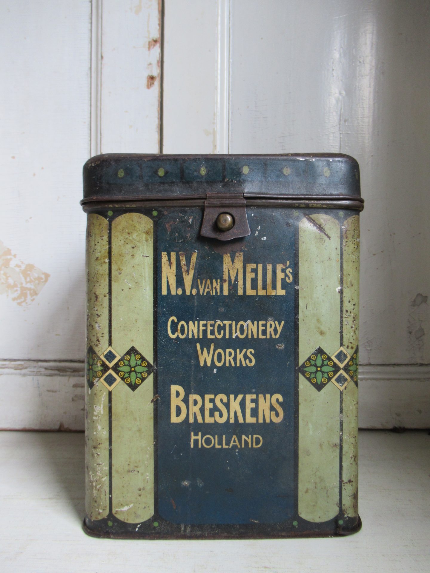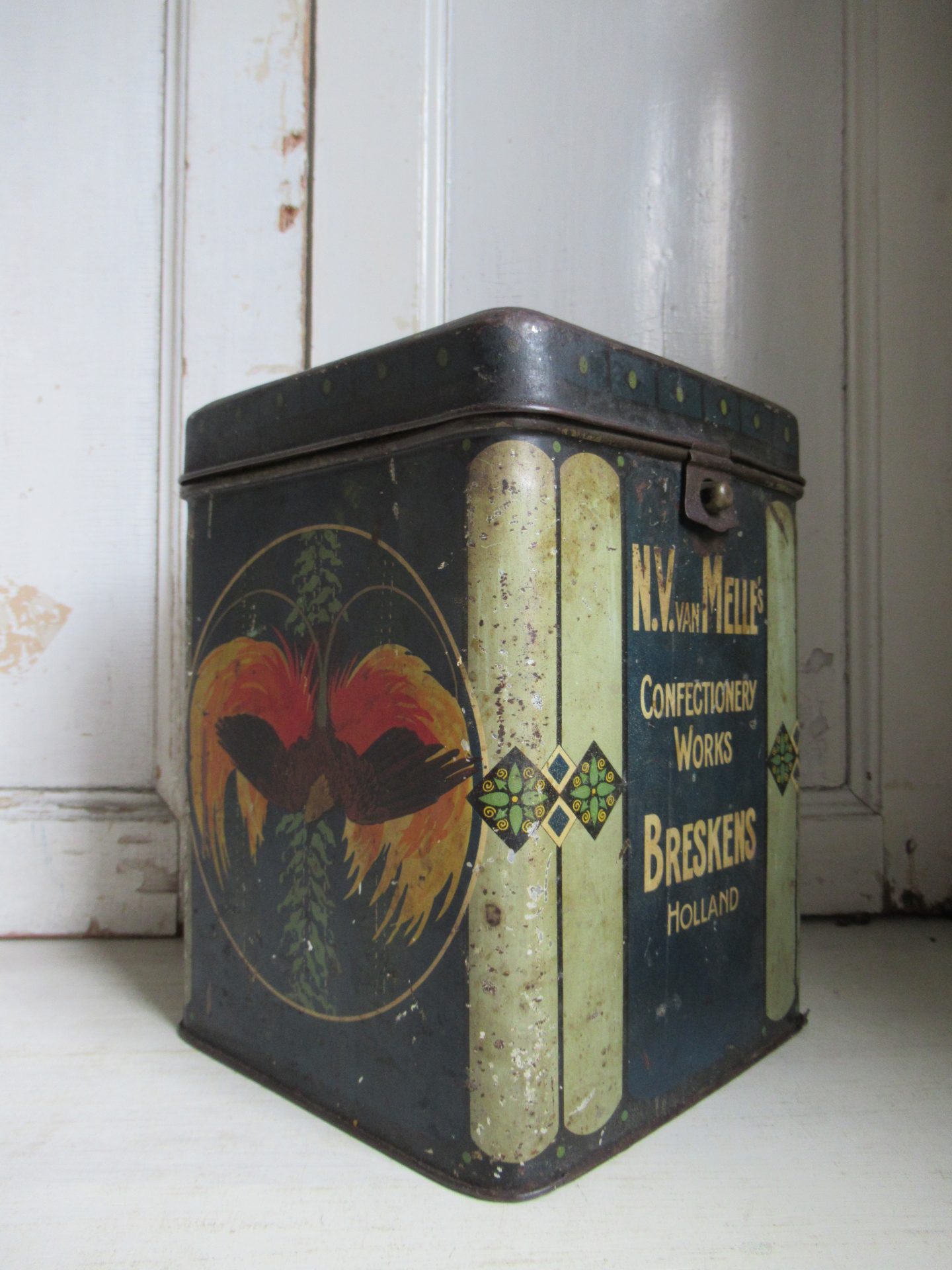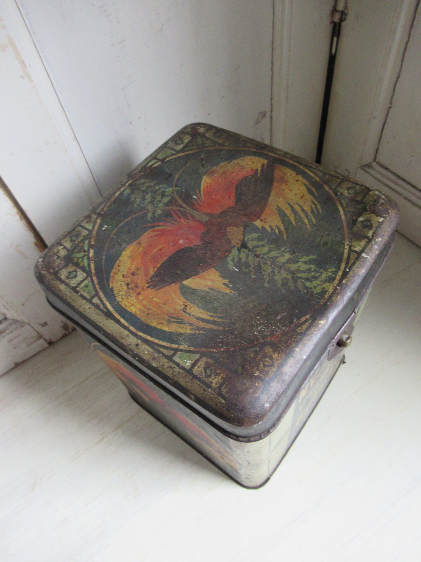 mooi oud blik, deksel is wat donkerder en heeft wat deukjes, scharnieren zijn eraf, maar sluit nog goed (18 bij 18 cm, hoogte 24 cm)