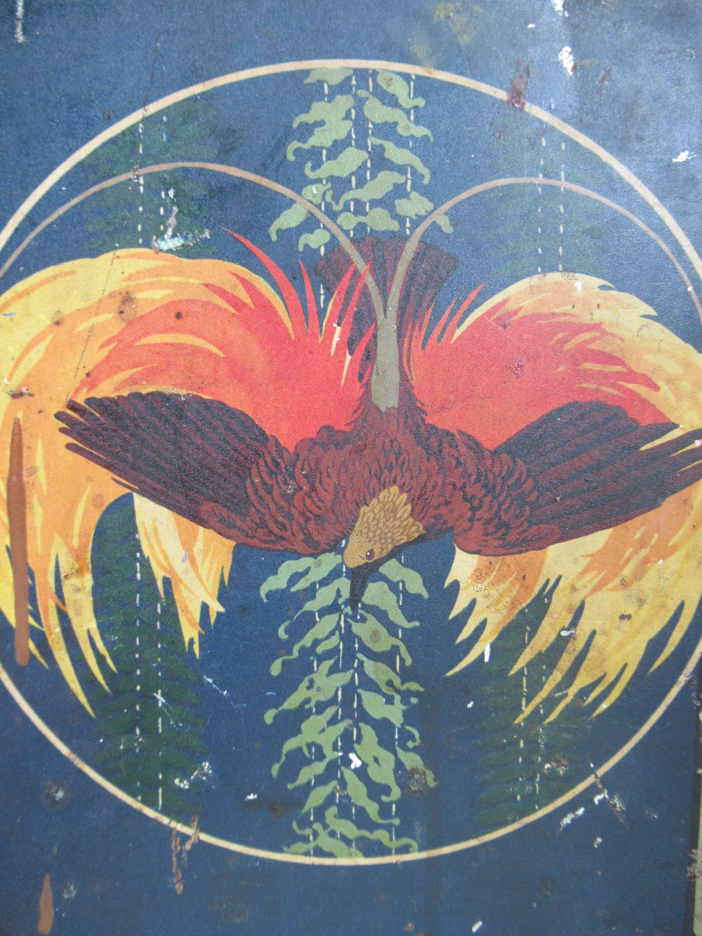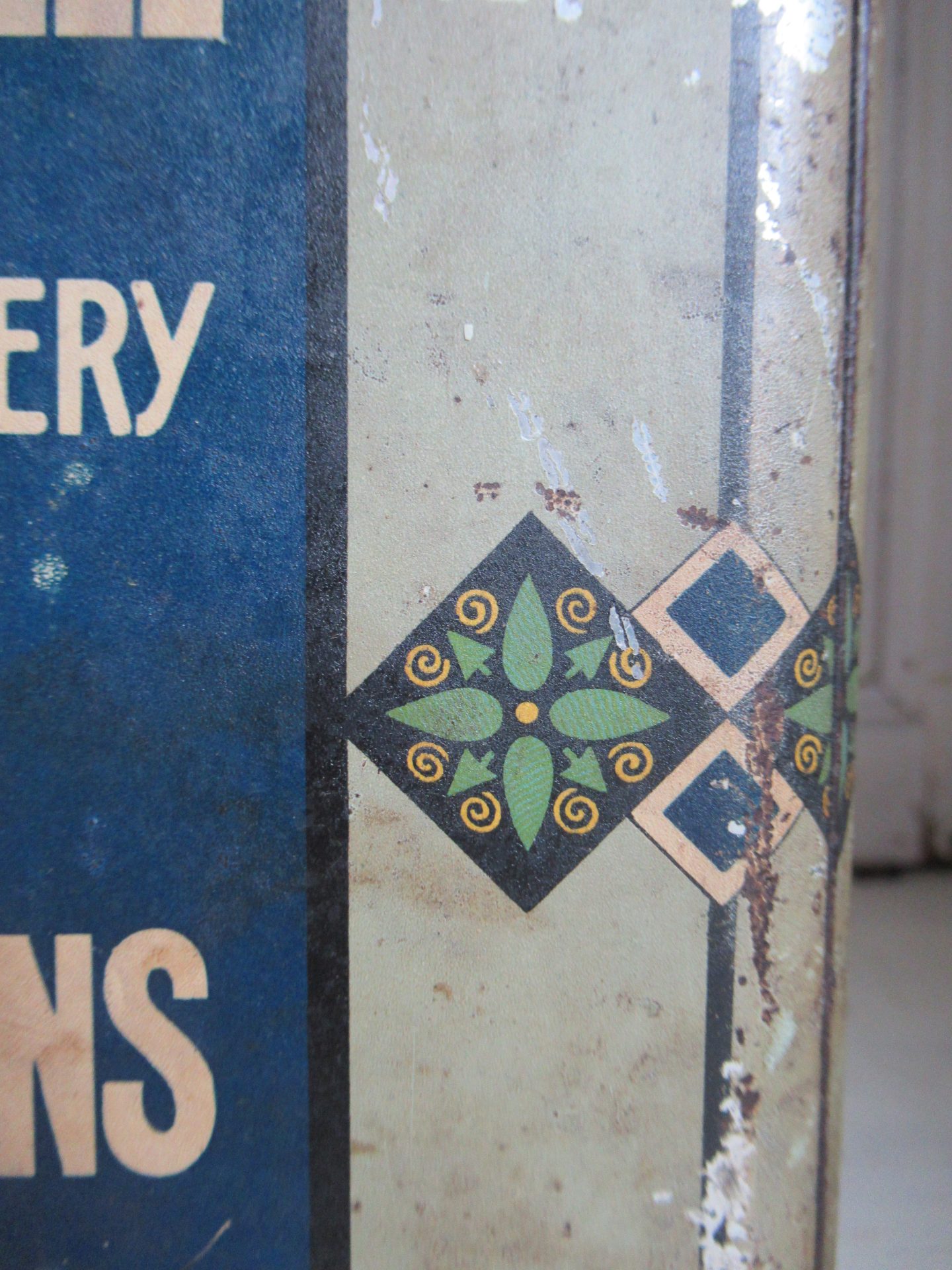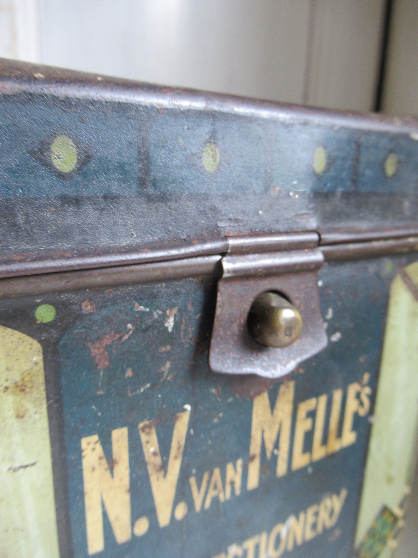 mooi oud blik, deksel is wat donkerder en heeft wat deukjes, scharnieren zijn eraf, maar sluit nog goed (18 bij 18 cm, hoogte 24 cm)