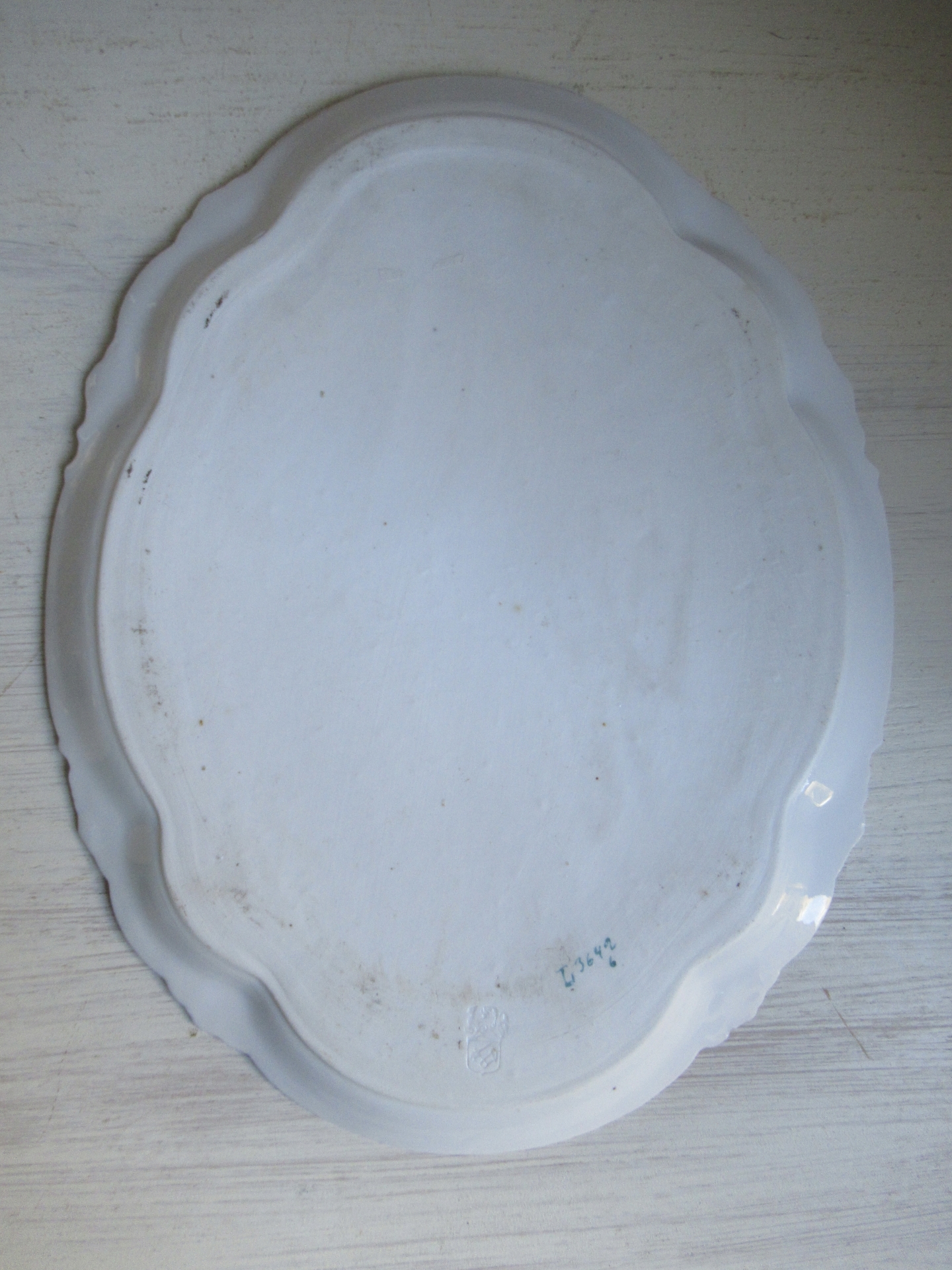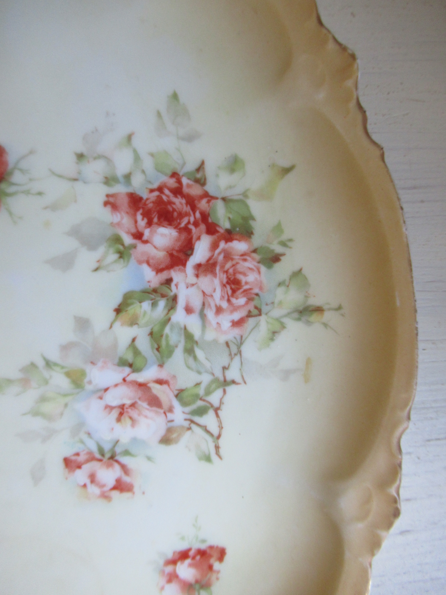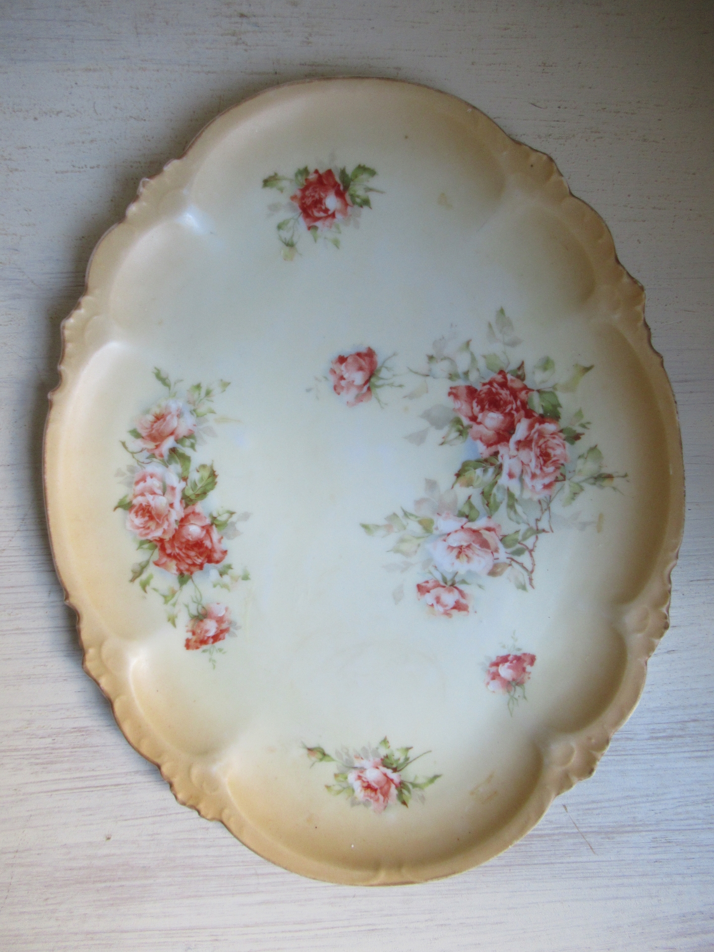 mooie oude Engelse schaal, rozenafbeeldingen en reliëf langs de rand (29,5 bij 23 cm)