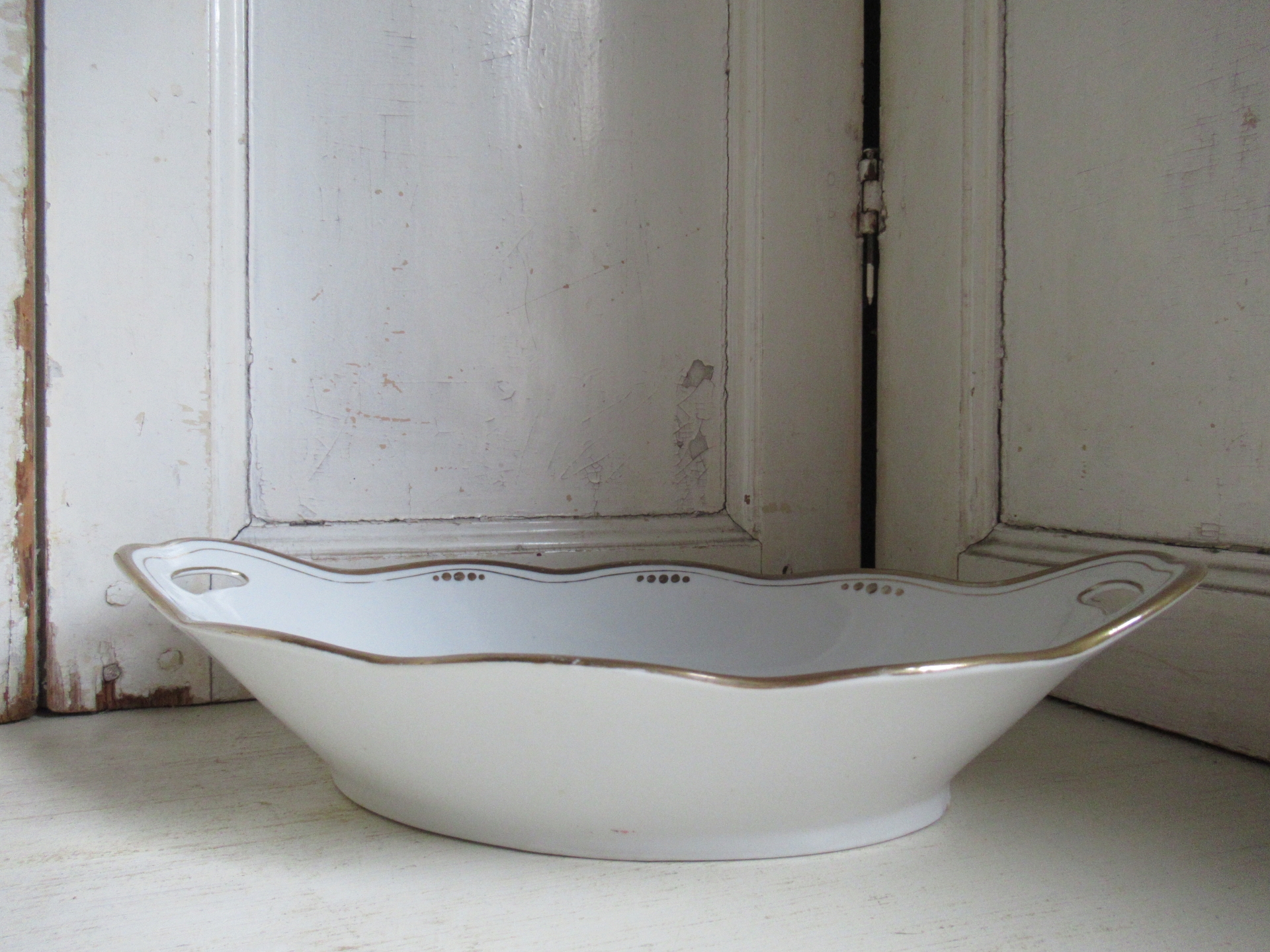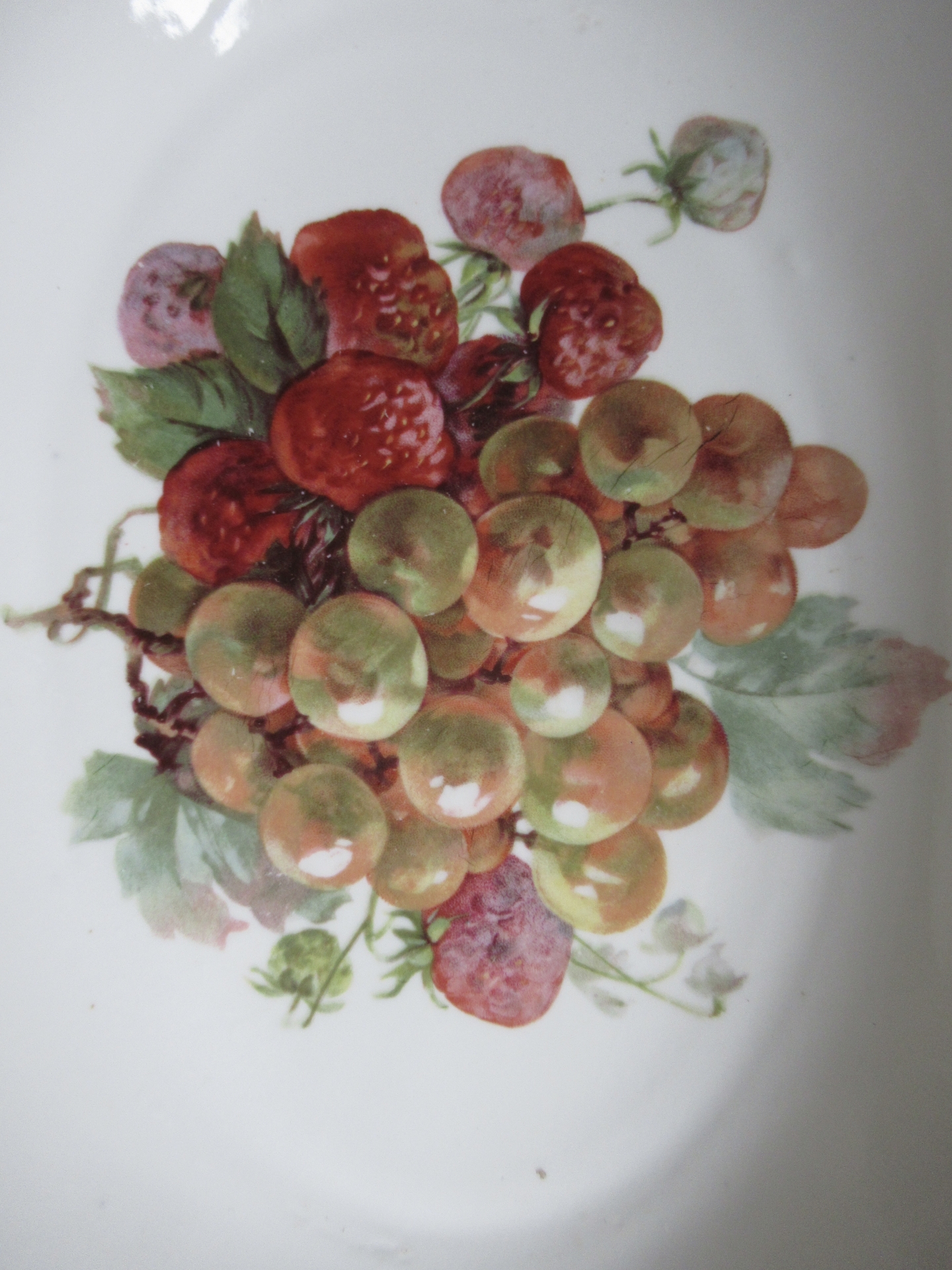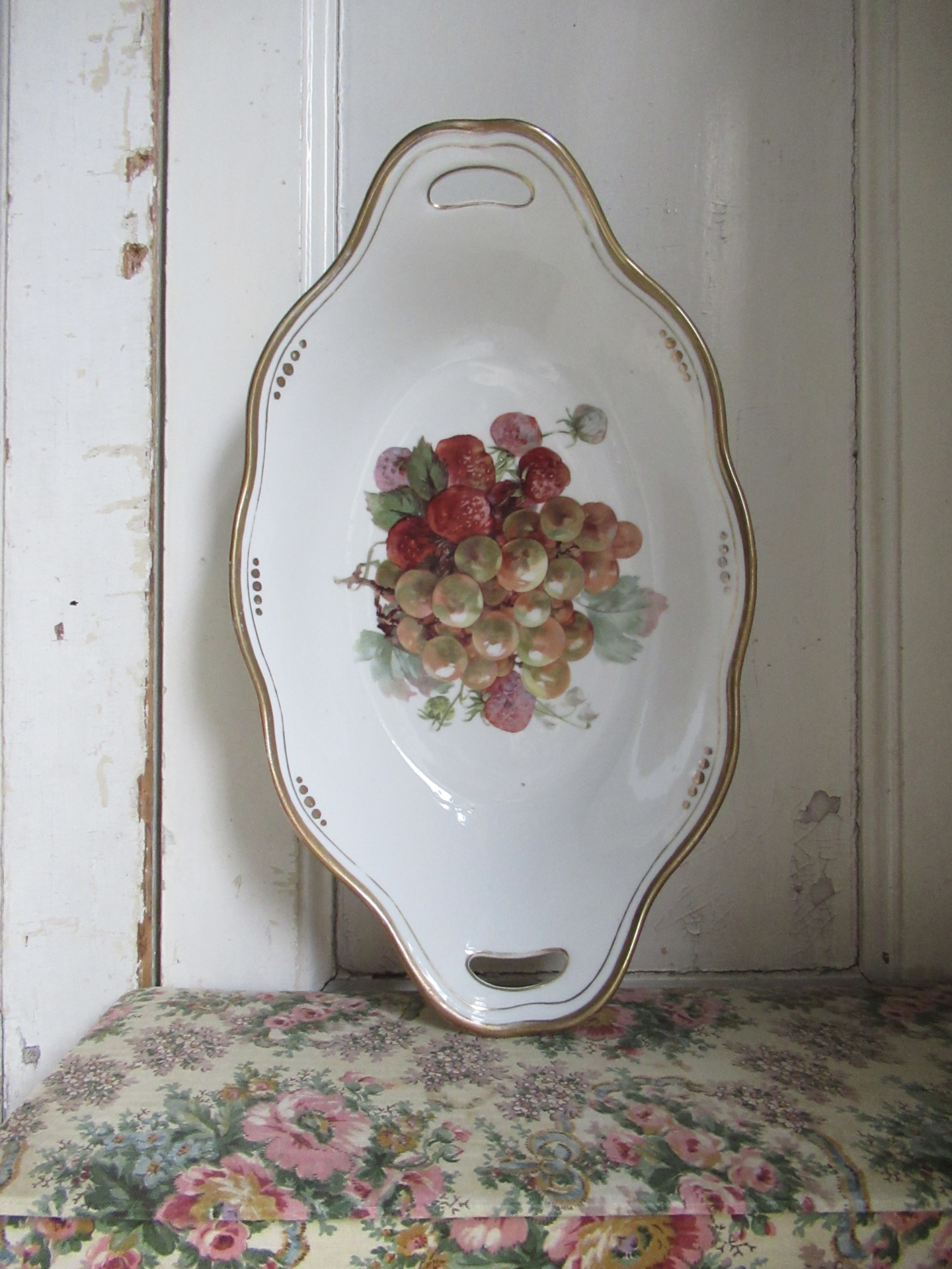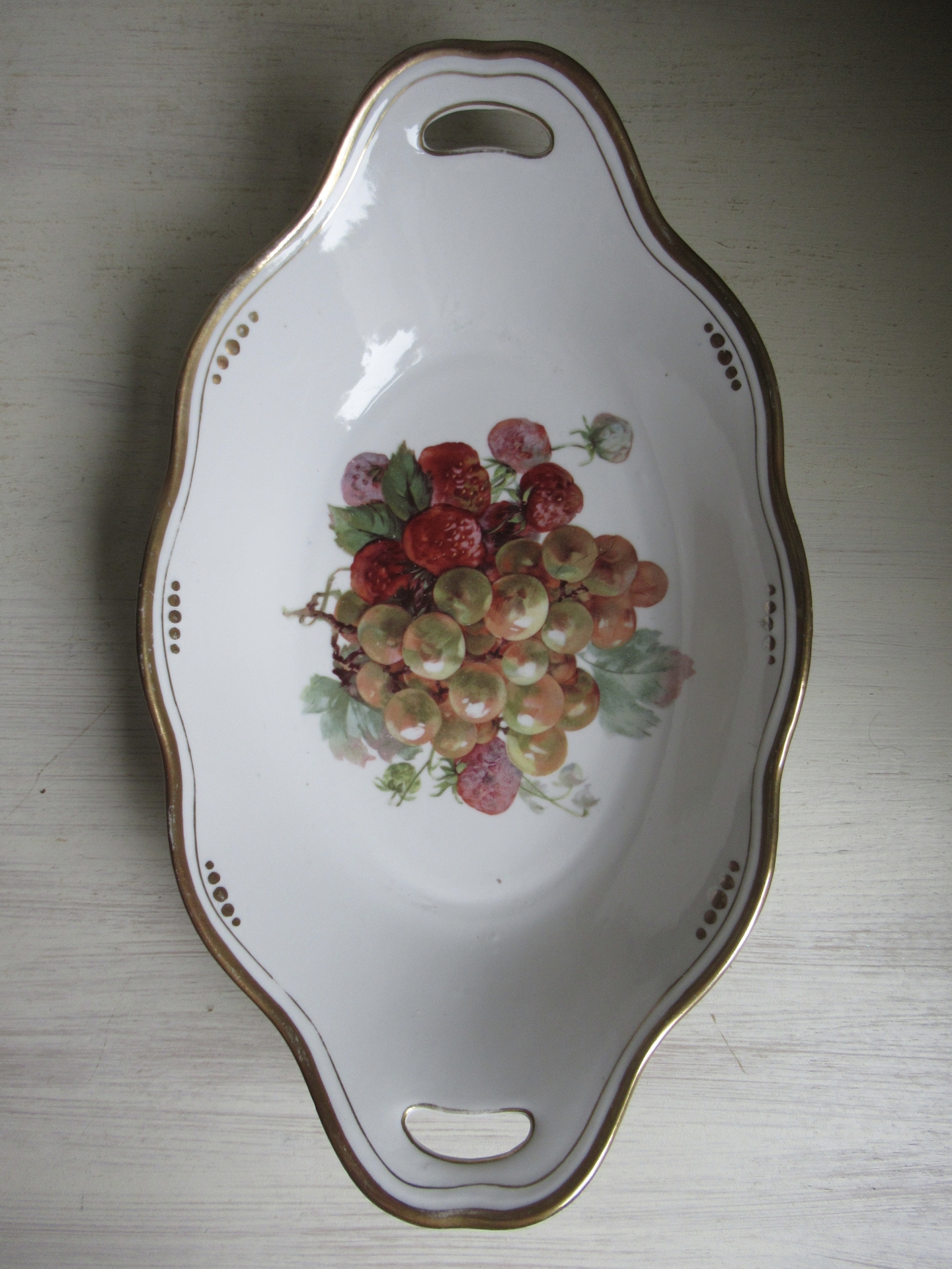 mooie oude schaal, met goudkleurige details en druivenafbeelding, meegenomen uit Frankrijk (33 bij 19,5 cm)