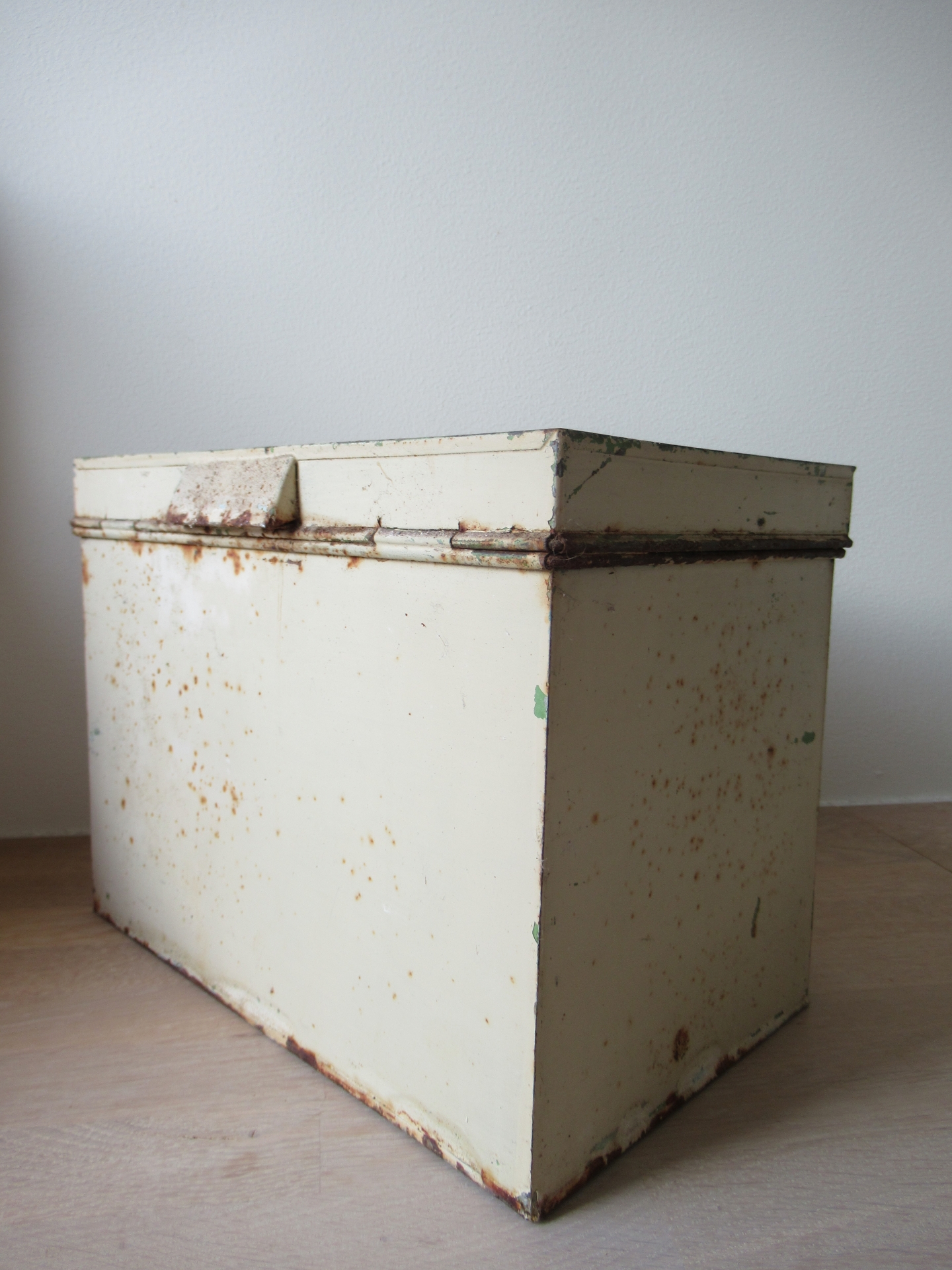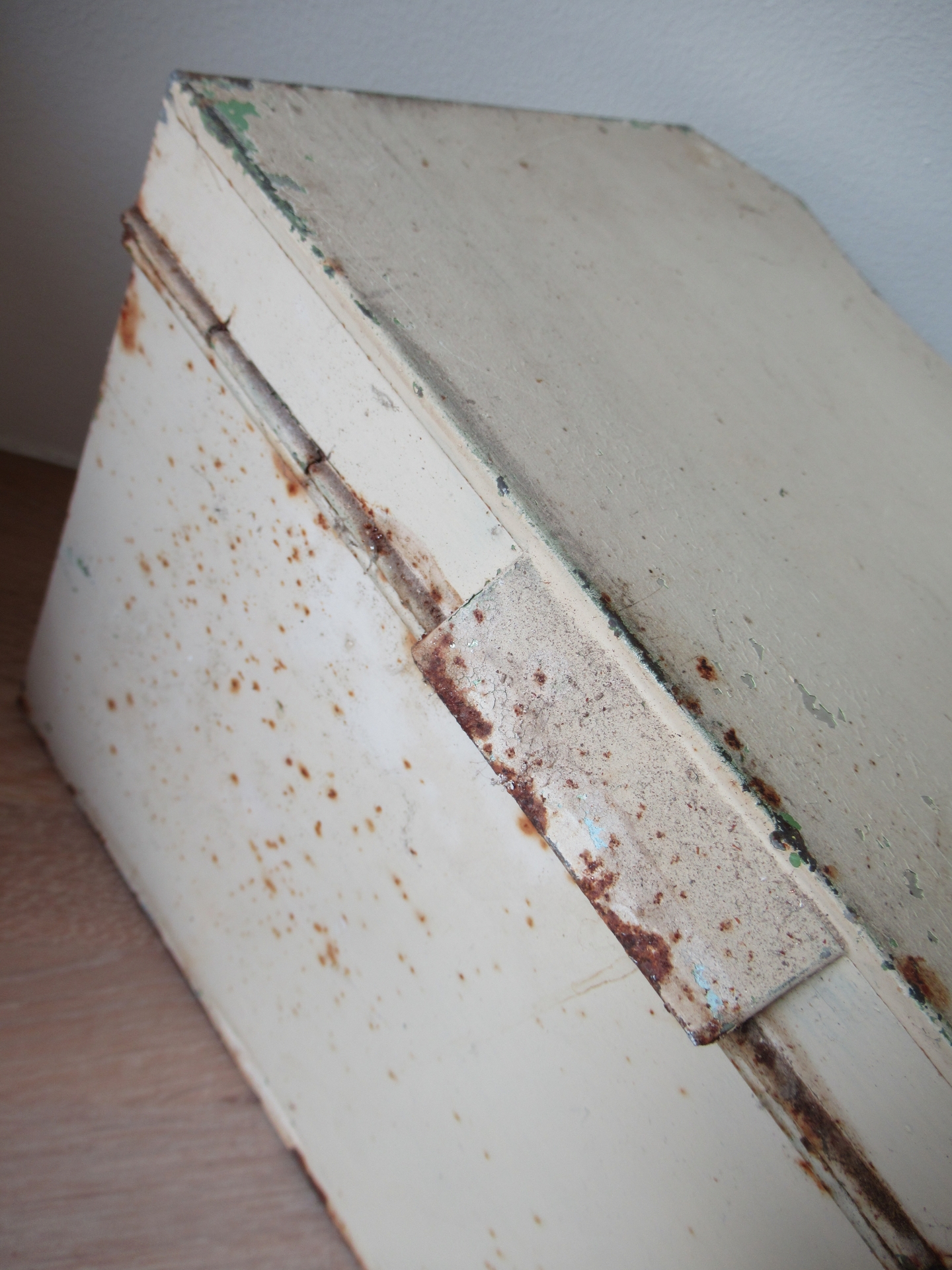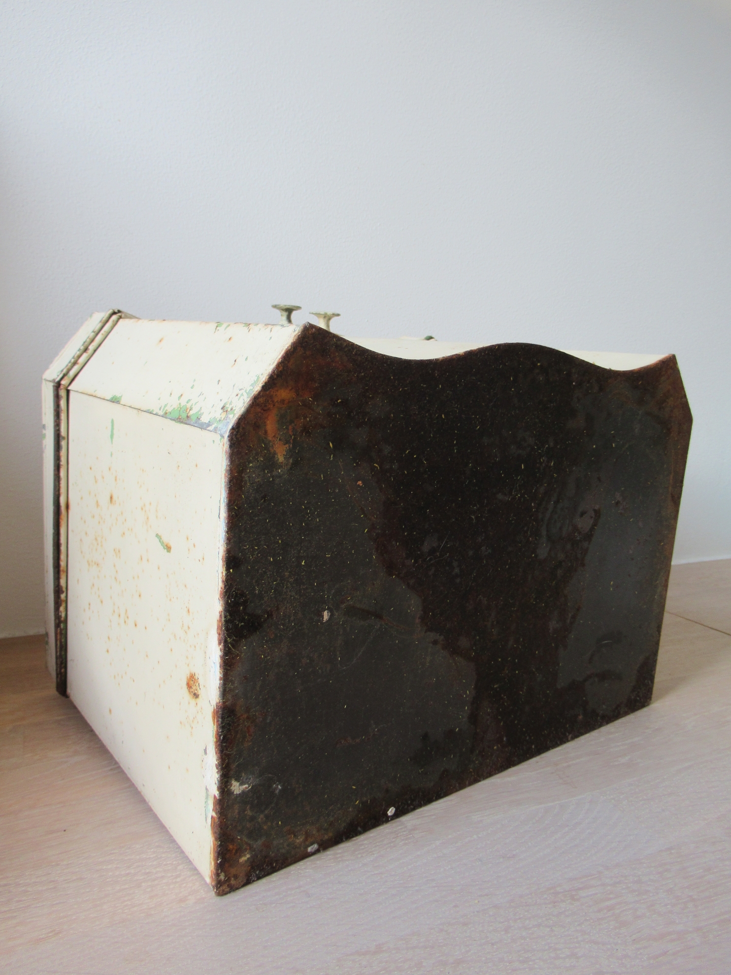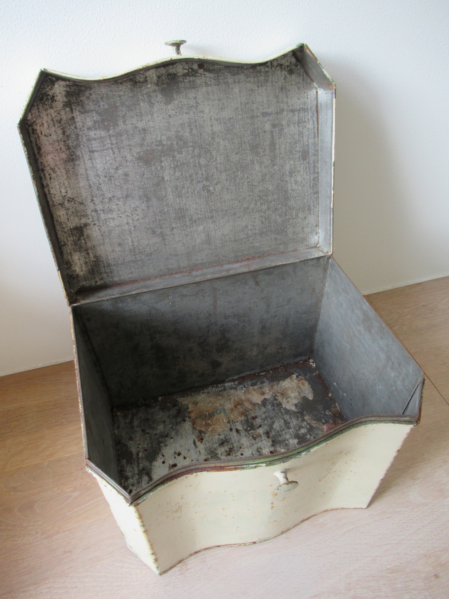 oud bakkersblik, onderkant is wat roestig, maar niet ‘door’, nog stevig genoeg dus, misschien zelfs nog wel te verwijderen (