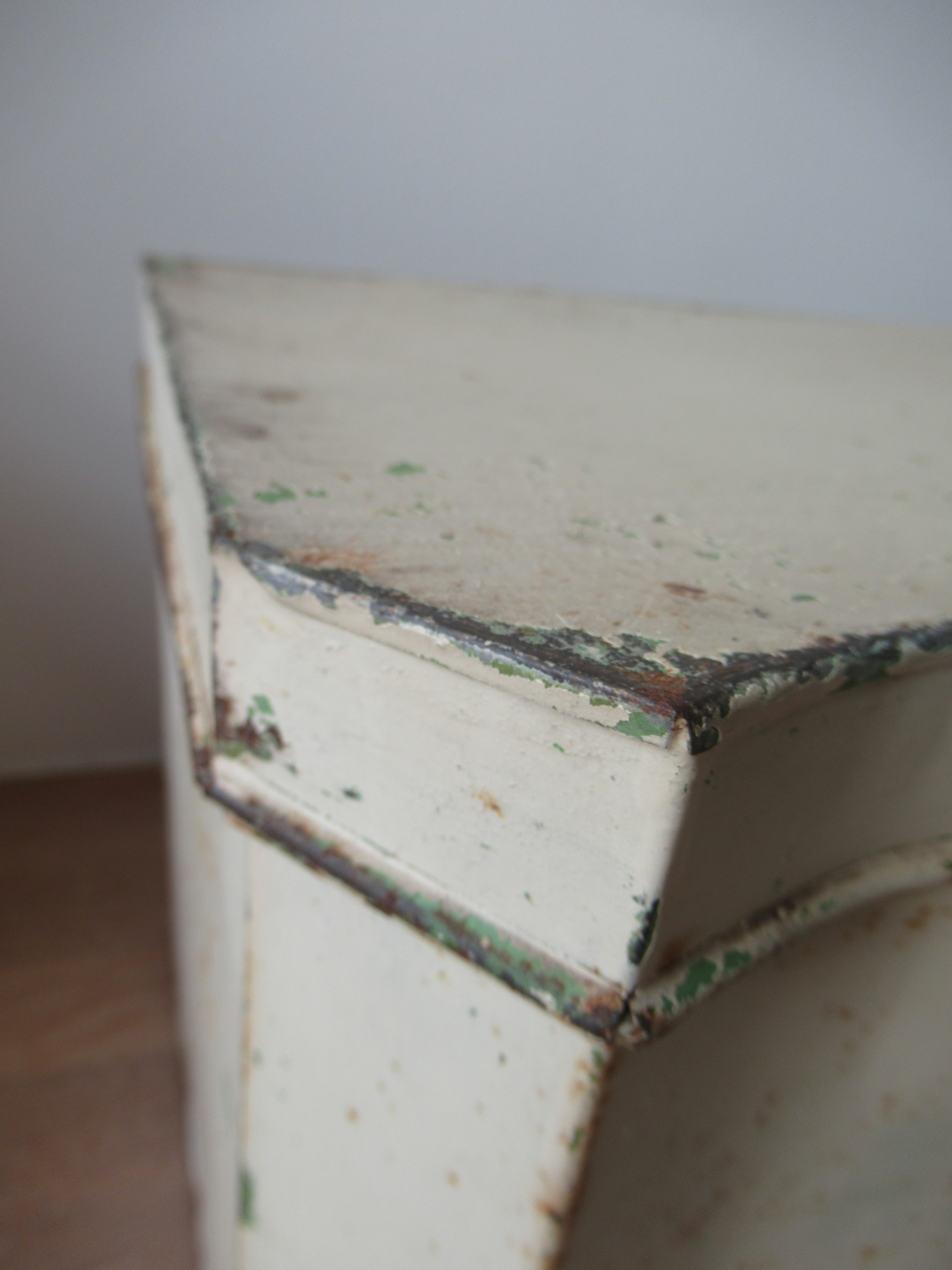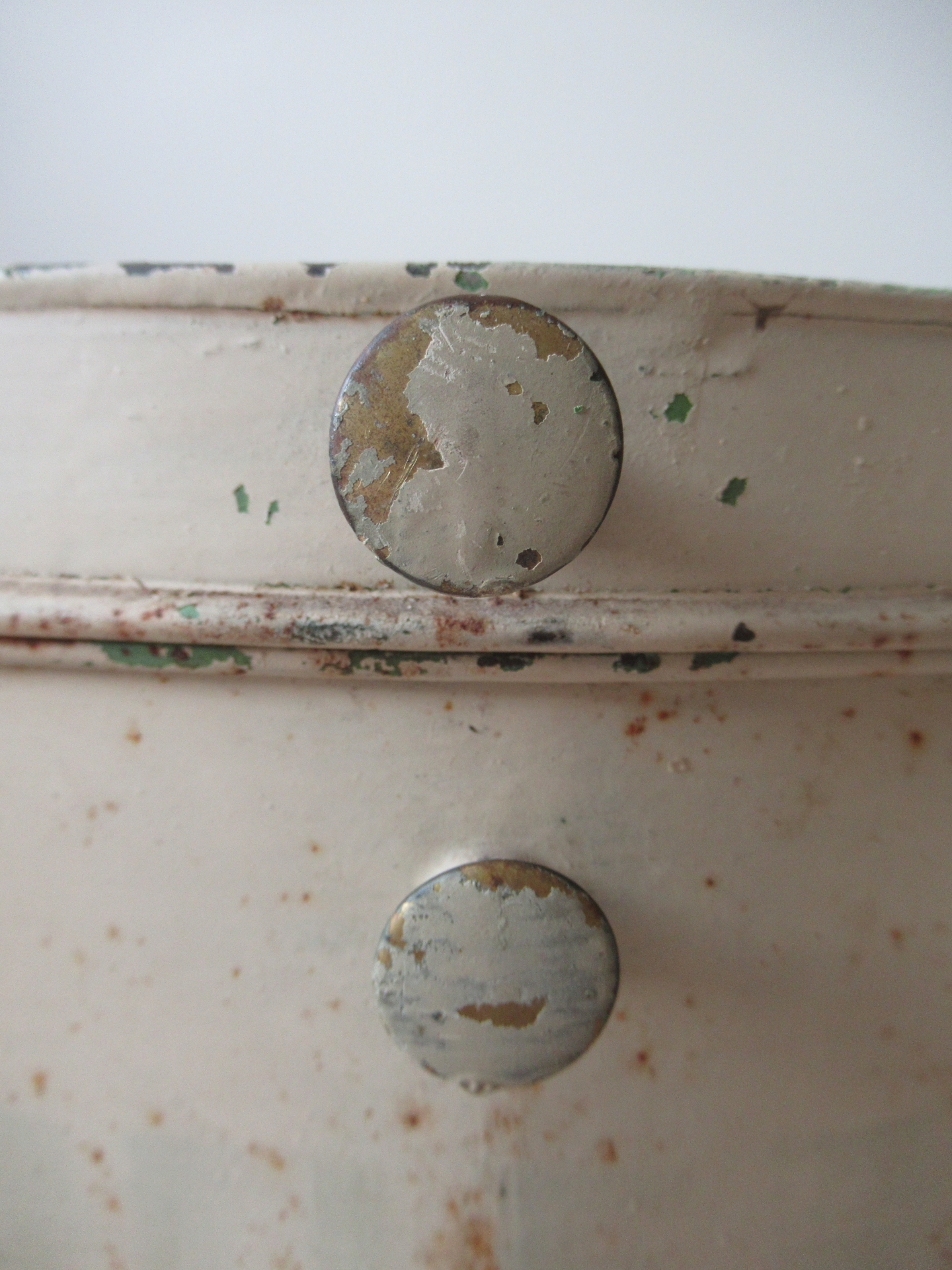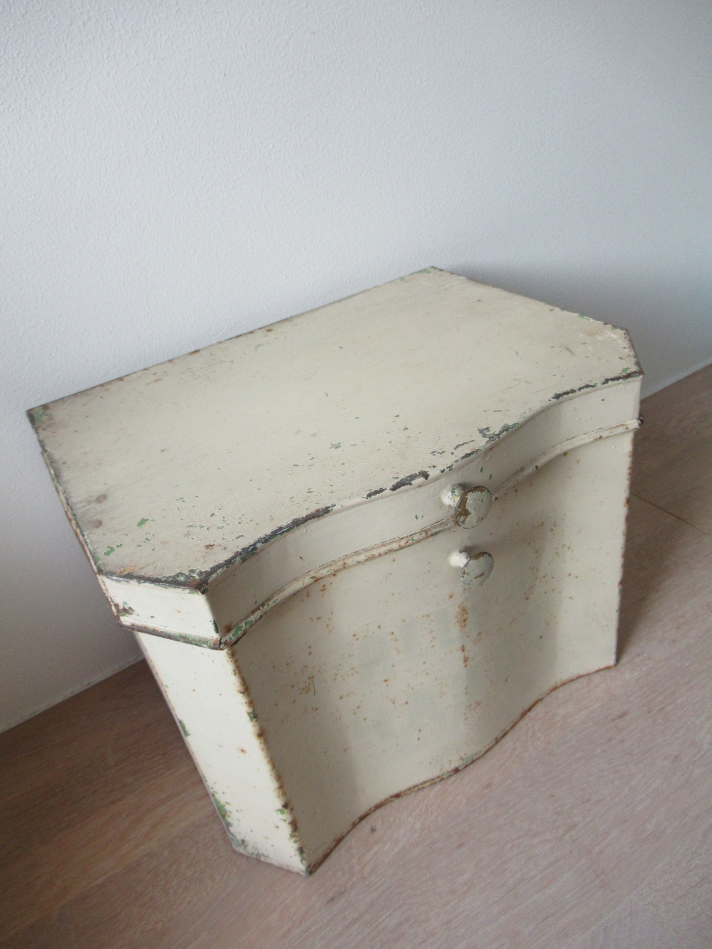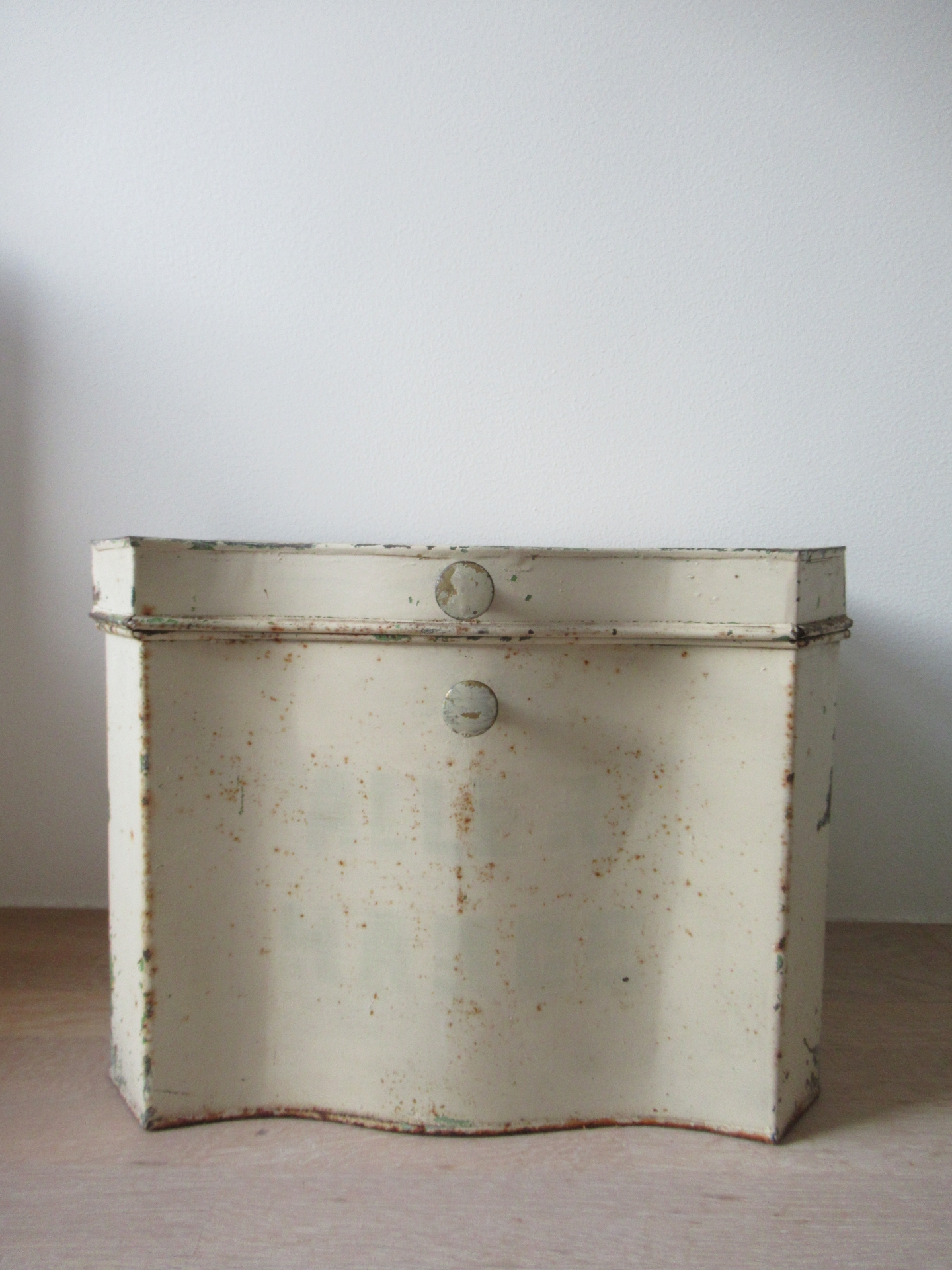oud bakkersblik, onderkant is wat roestig, maar niet ‘door’, nog stevig genoeg dus, misschien zelfs nog wel te verwijderen (