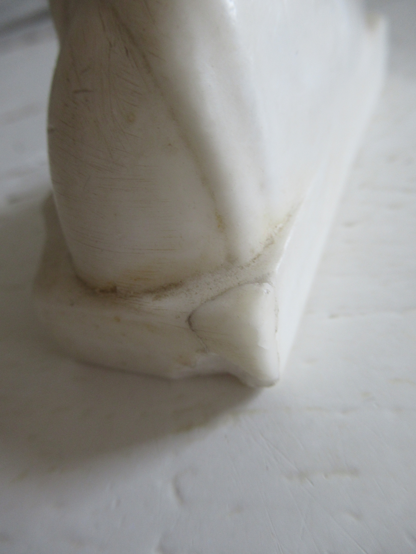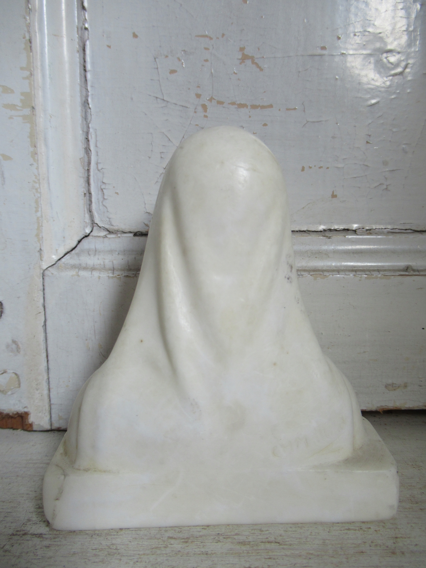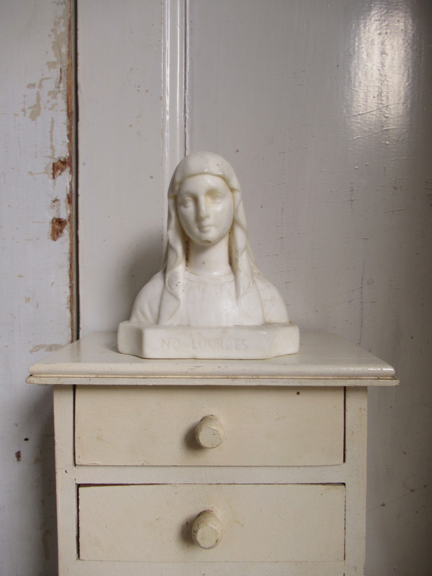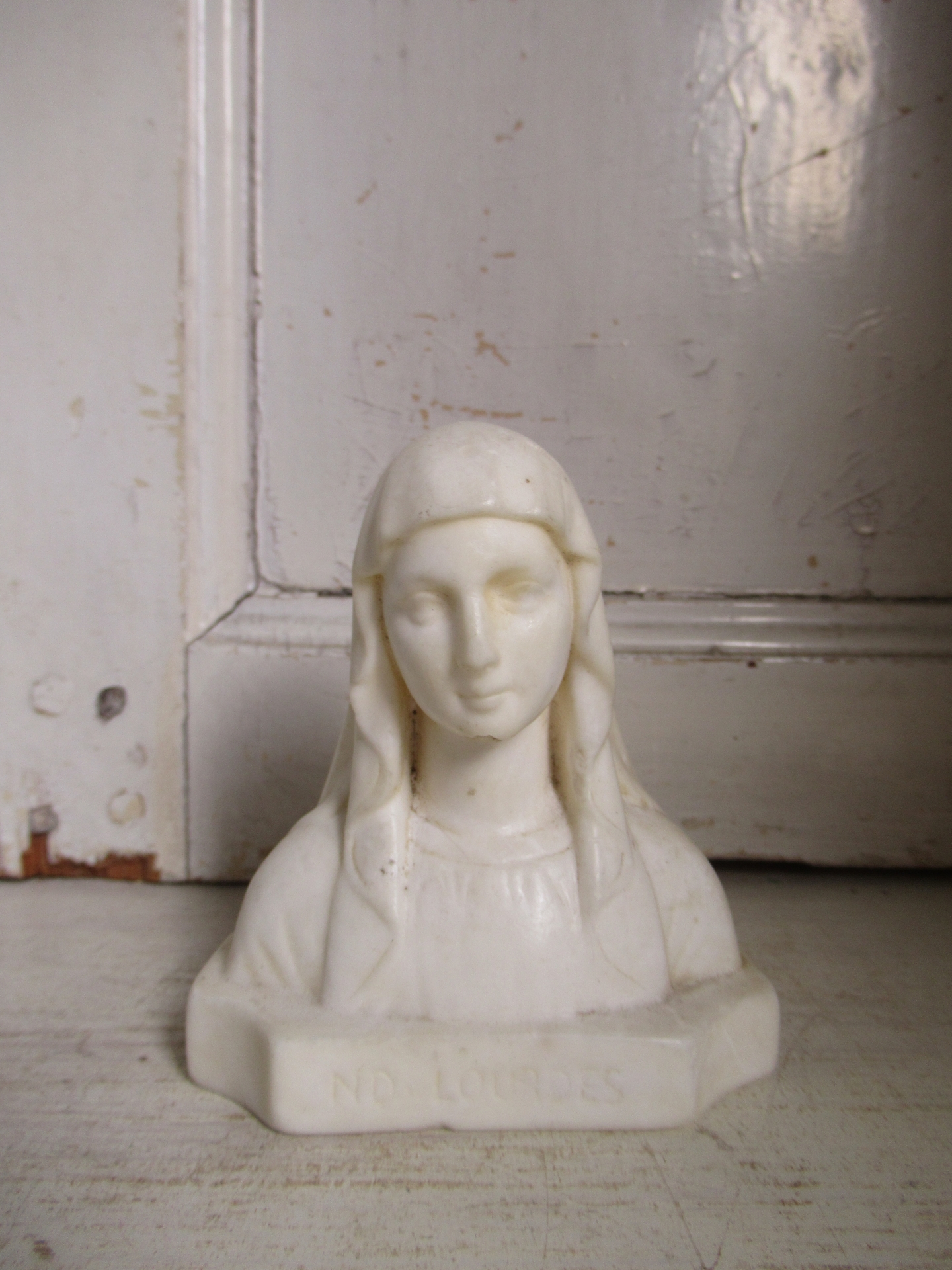 oud beeldje, ND de Lourdes, Maria, materiaal is een soort steen, marmer?, aan de achterkant een kleine beschadiging, niet storend, gesigneerd (hoogte 10 cm)