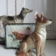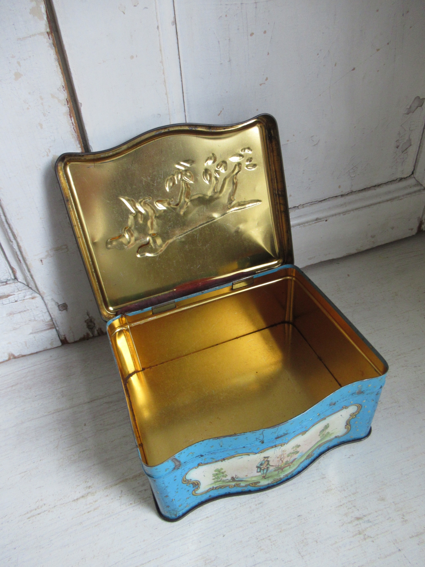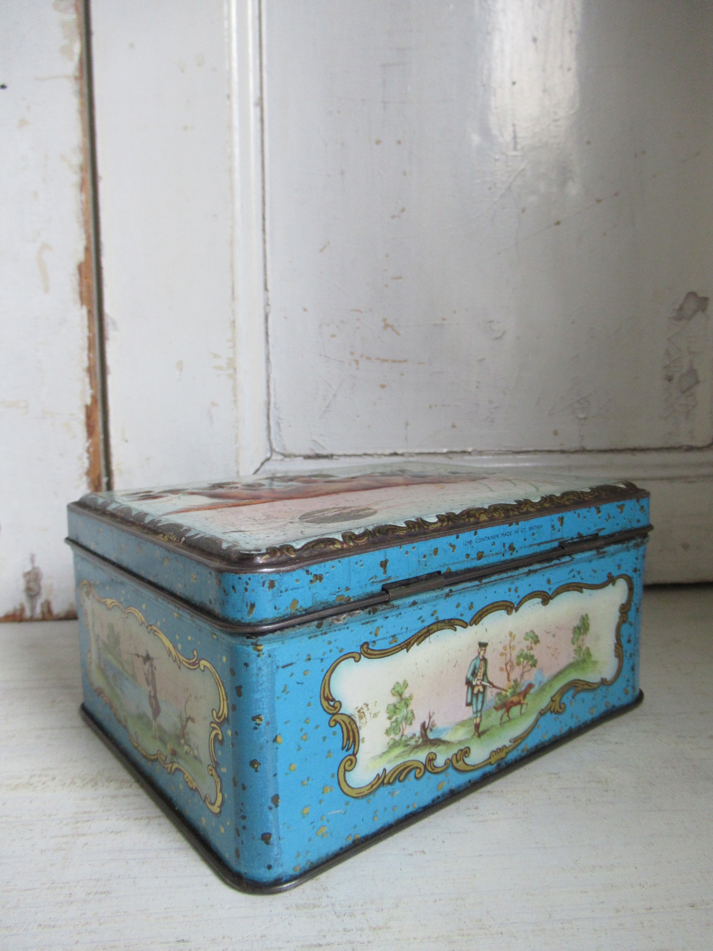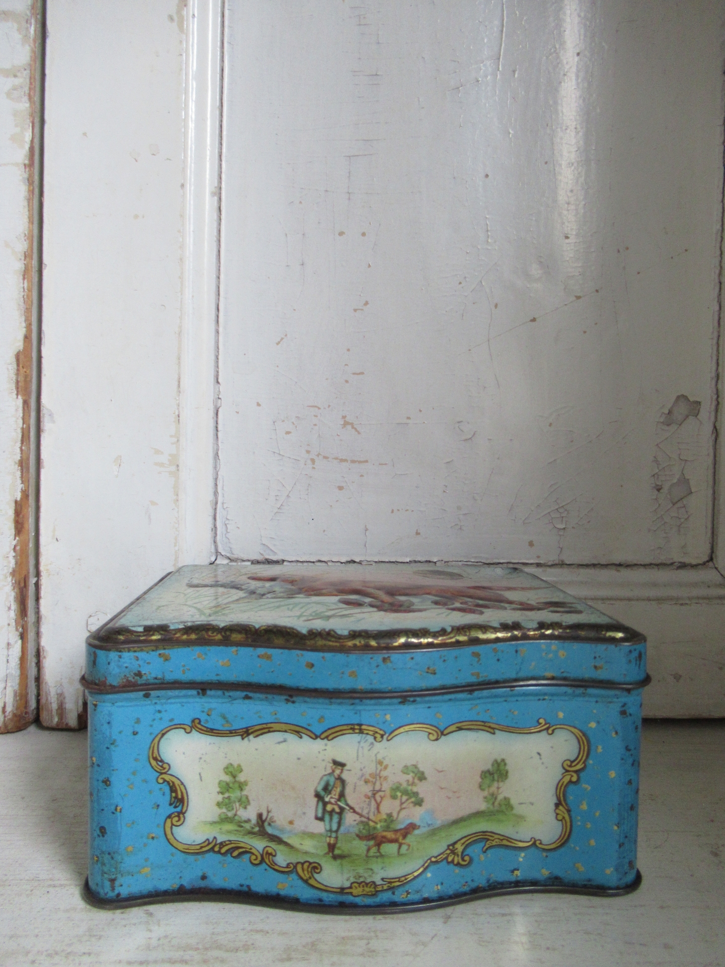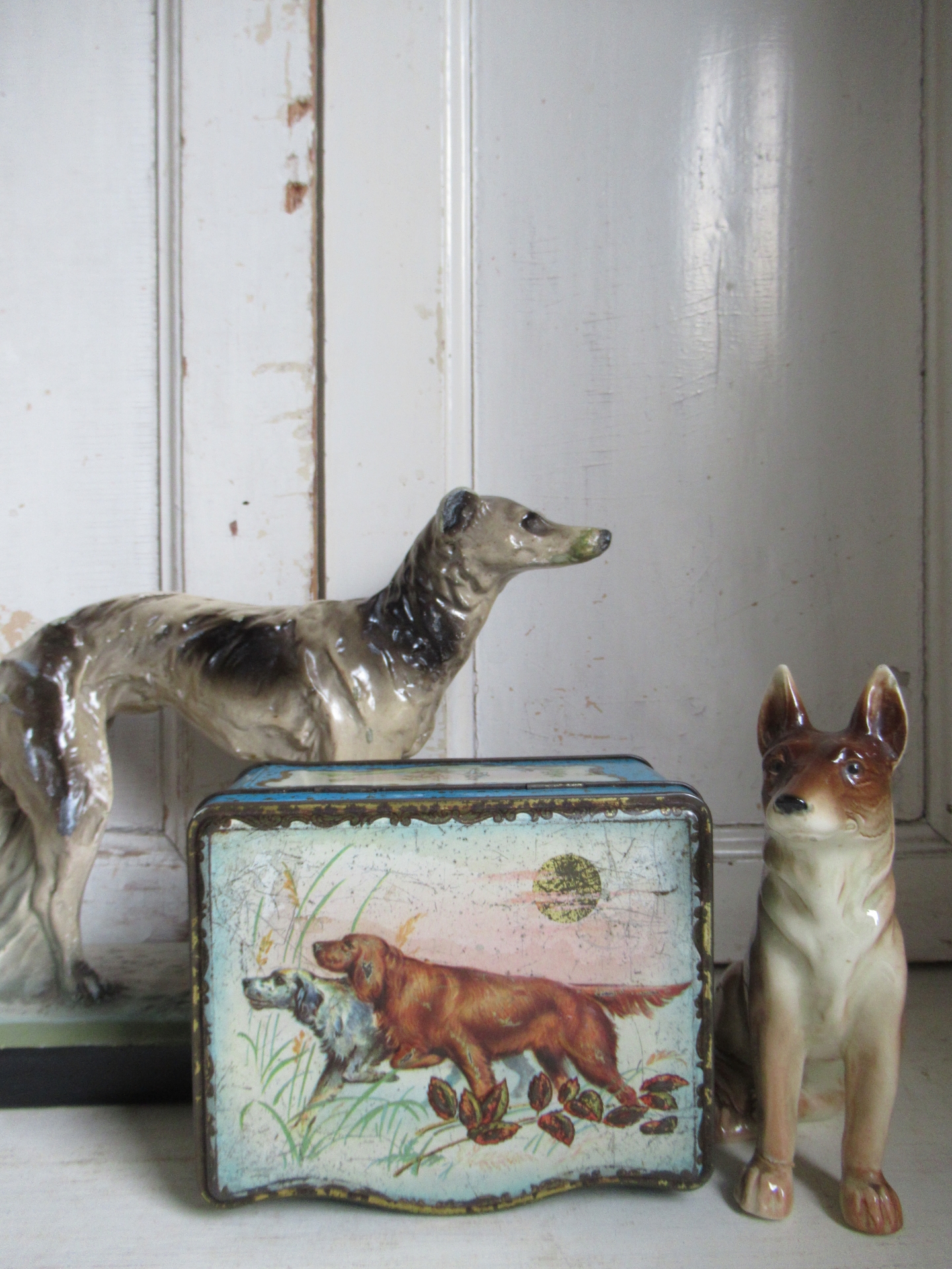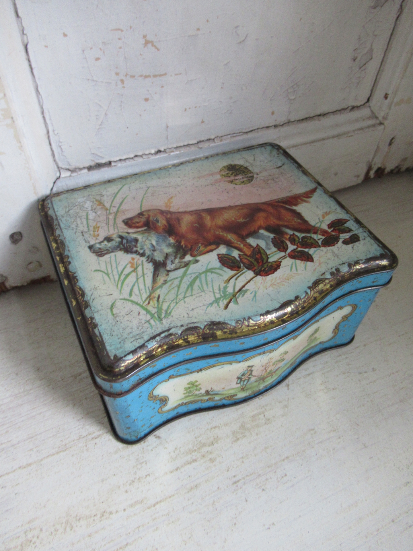 oud blikje met afbeelding van honden (15,5 cm bij 12,5 cm, hoogte 7 cm)