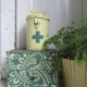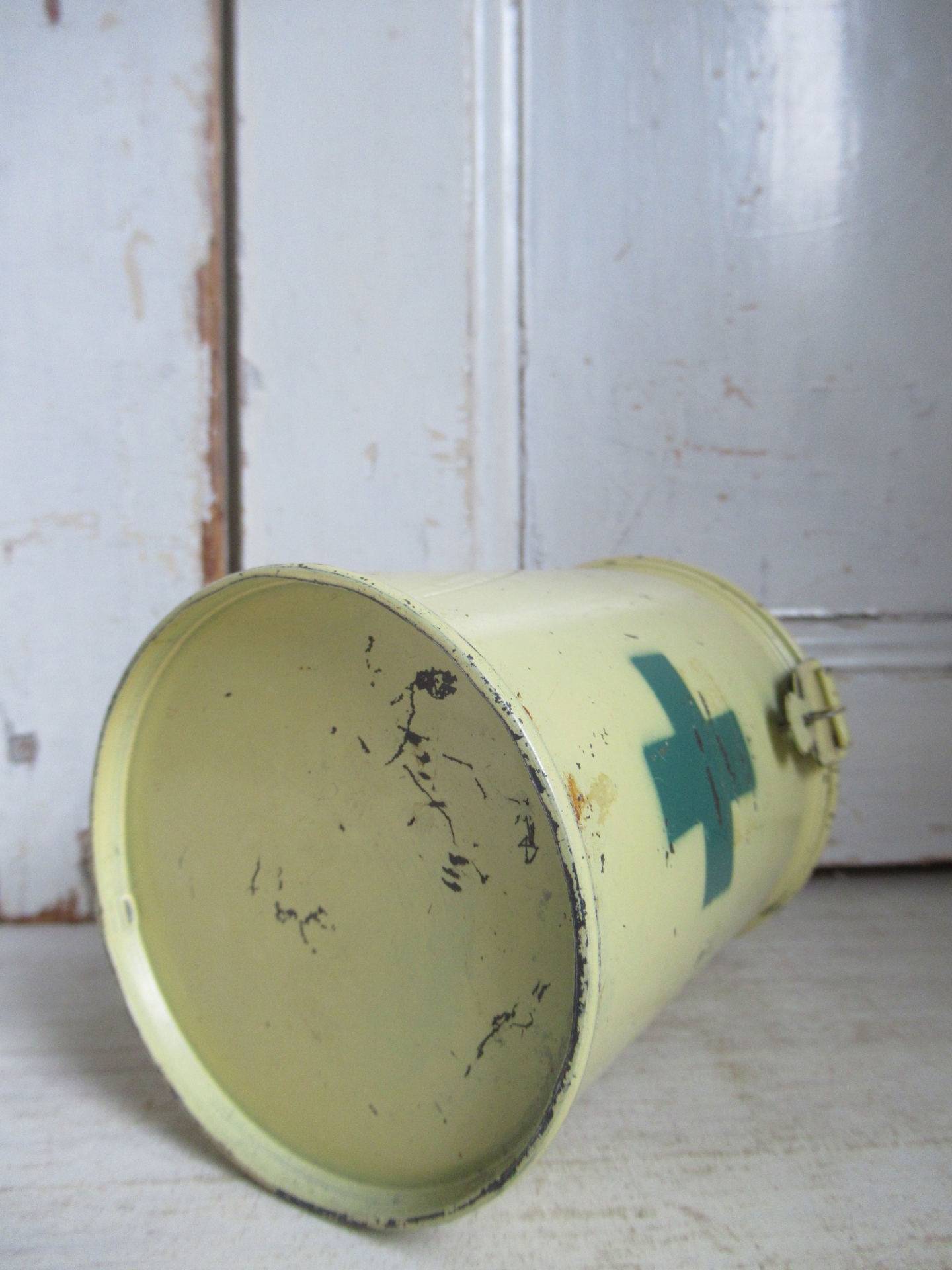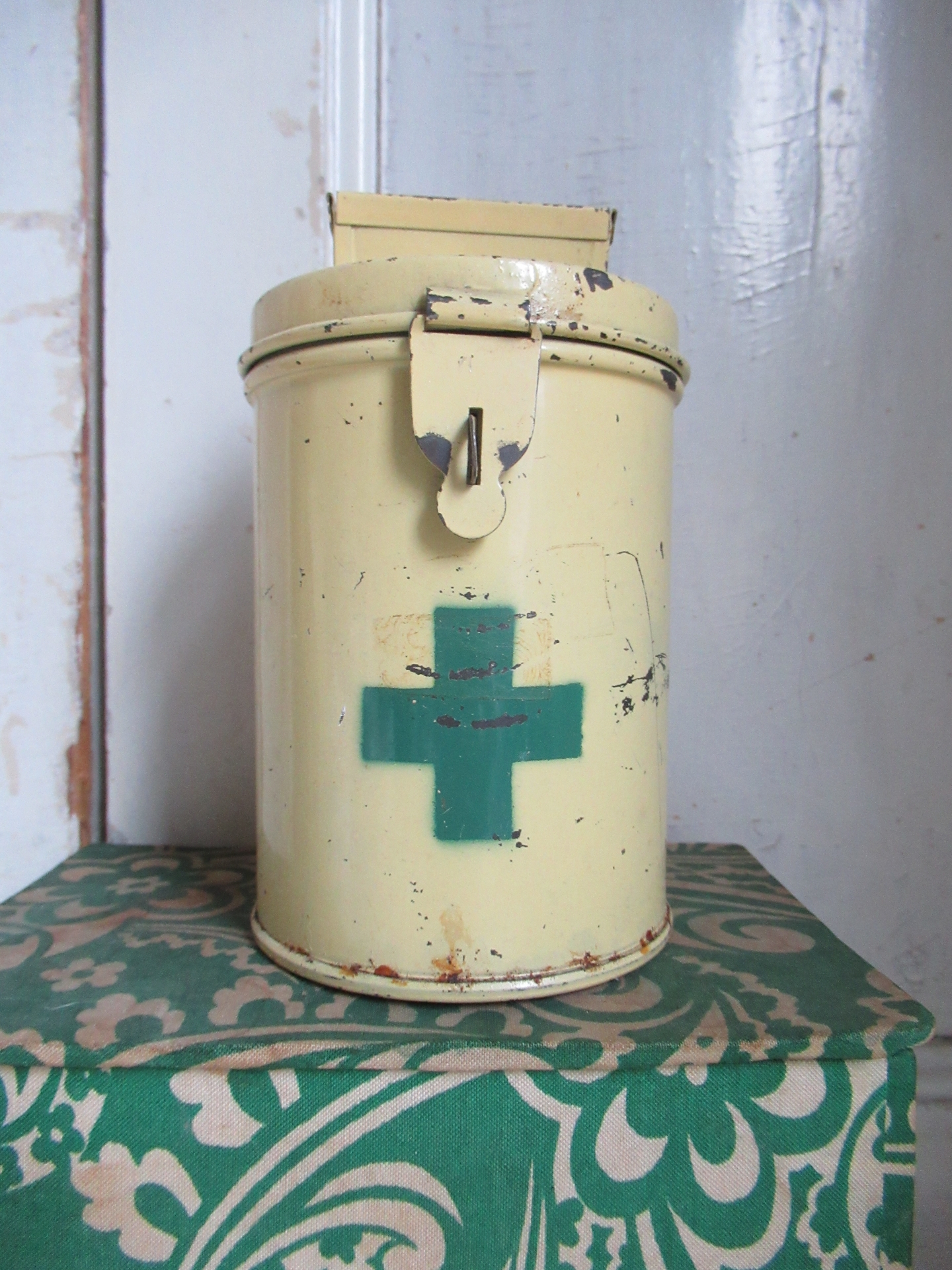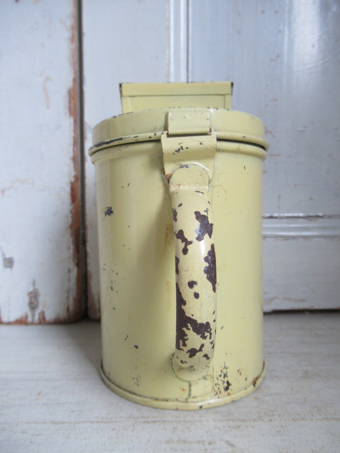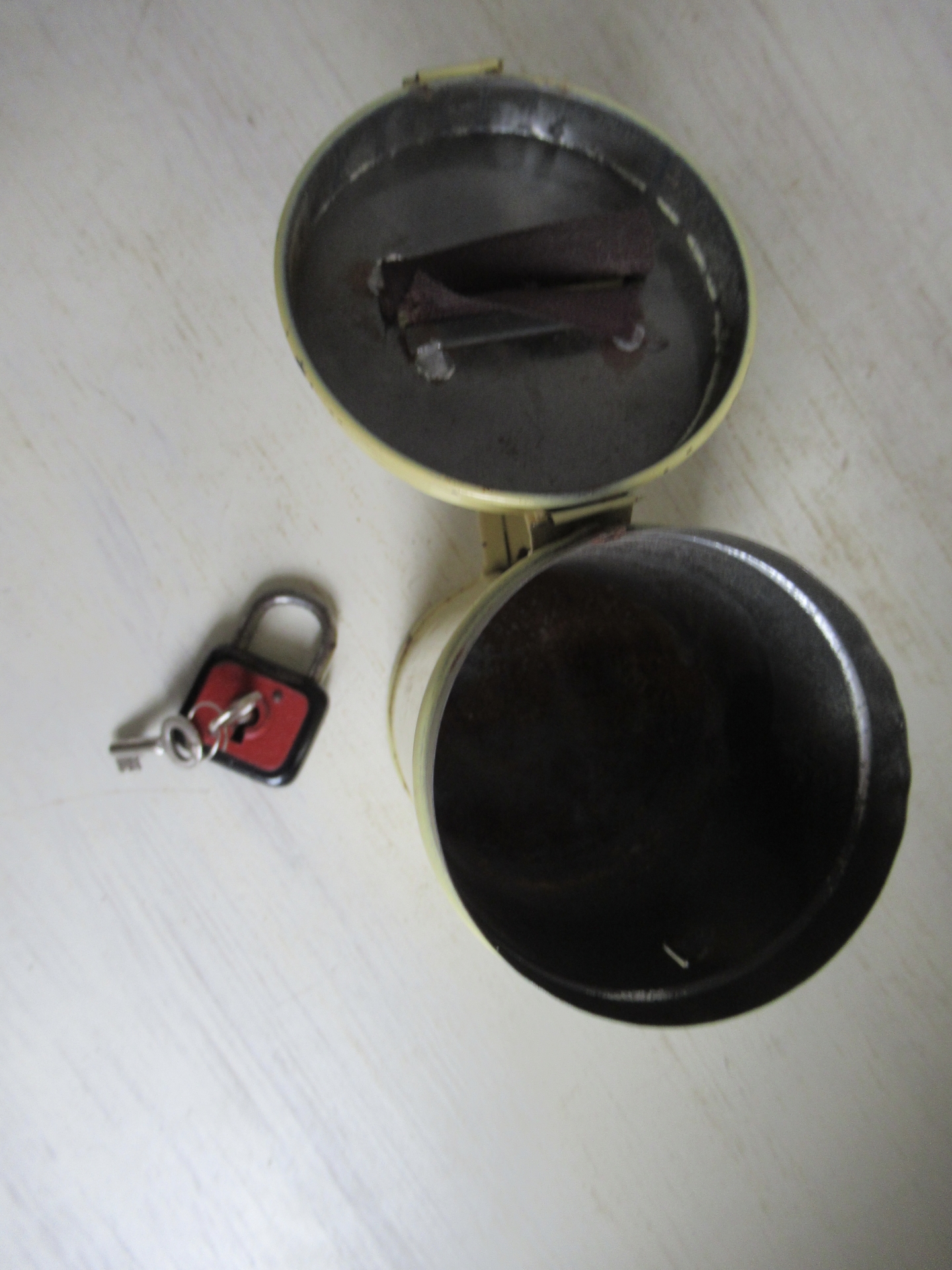oud collecte busje, met hangslotje en sleutel, leuk te gebruiken als spaarpot (hoogte 14 cm)