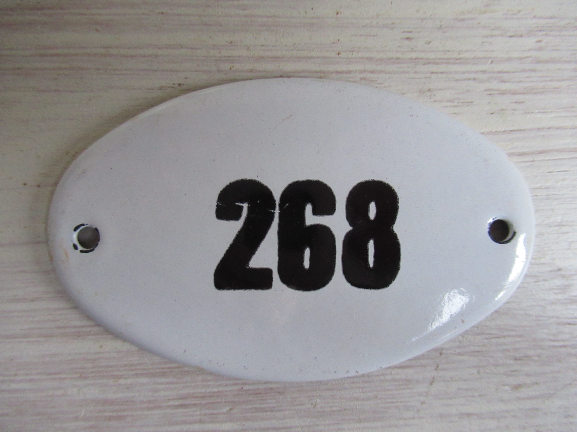 oud emaille cijferplaatje, 268, leuk om op een kast te timmeren, bijvoorbeeld (8 bij 5 cm)
