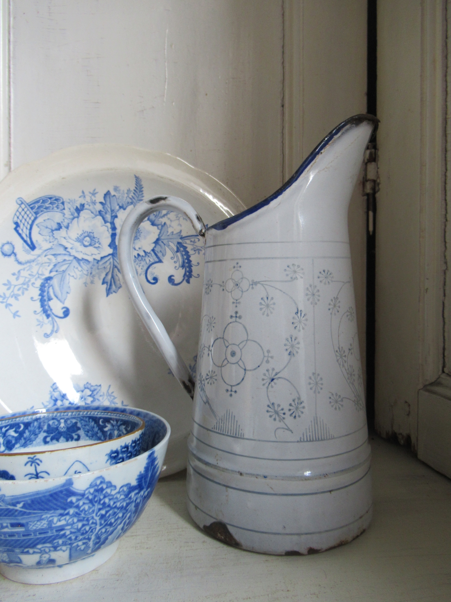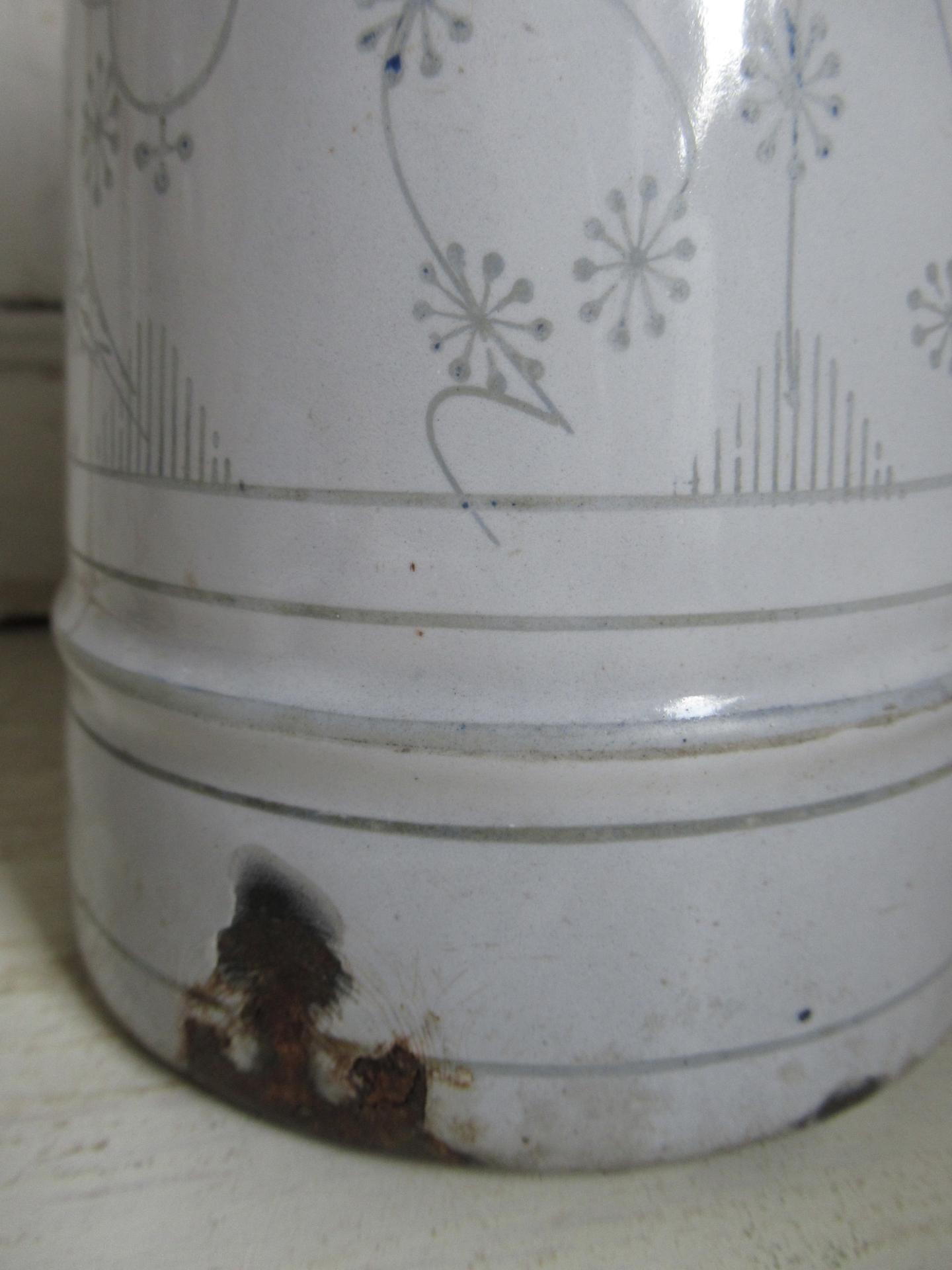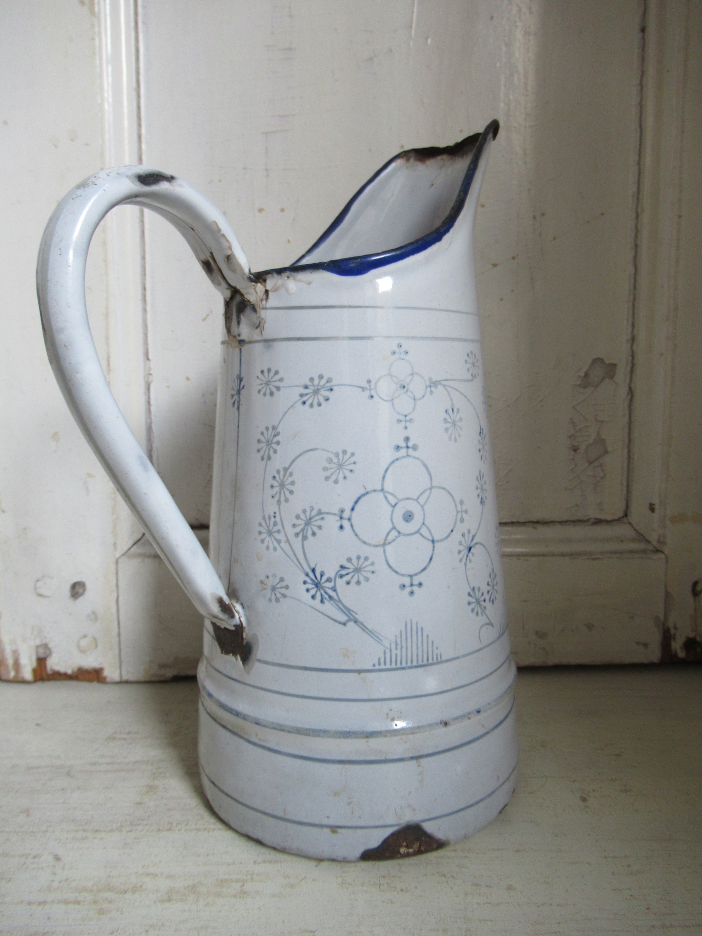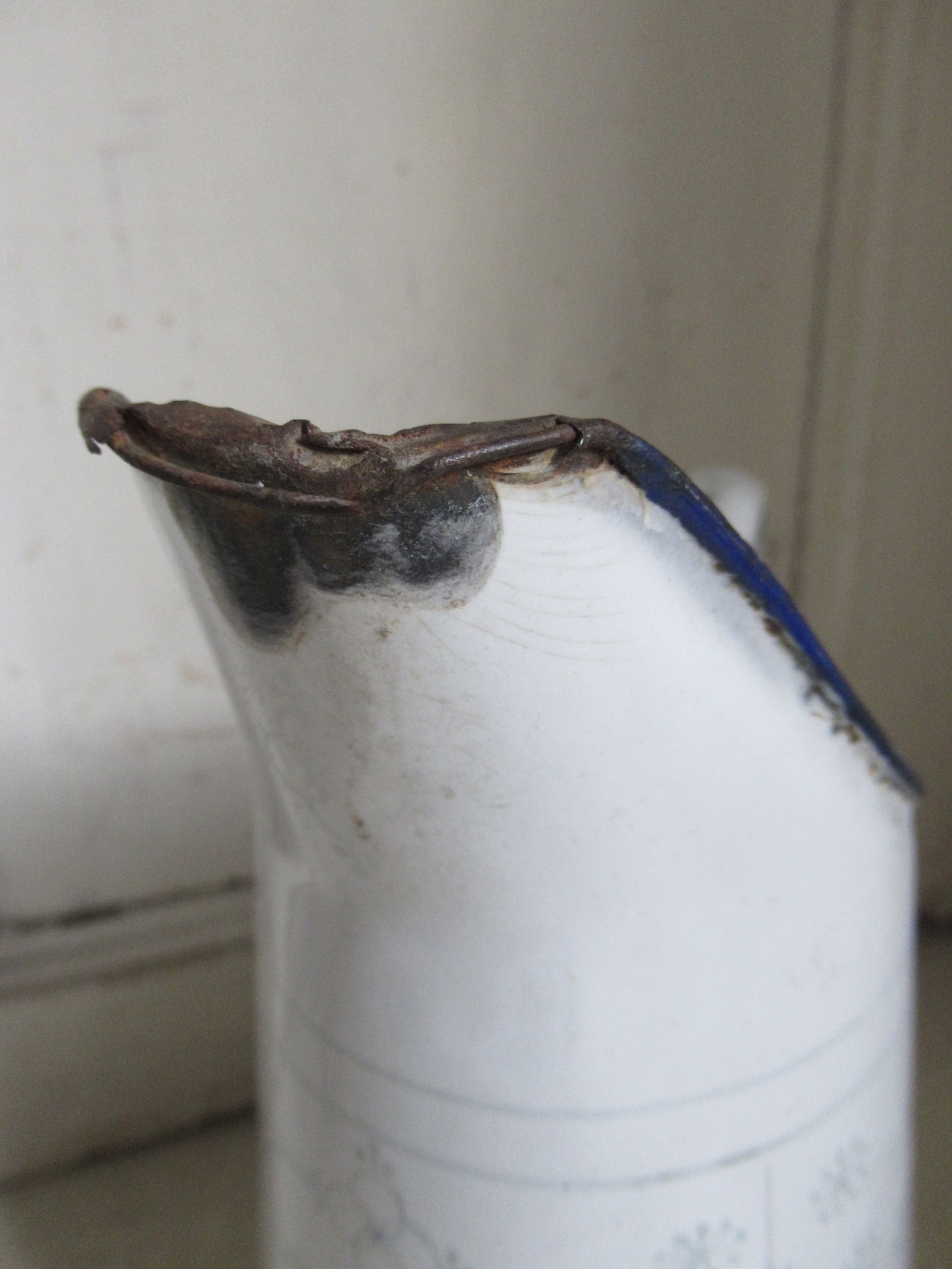 oud emaille kannetje, Saks motief, mist de nodige stukjes emaille, de tuit is beschadigd en het motief wat vervaagd (hoogte 22,5 cm)