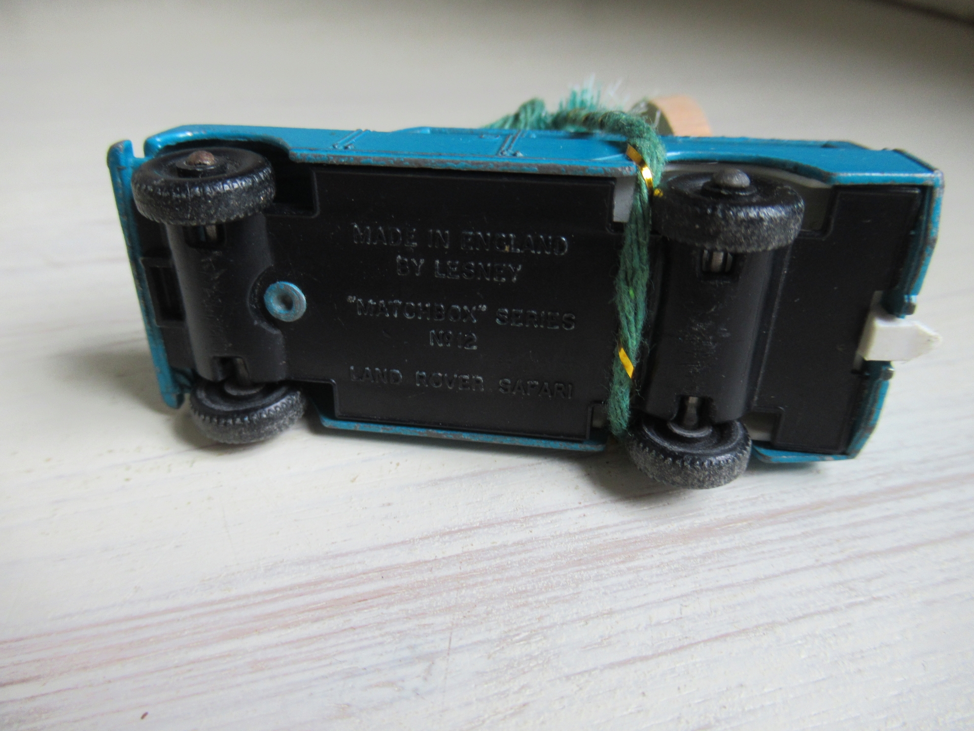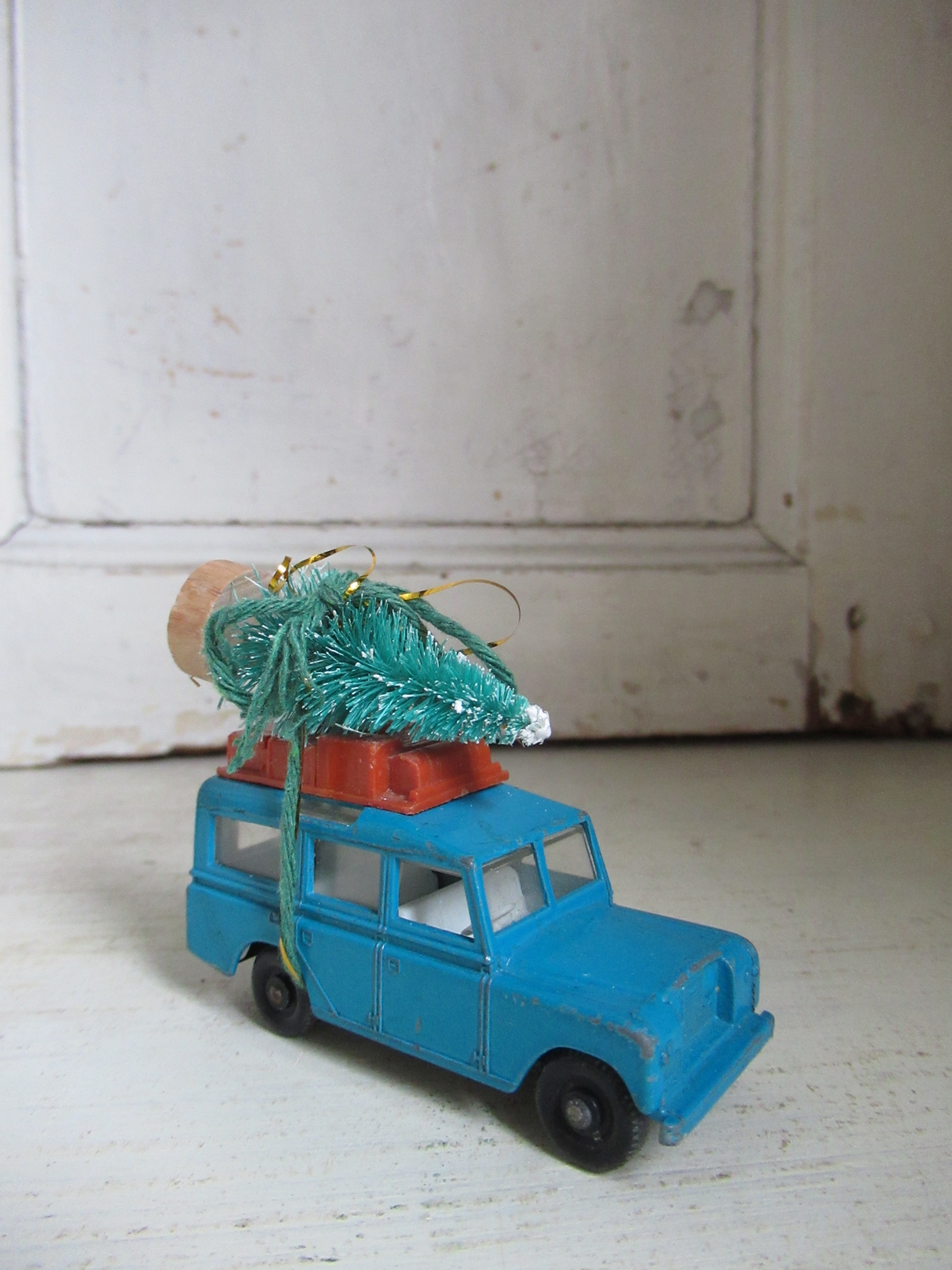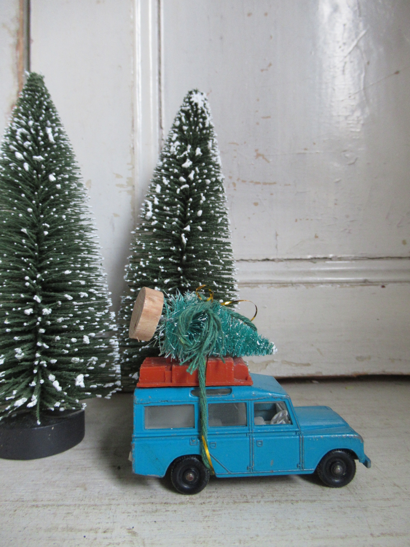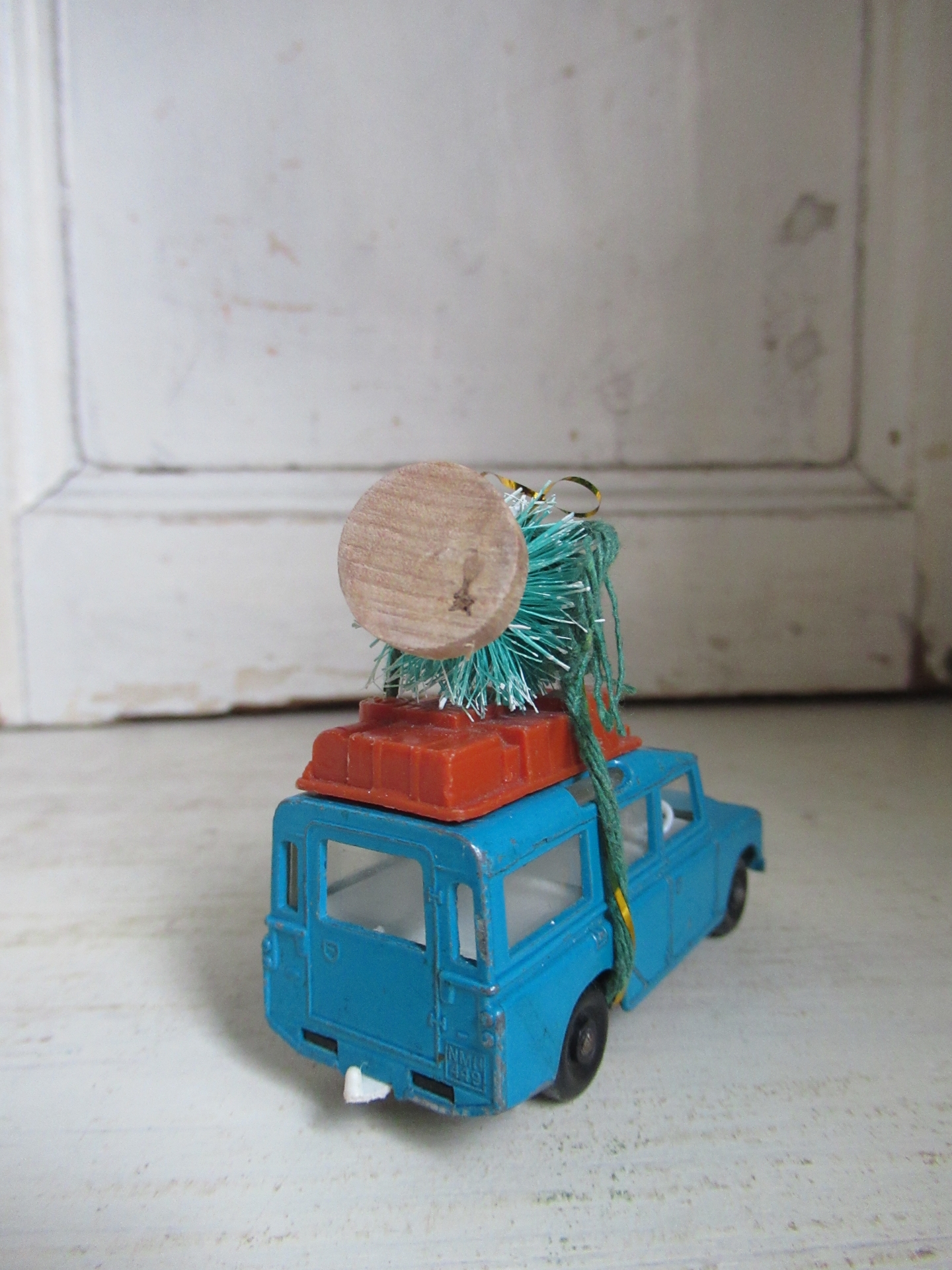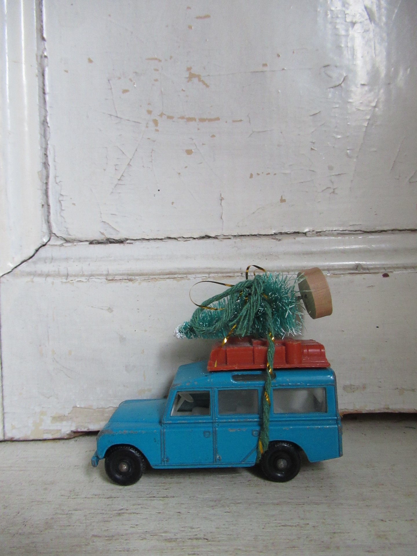 oud Engels autootje met kerstboom, landrover safari (7 bij 2,5 cm, hoogte 6 cm inclusief kerstboom)