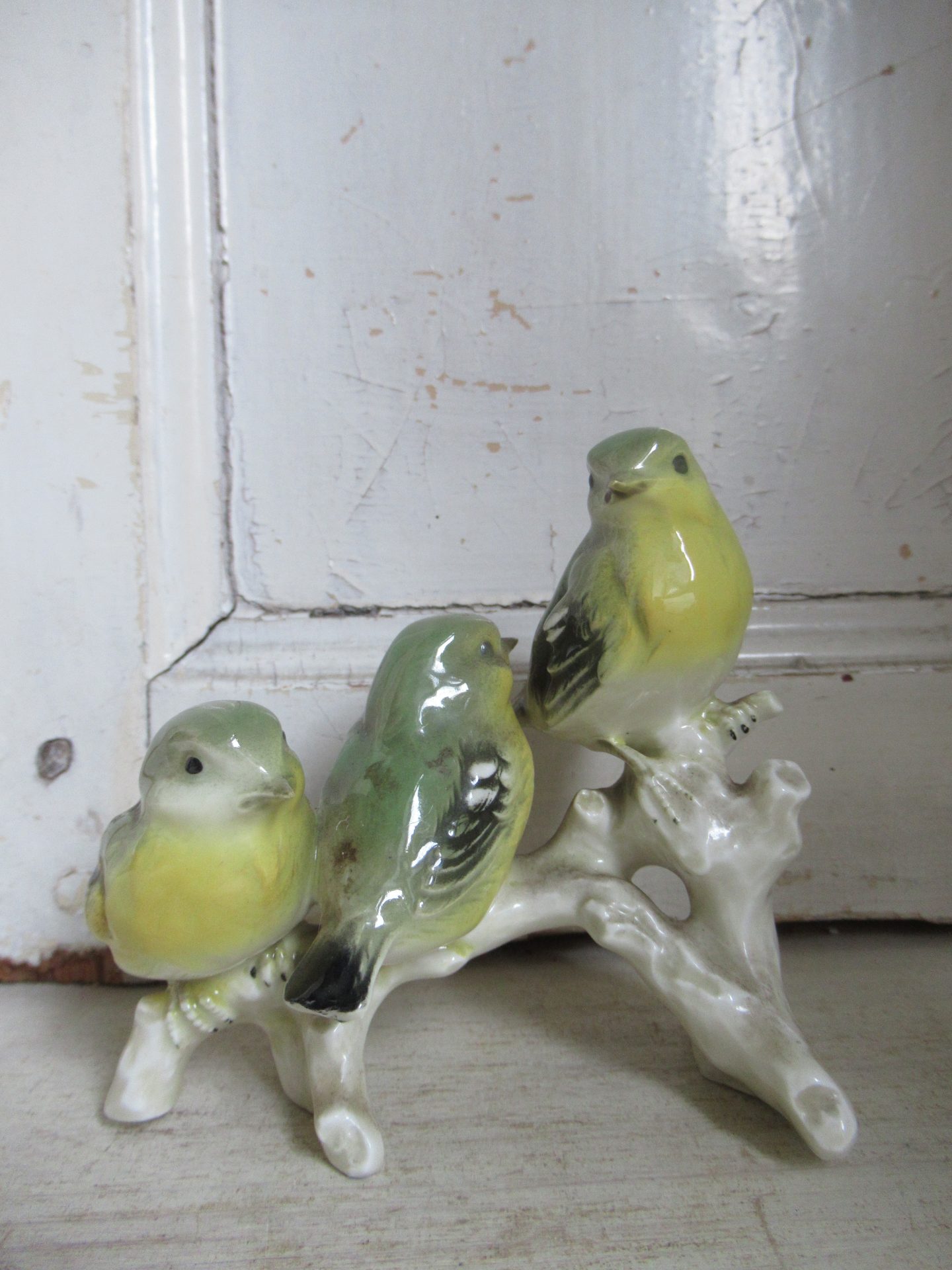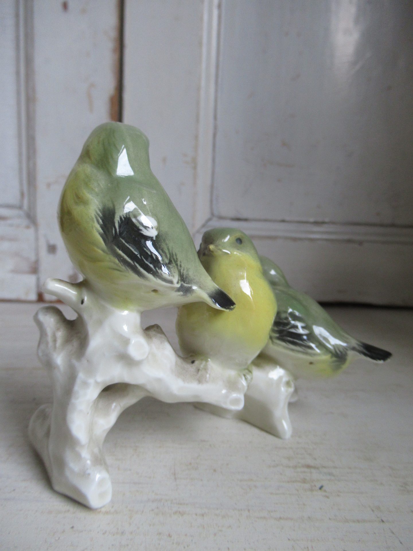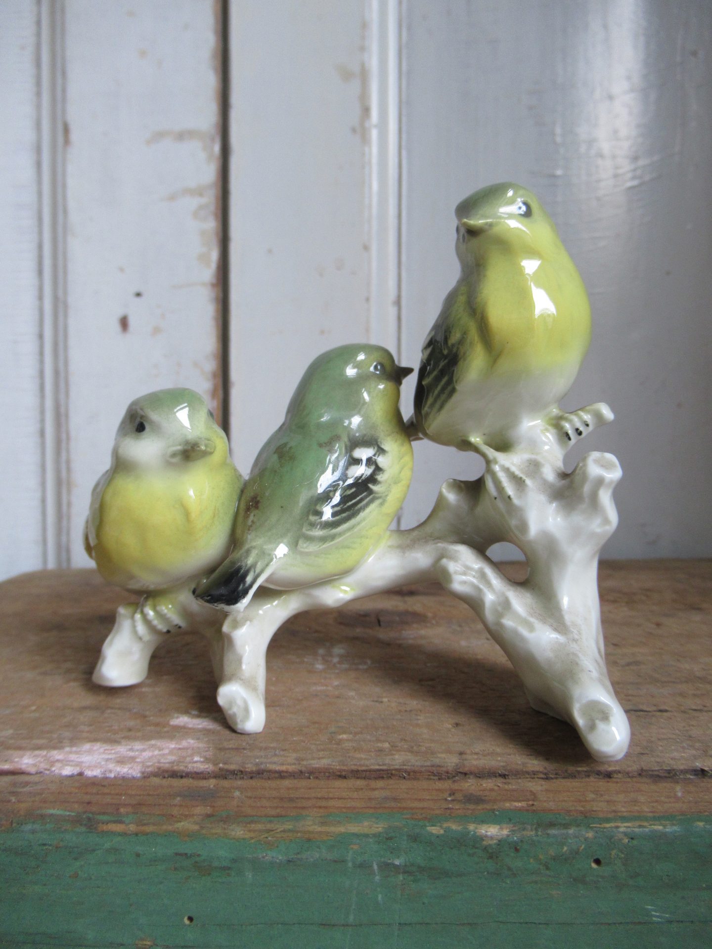 oud Engels beeldje, 3 vogeltjes op een tak (12 bij 6 cm, hoogte 9,5 cm)