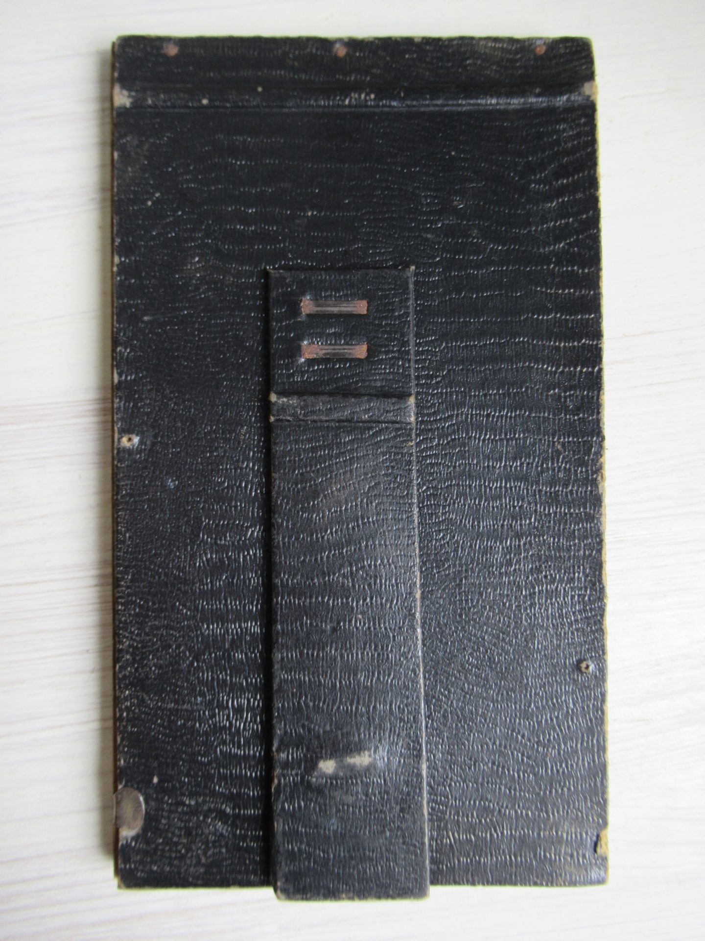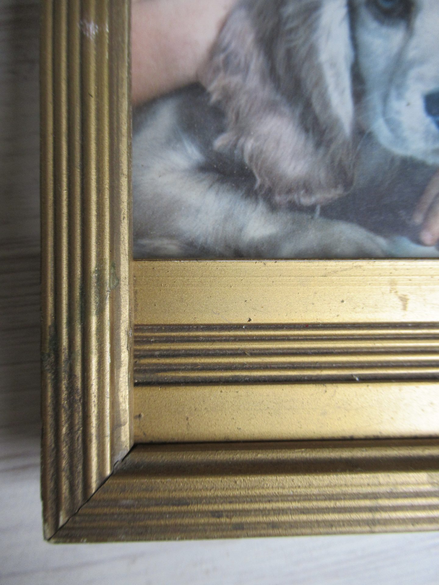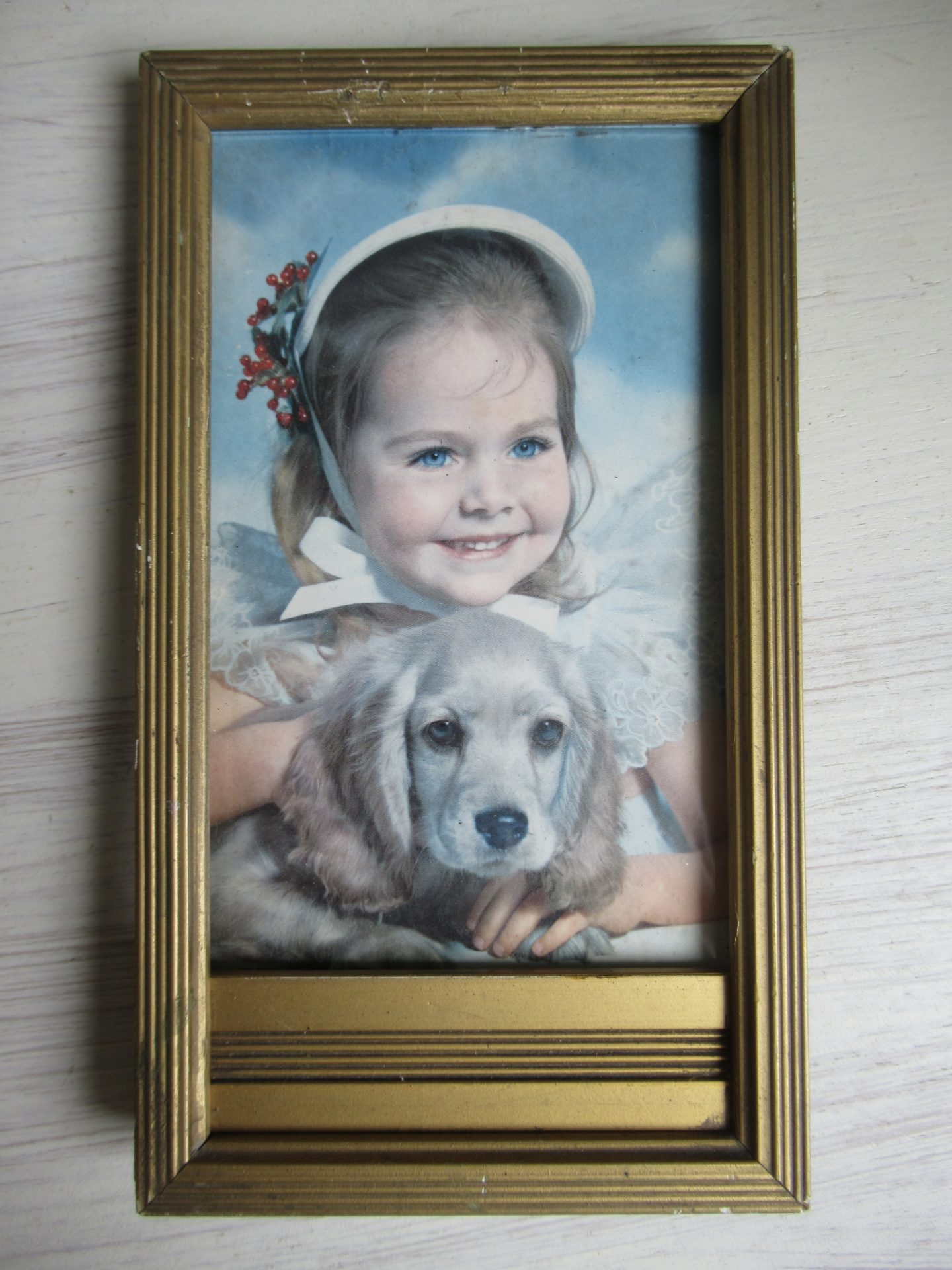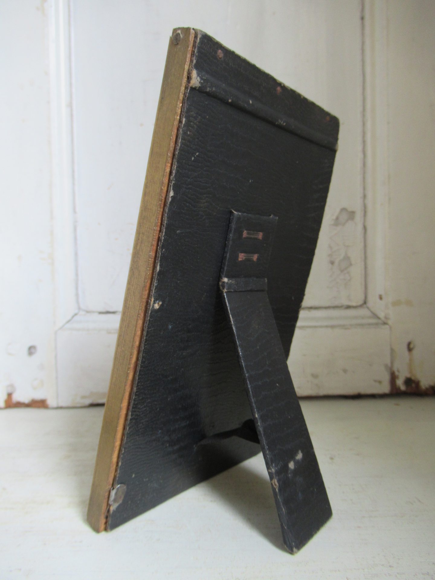 oud fotolijstje, goudkleurig geverfd hout, beetje gammel, achterkant sluit slechts met 1 haakje (18 bij 10 cm, ruimte voor afbeelding 13 bij 8 cm)