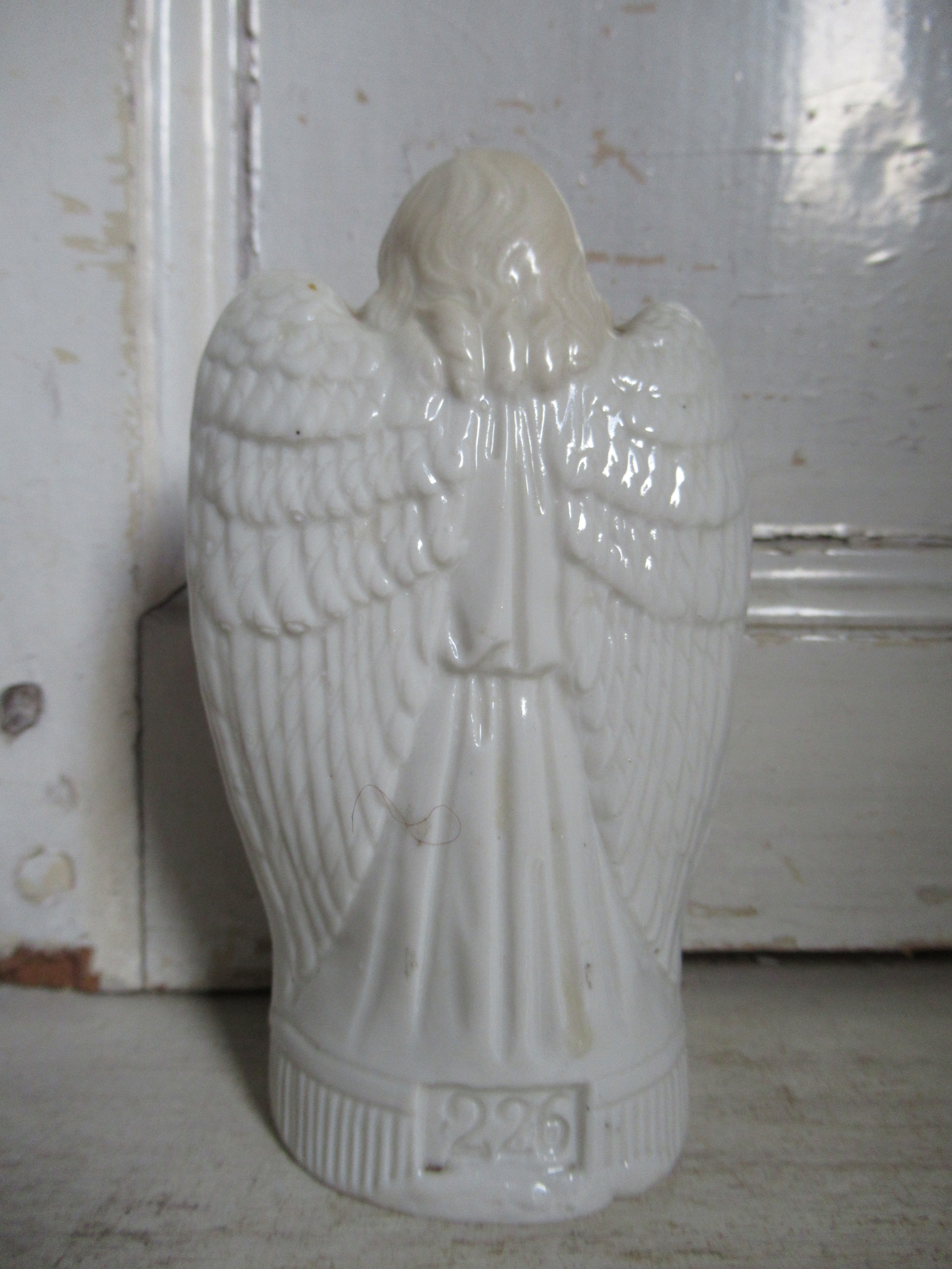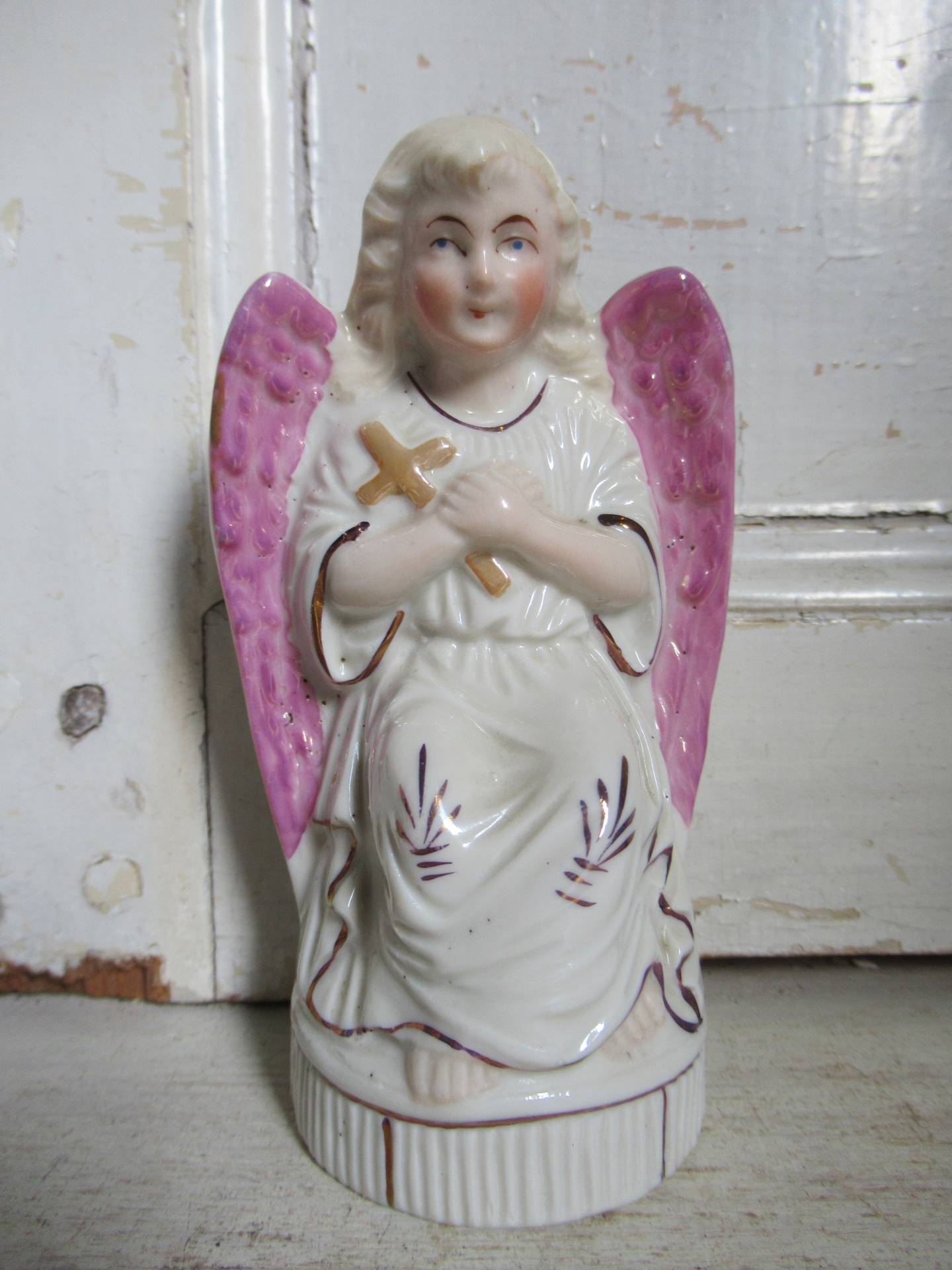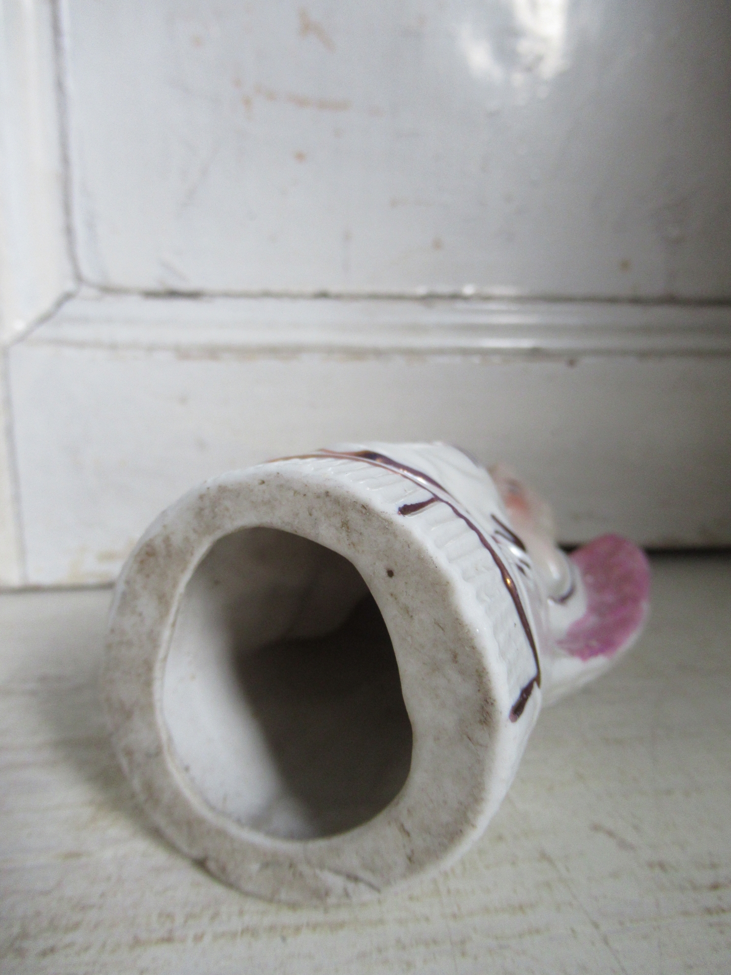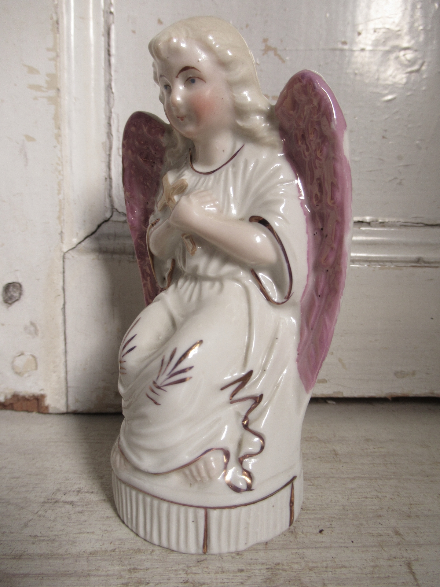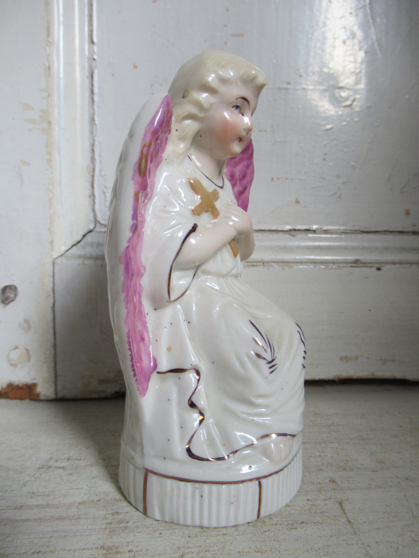 oud Frans beeldje, engeltje, porselein, roze vleugels en goudkleurig details, hol van binnen en genummerd aan de achterkant (hoogte 12 cm)