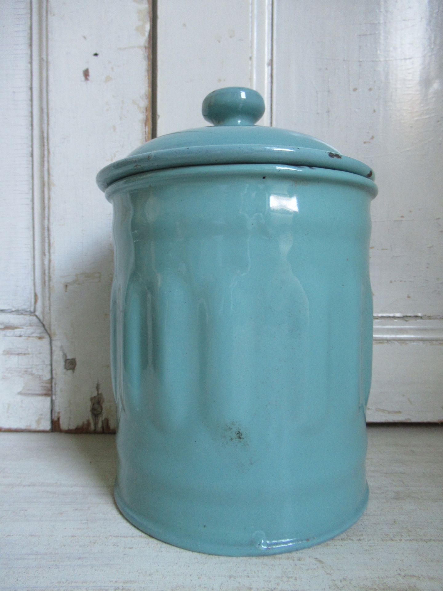 oud Frans emaille voorraadblik met deksel, Café, prachtige kleur!, deksel mist een heel klein stukje emaille (hoogte 18 cm)
