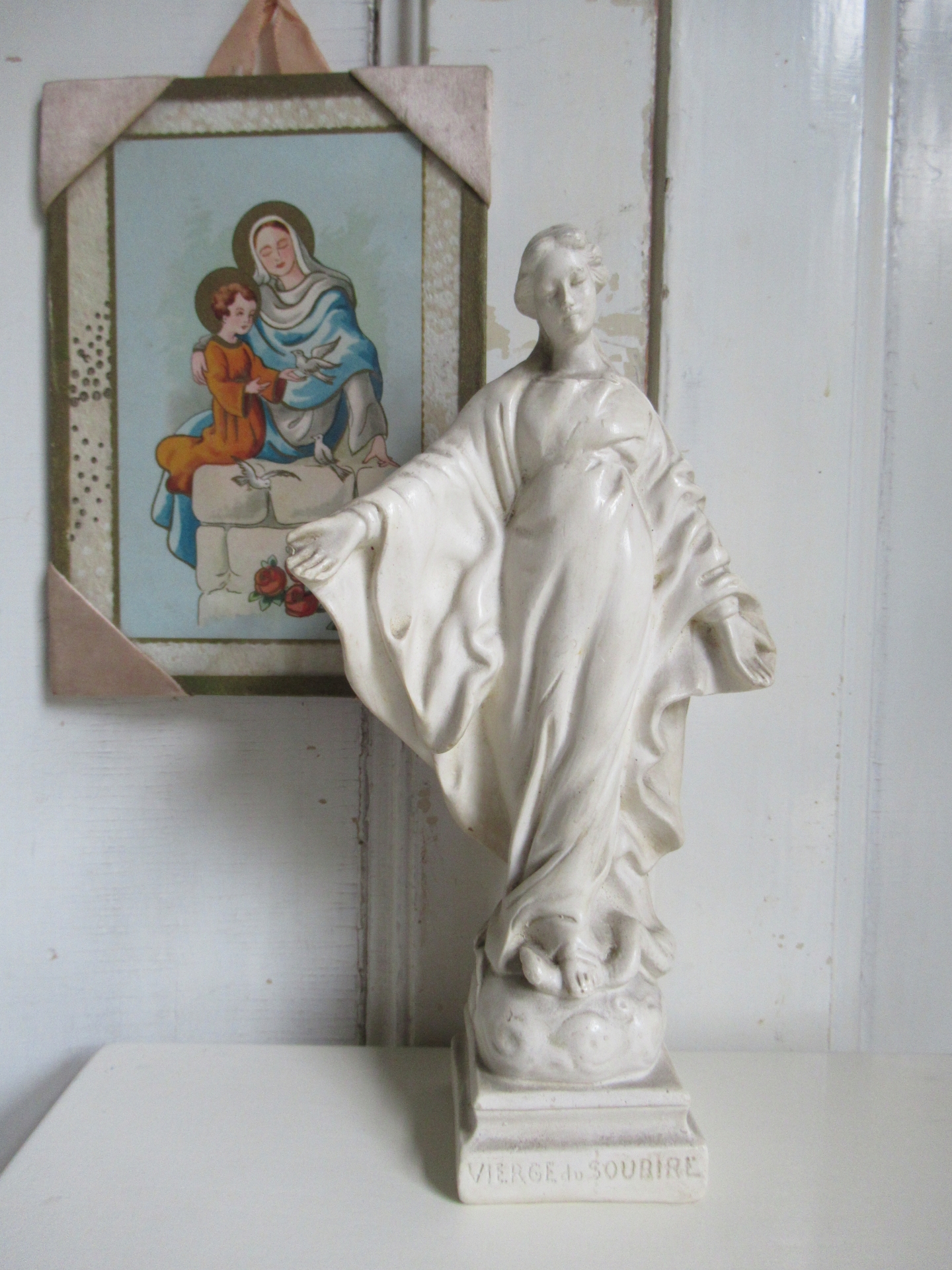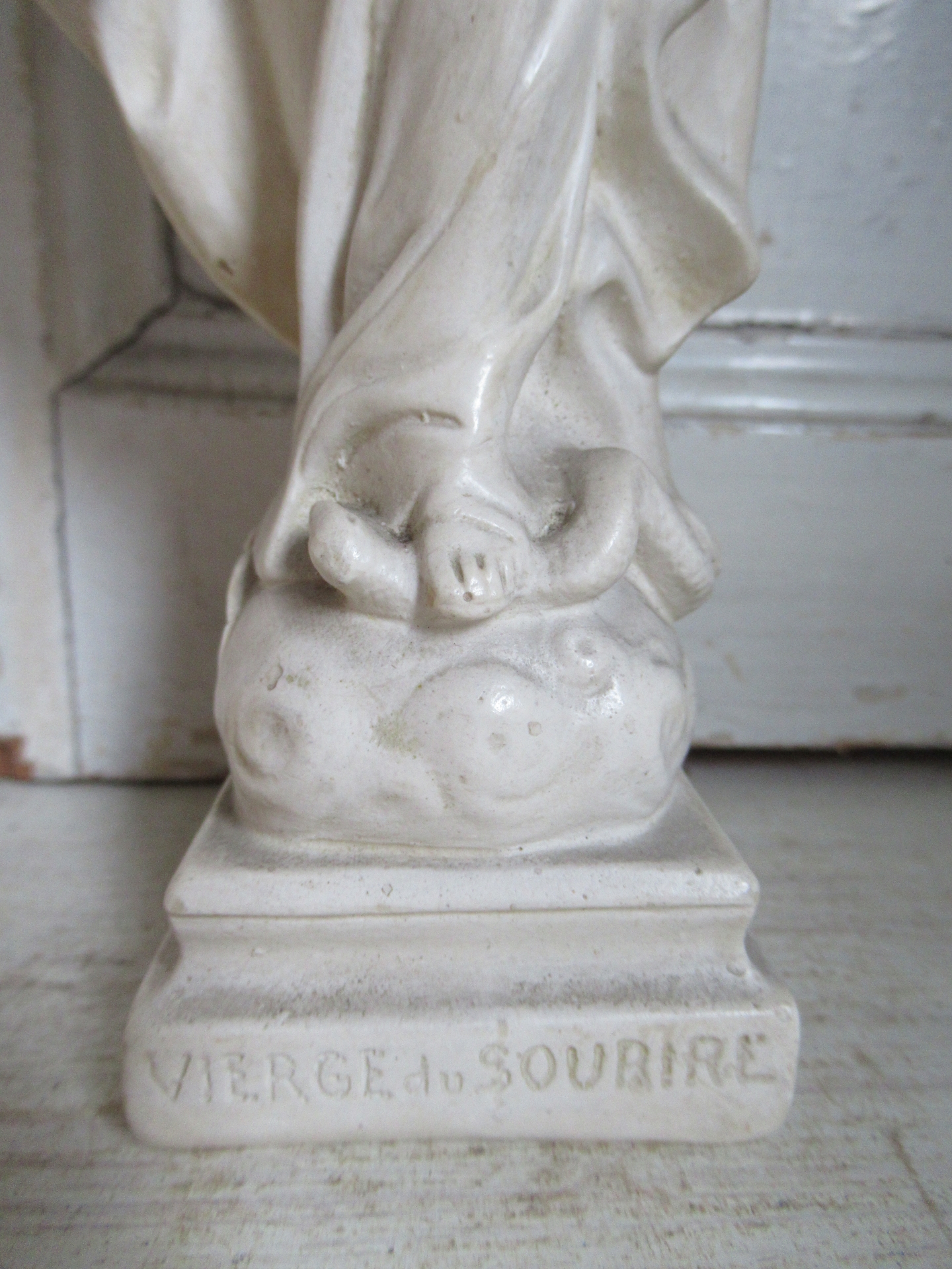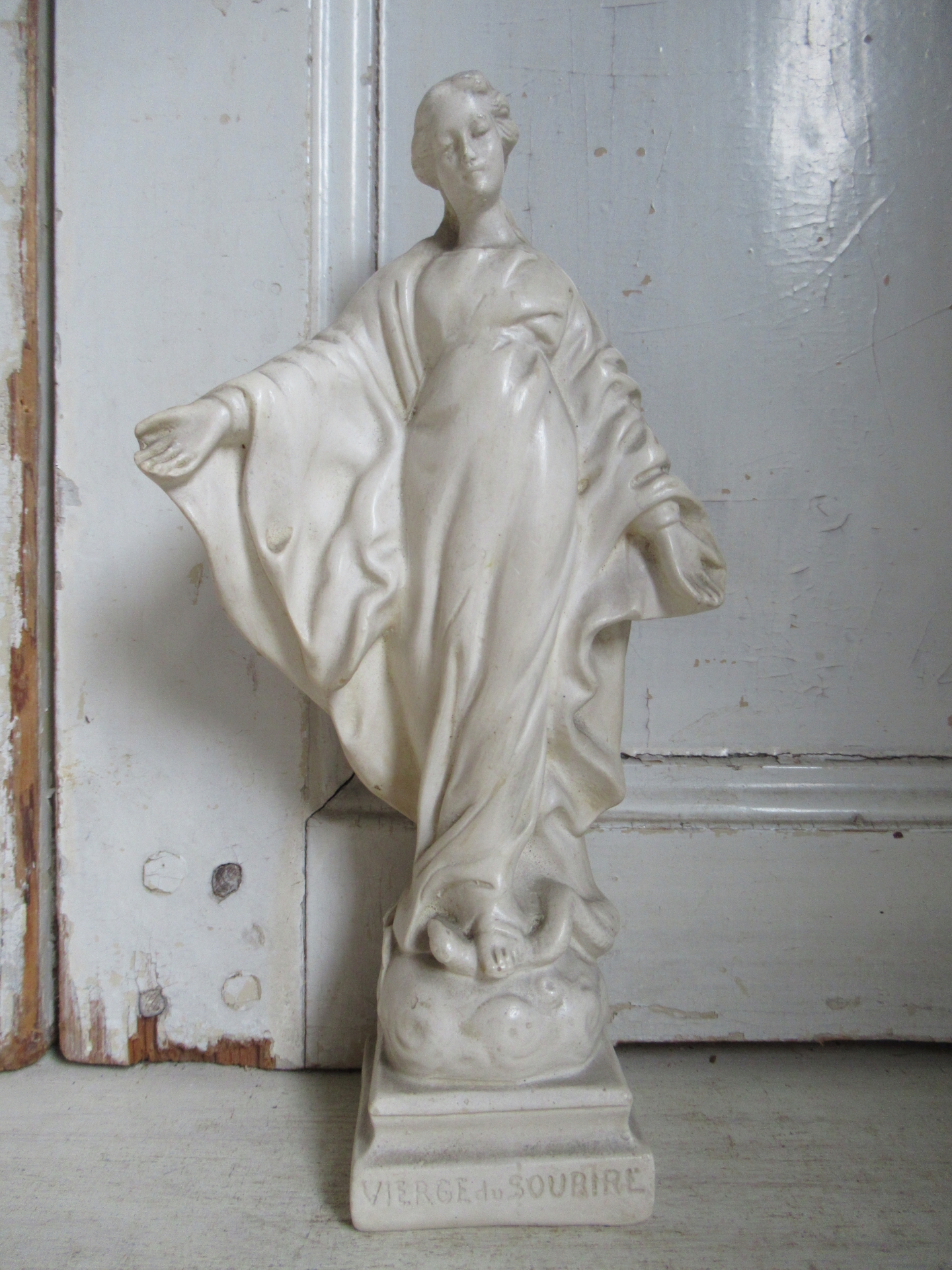 oud Frans heiligen beeldje, Vierge du Sourire (maagd van de glimlach), mist een heel klein schaafje aan de neus, valt nauwelijks op (hoogte 21 cm)