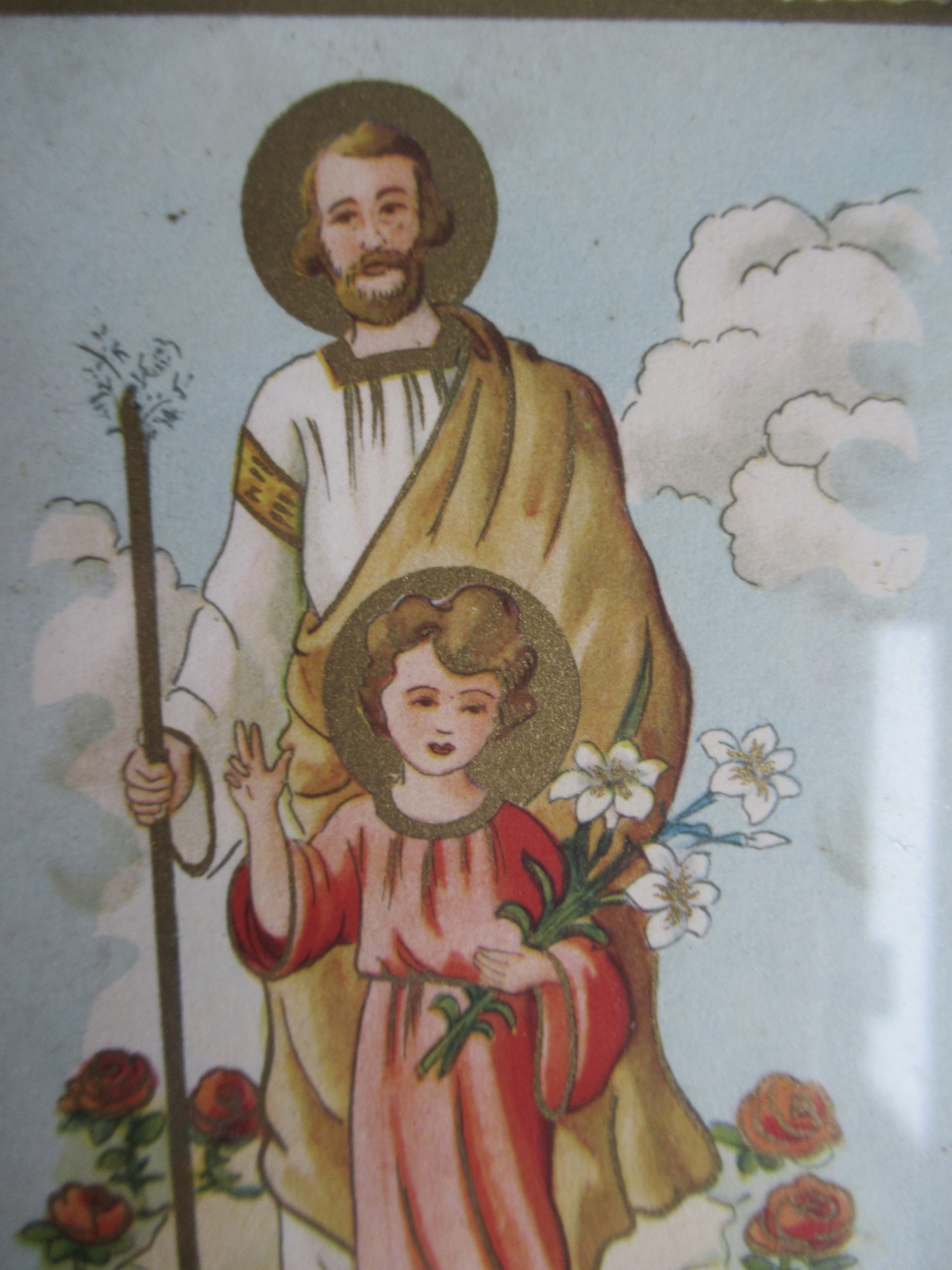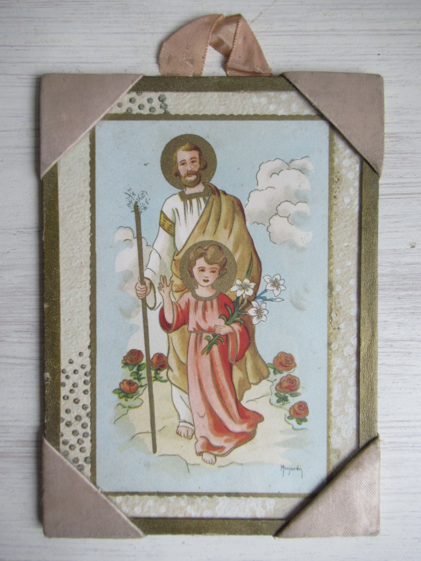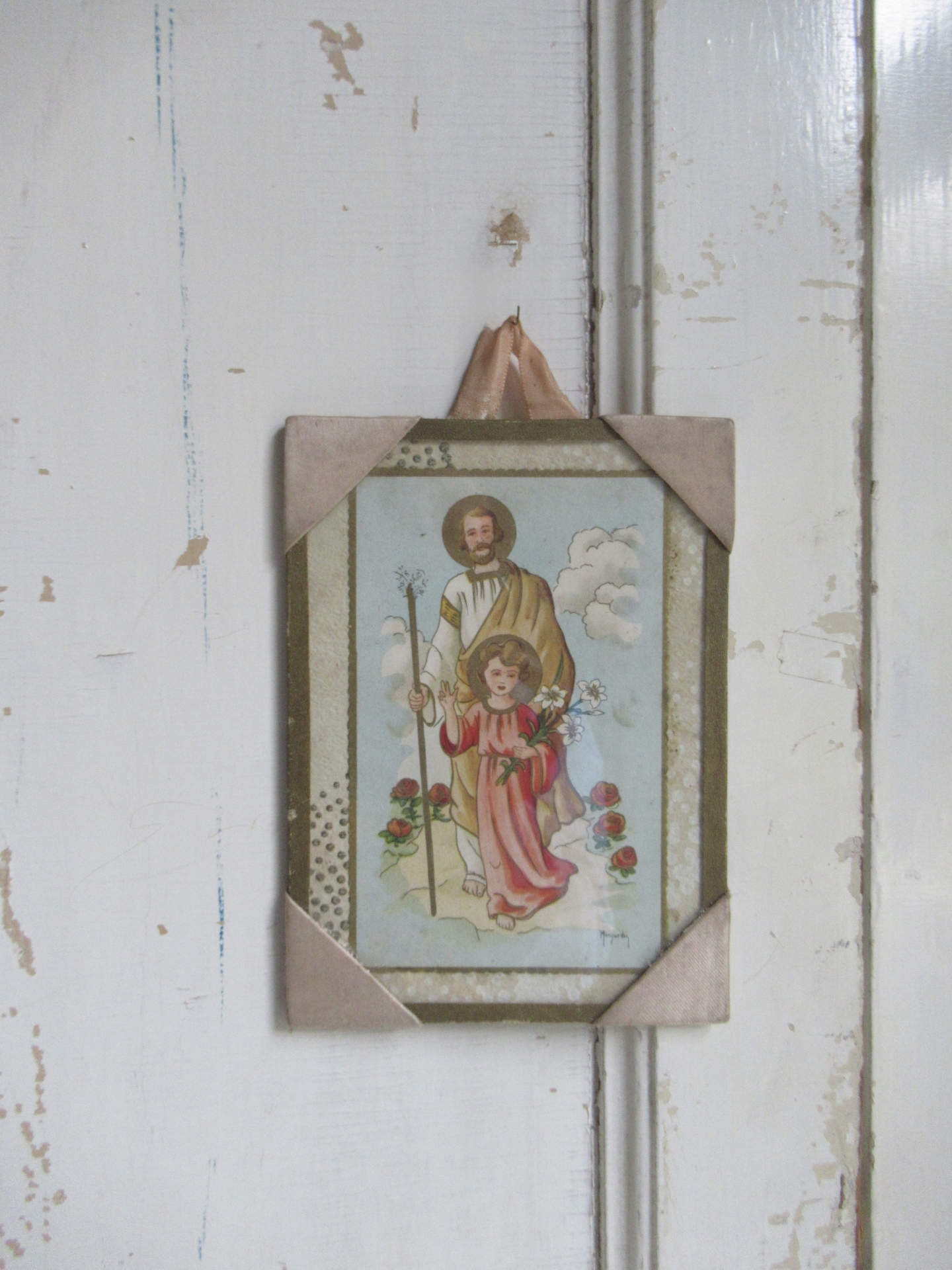 schattig oud Frans heiligenlijstje, prentje achter glas, met lint afgewerkt, achterkant een retro stofje, handwerk (16,5 bij 12,5 cm exclusief ophanglint)