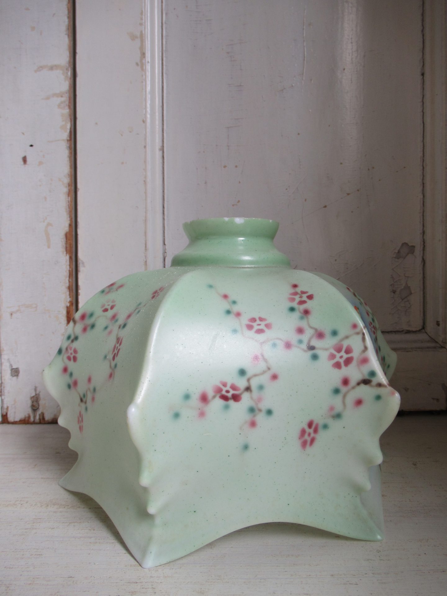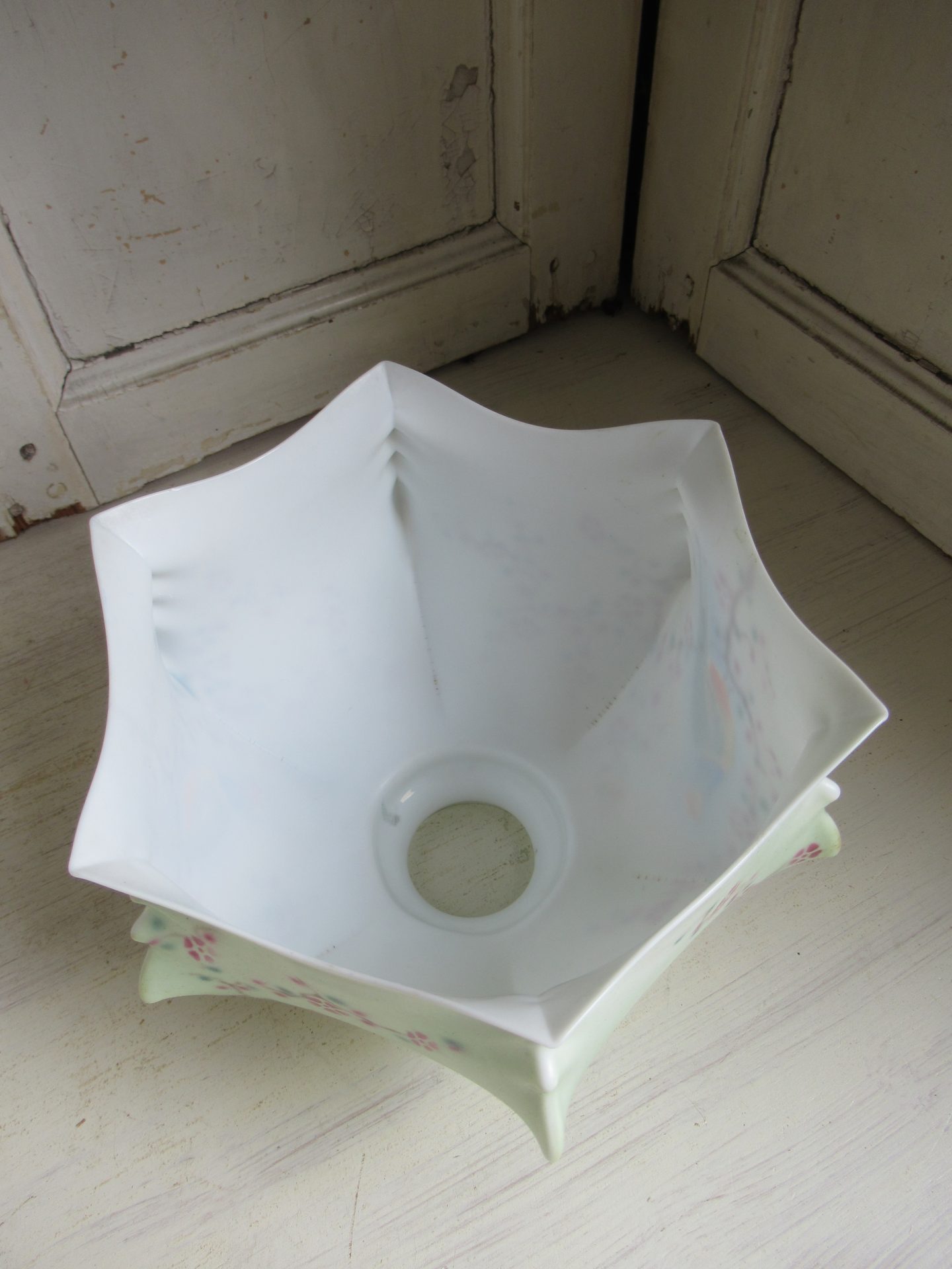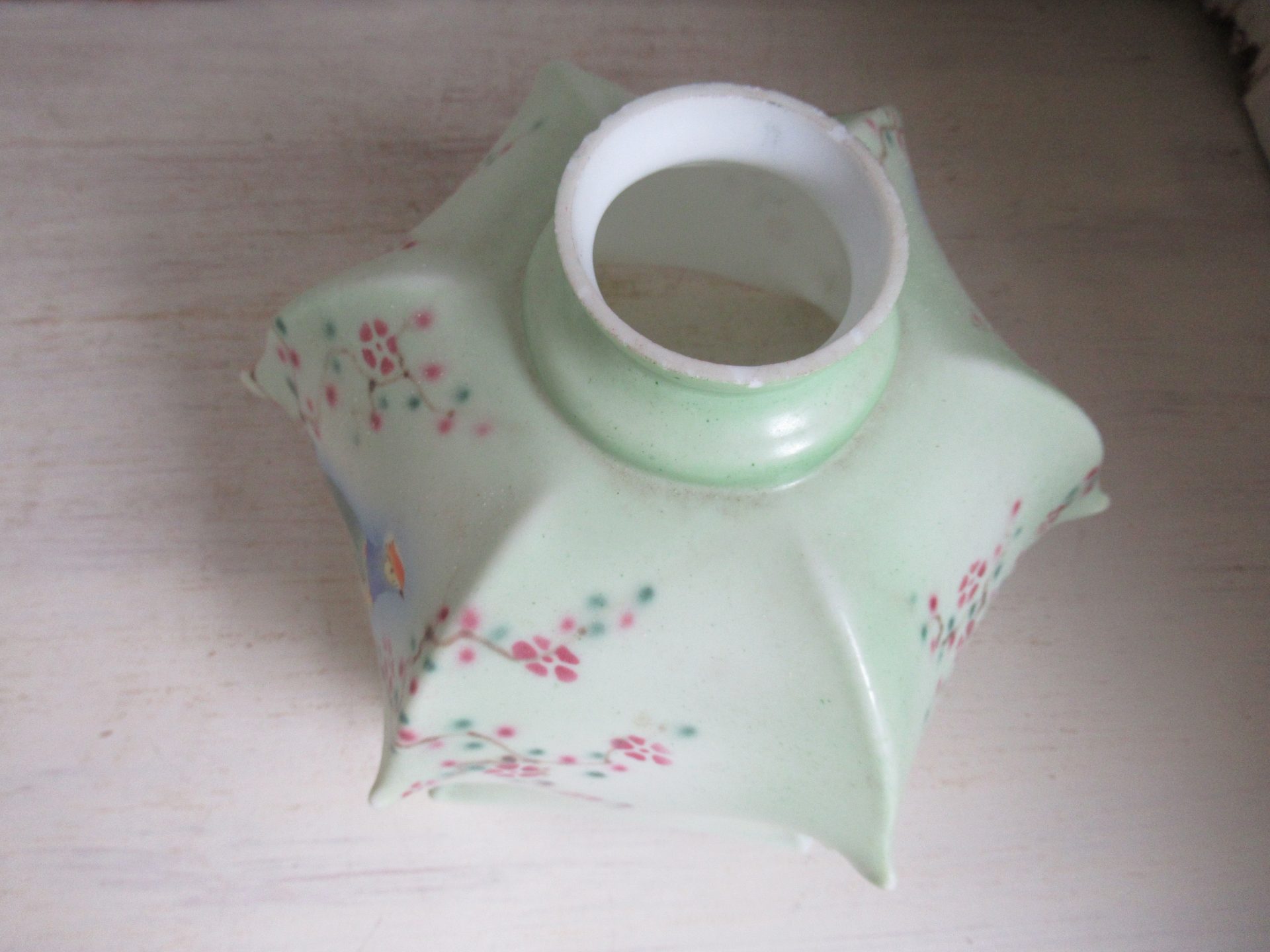 oud Frans lampenkapje, heel bijzonder!, geen fitting etc. maar die zijn eenvoudig online te vinden (doorsnede 20 cm, hoogte 15 cm, doorsnede opening fitting 5,5 cm)