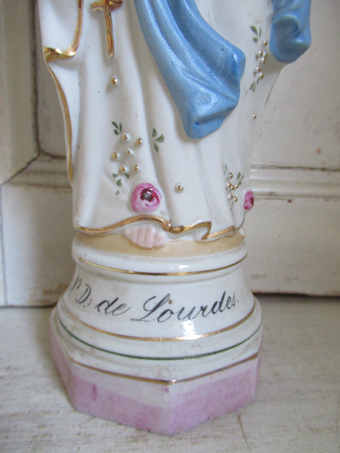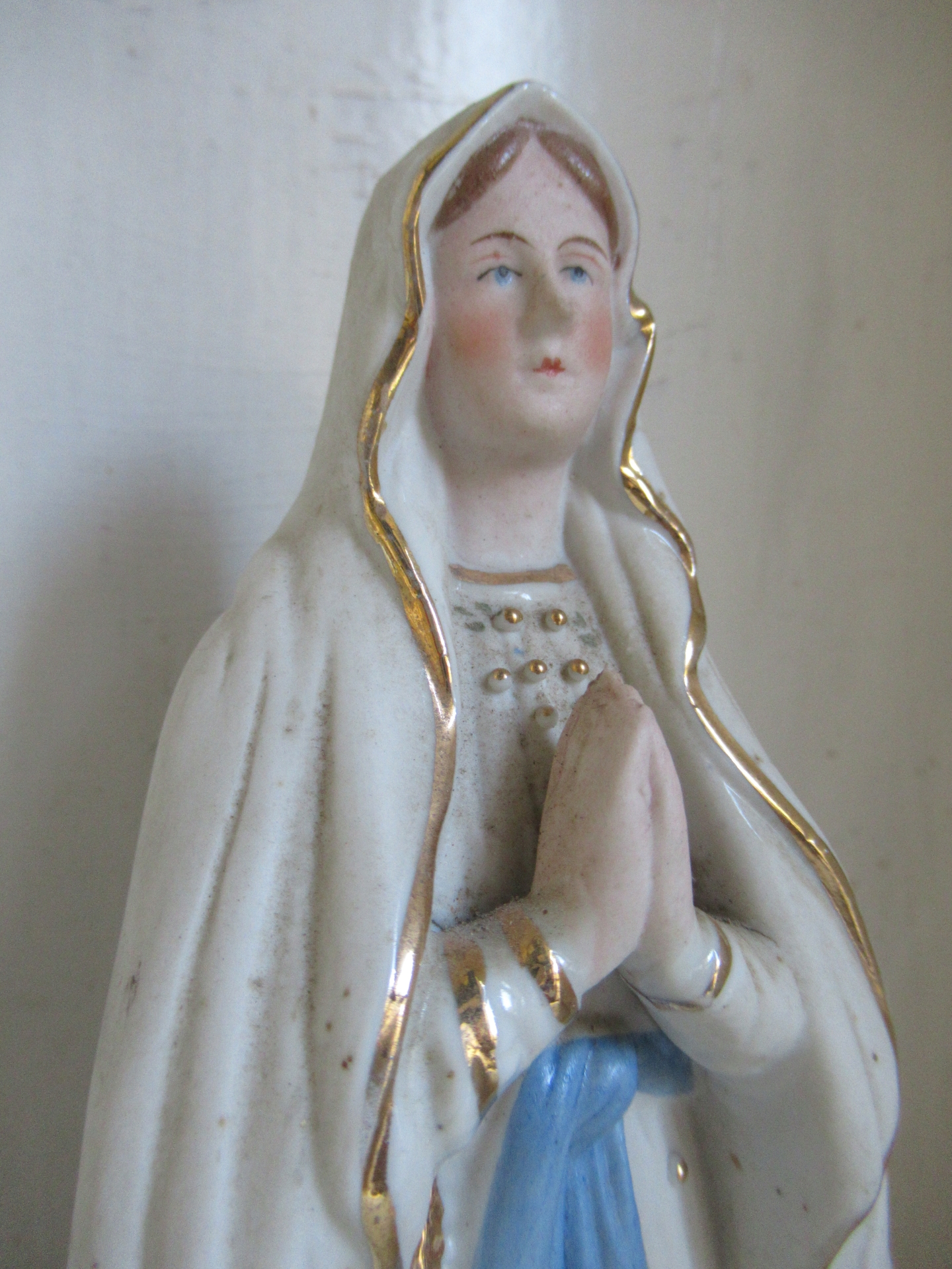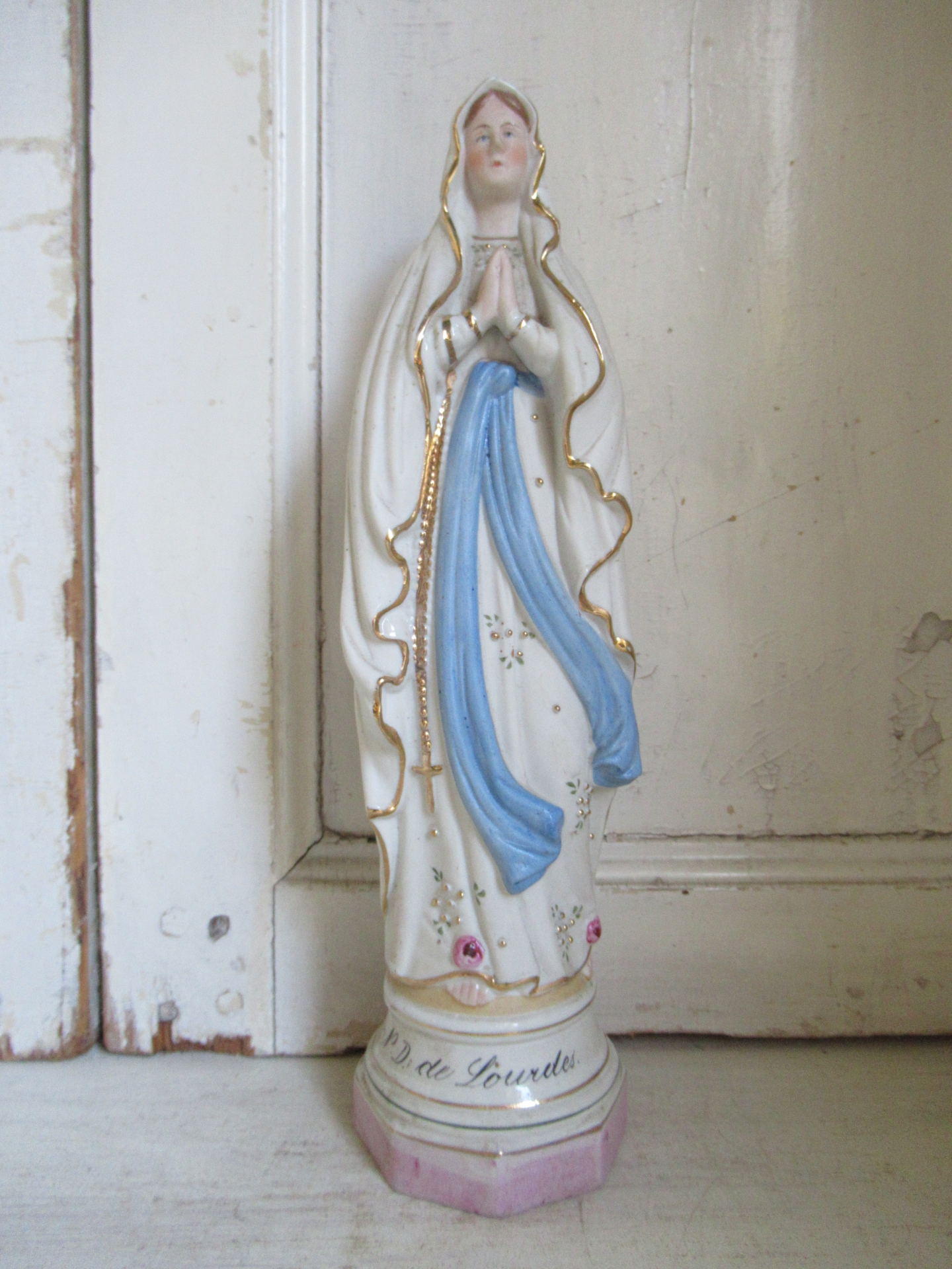 oud Frans Maria beeld, biscuit, goudkleurige en reliëf details, Lourdes (hoogte 30 cm)