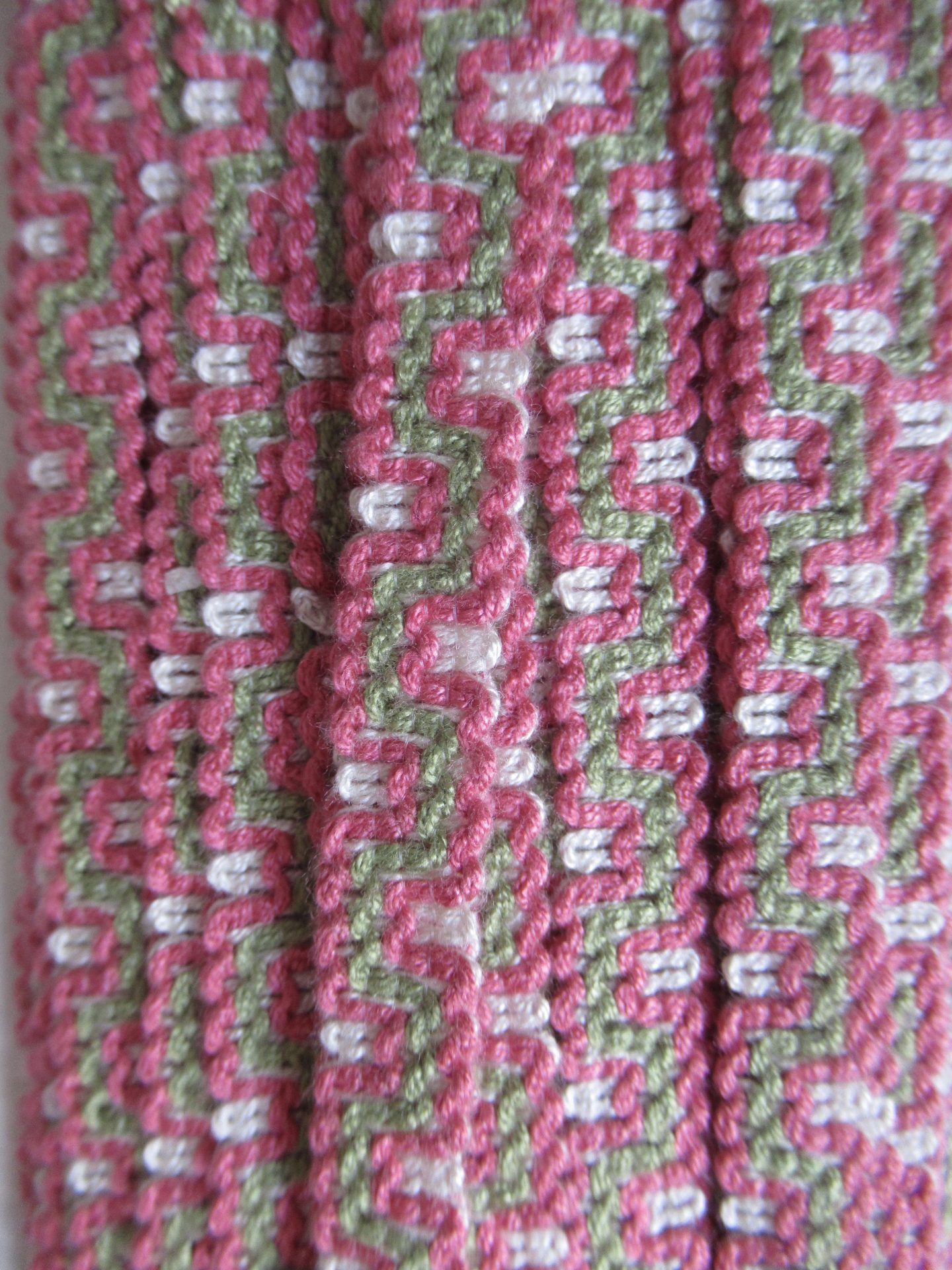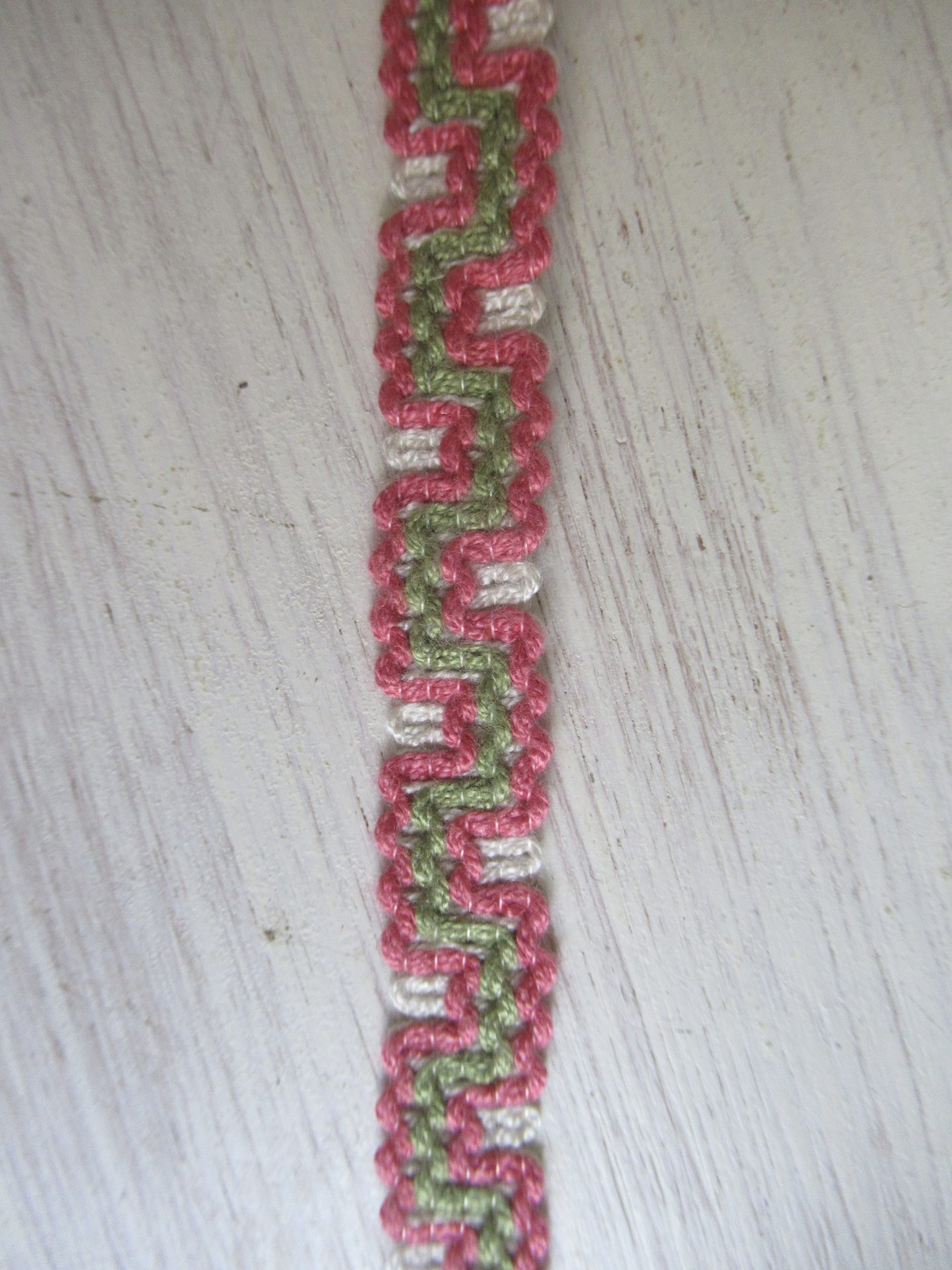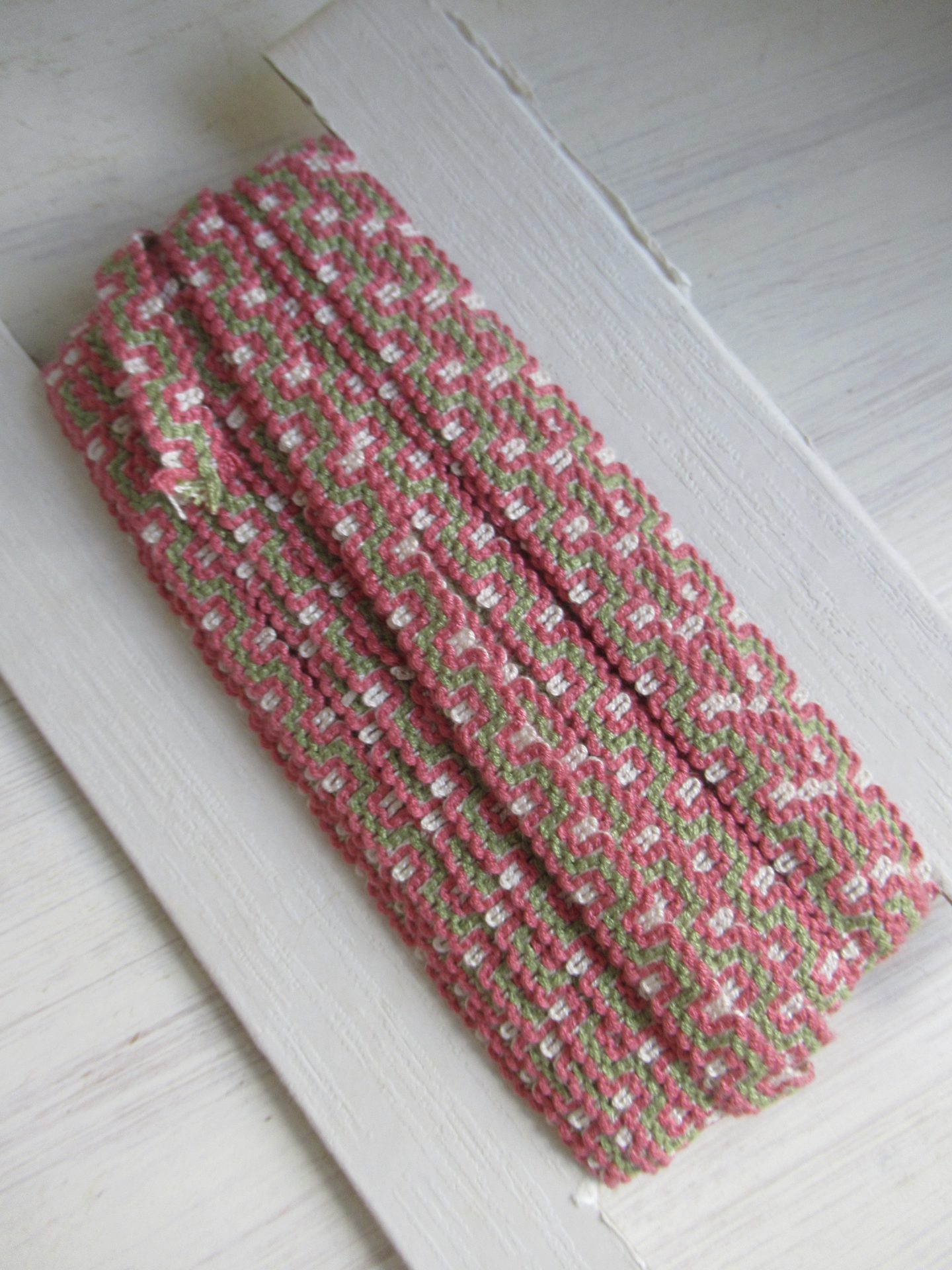 oud geweven band, roze/groen/ecru, meegenomen uit Frankrijk, prijs per meter (breedte 1 cm)