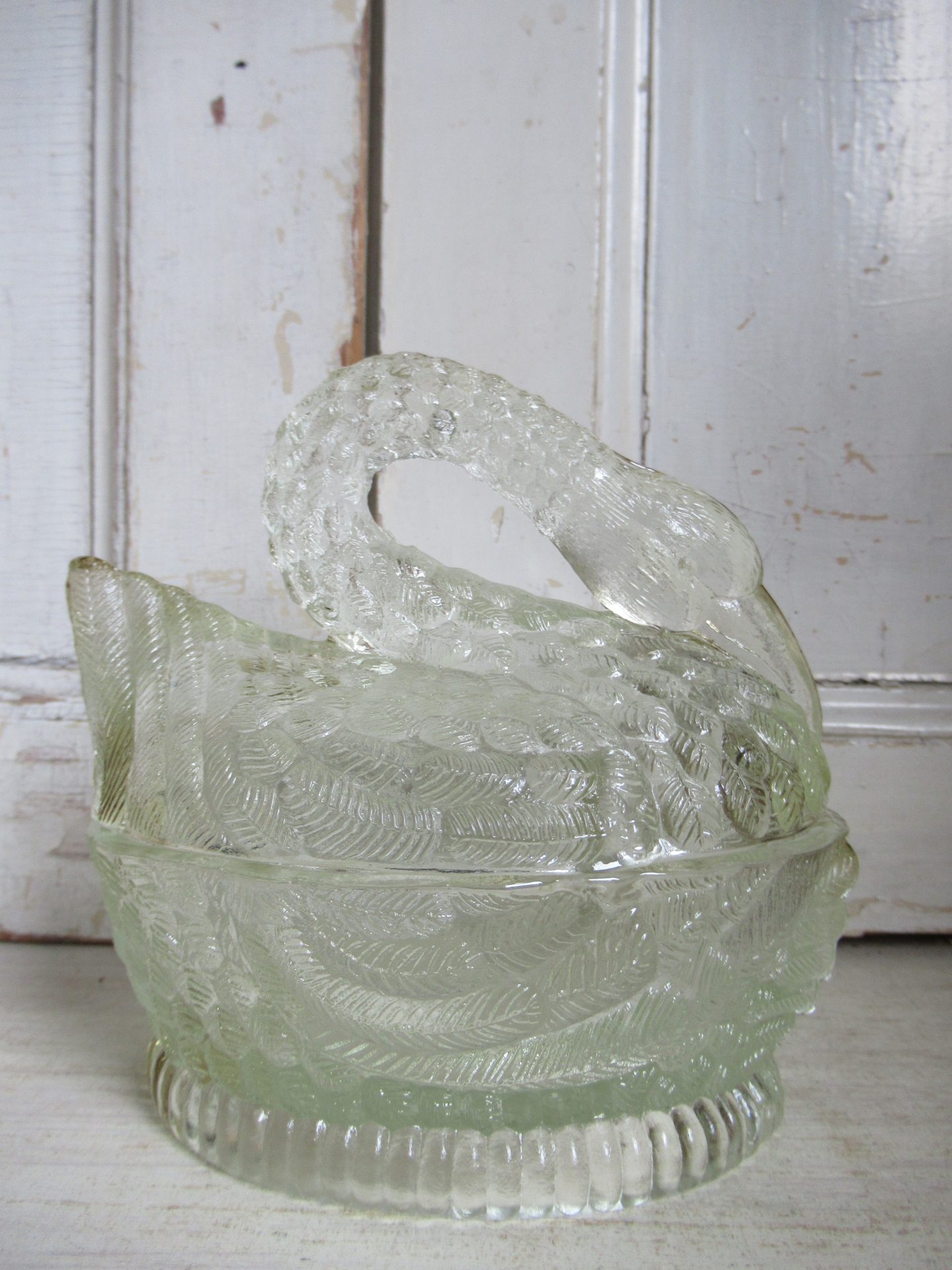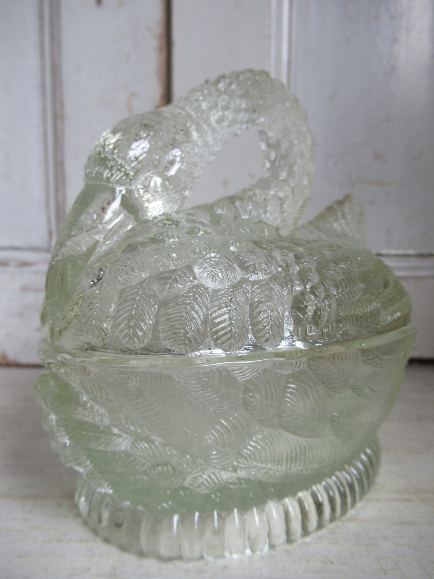 oud glazen bakje, zwaan, meegenomen uit Frankrijk, leuk voor de paaseitjes, als botervloot, bijvoorbeeld (14 bij 10 cm, hoogte 14 cm)