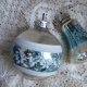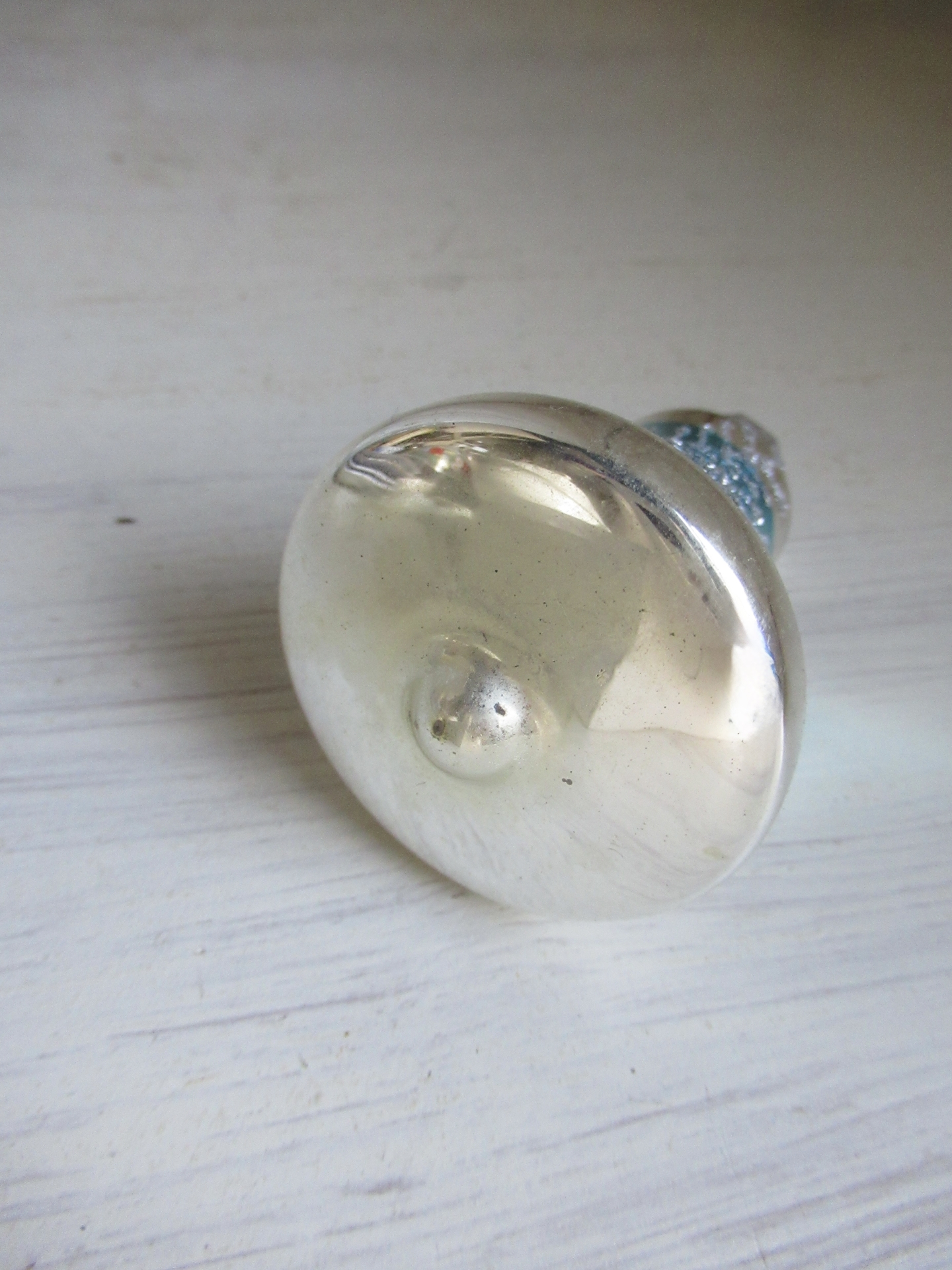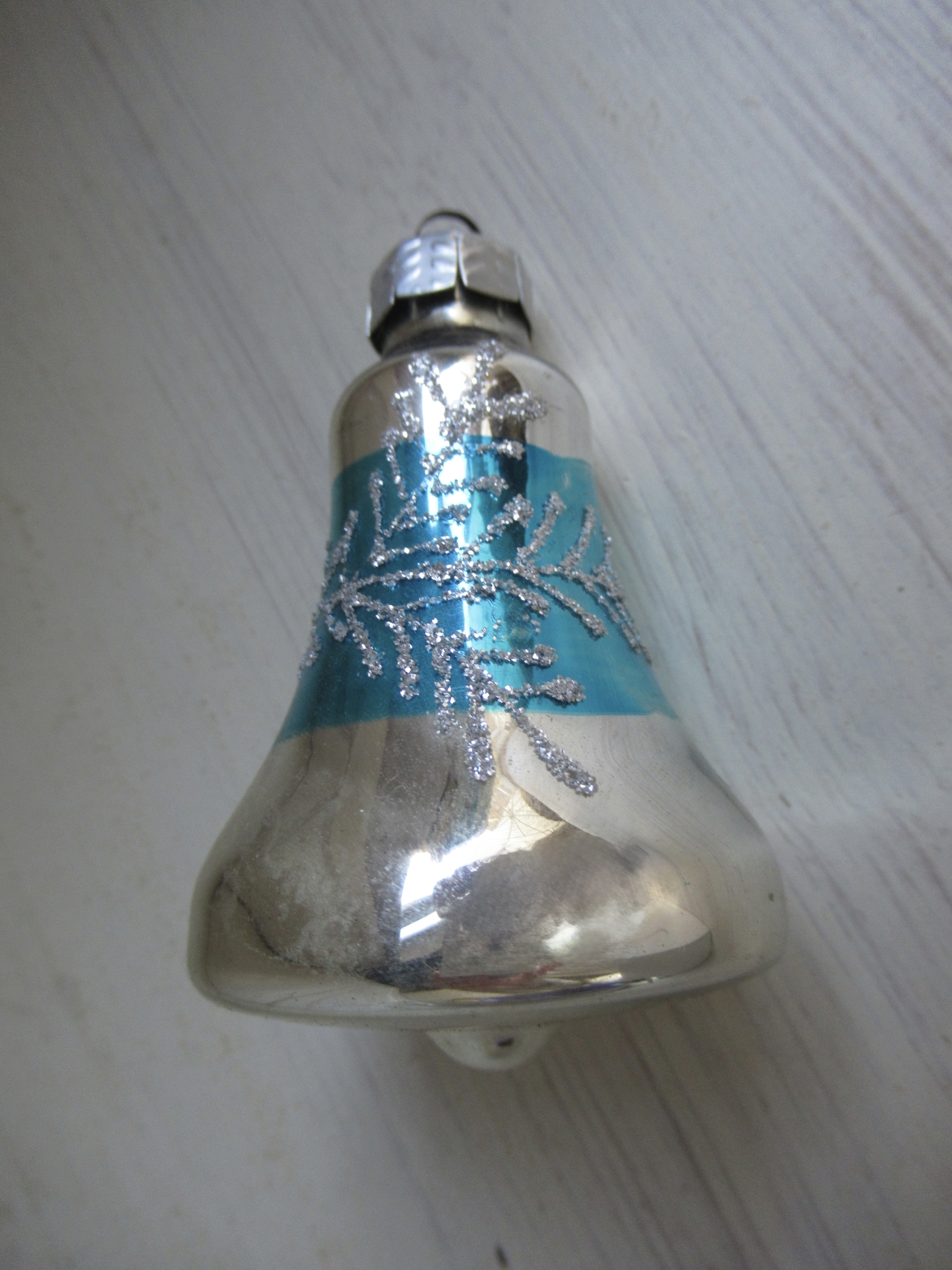 oud kerstklokje, zilverkleurig met turquoise streep en glitter dennentakjes (lengte 8 cm)