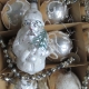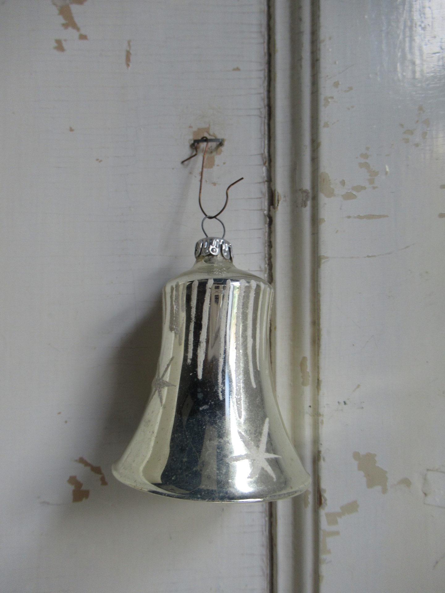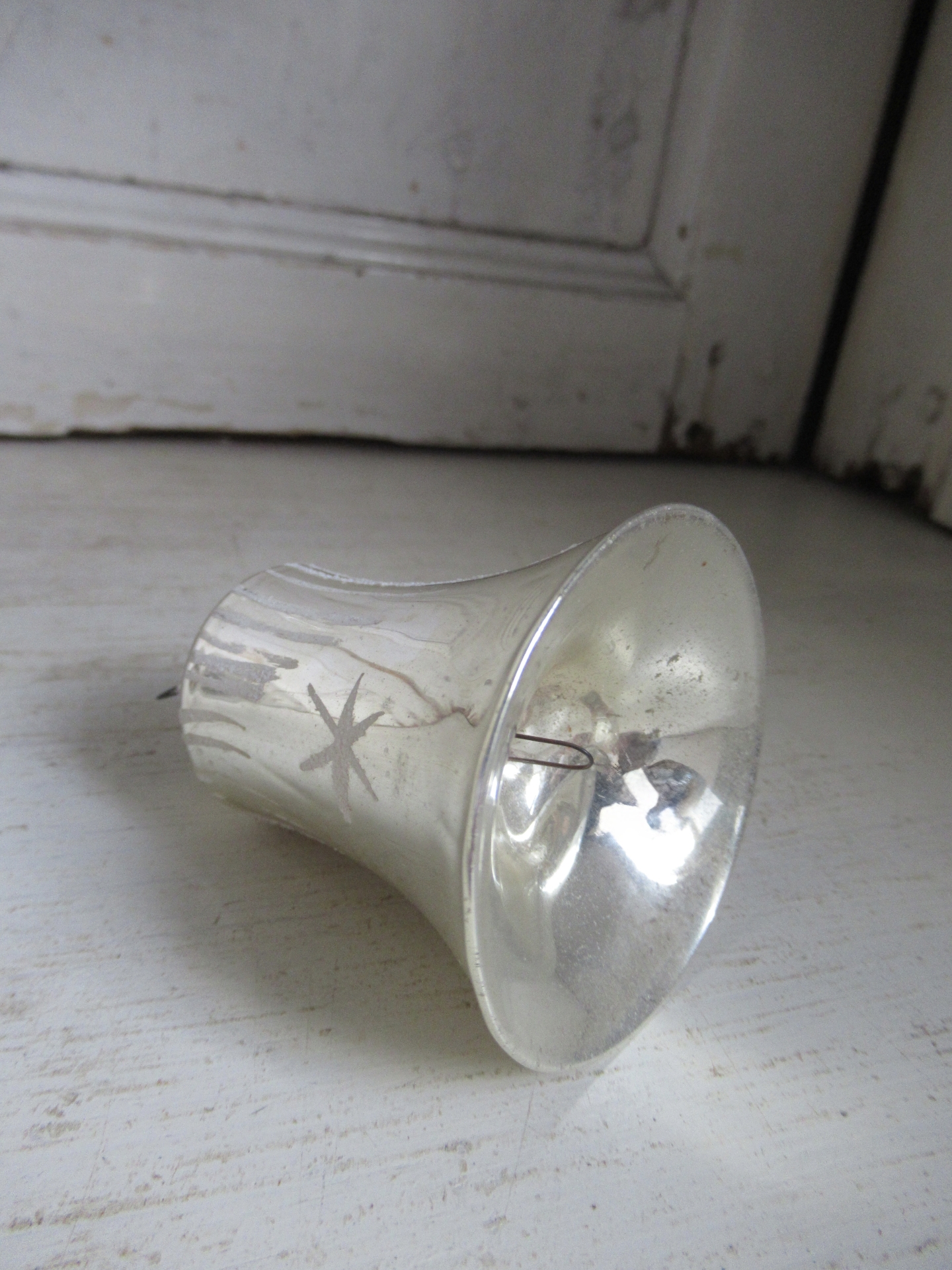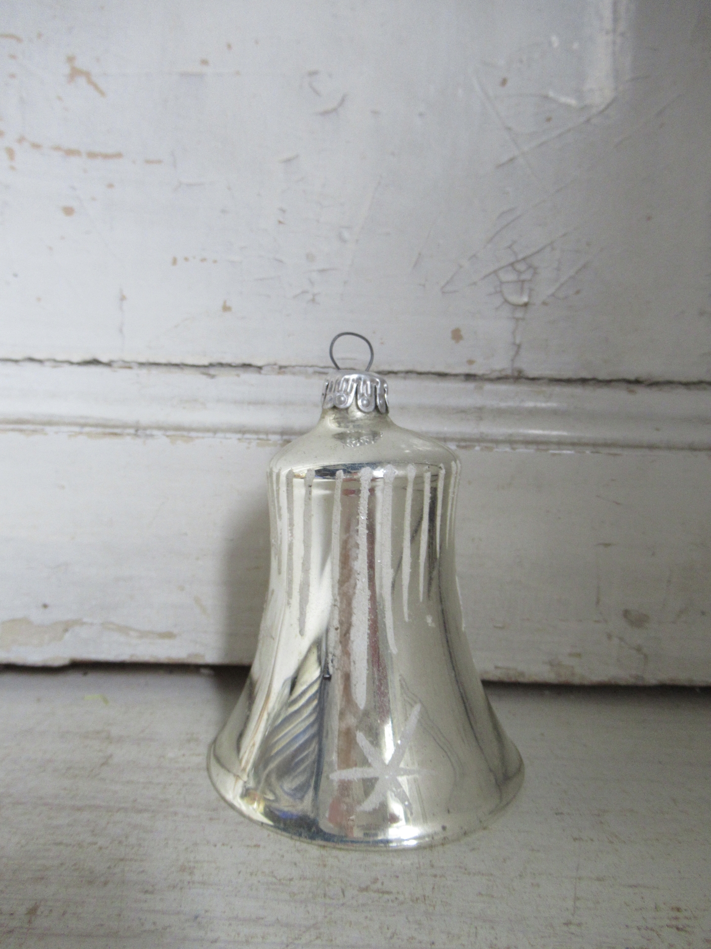 oud kerstklokje, groter model, zilverkleurig met ‘sneeuw’ sterretjes en strepen, klepeltje ontbreekt (hoogte 7,5 cm)