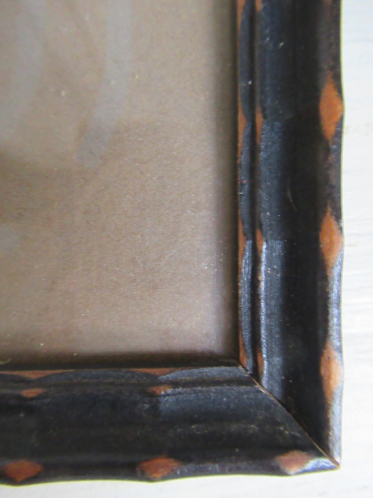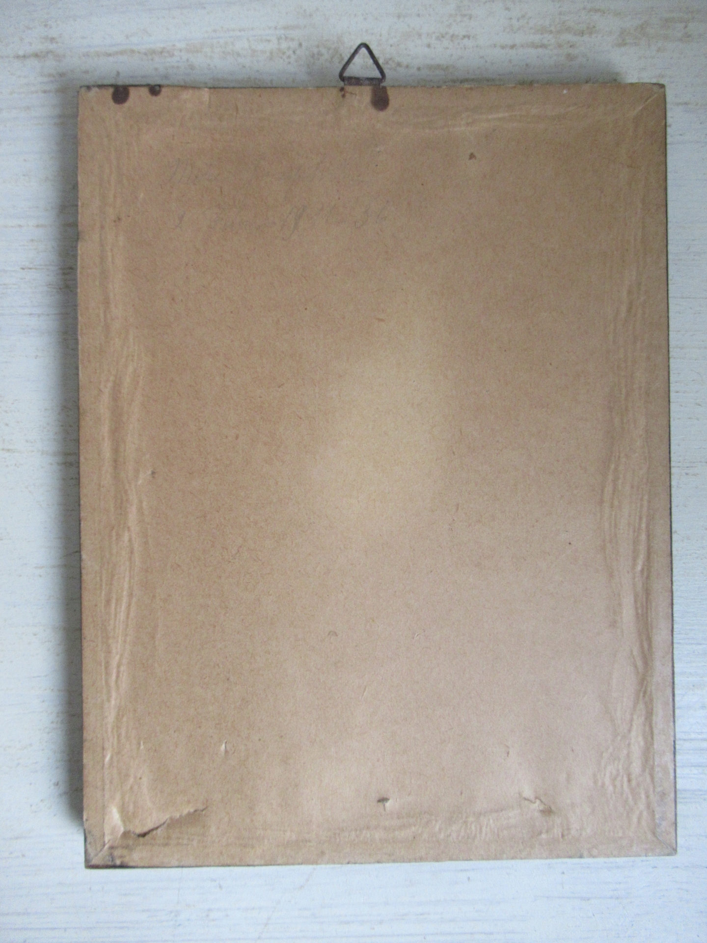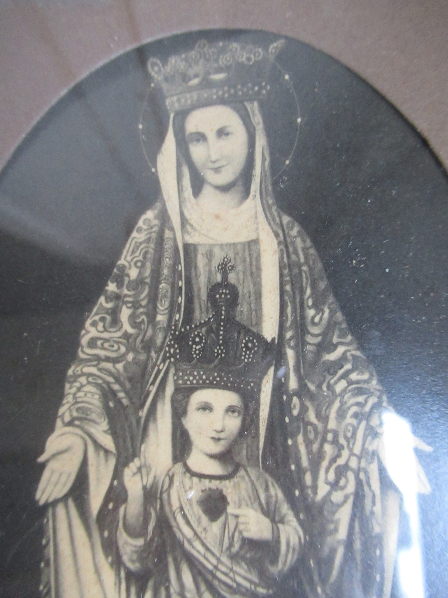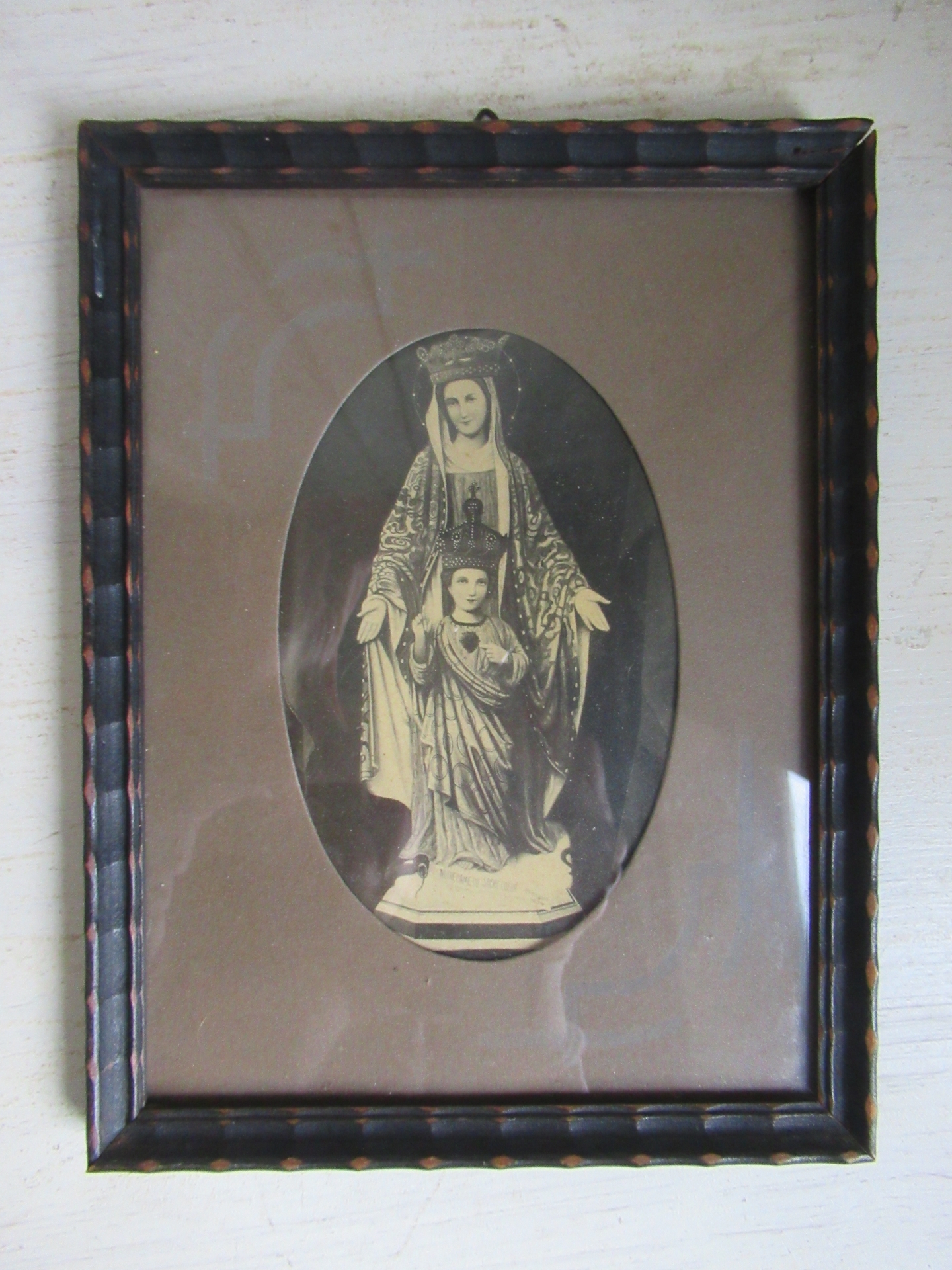 oud lijstje met heiligenafbeelding in passe partout, meegenomen uit Frankrijk (22 bij 17 cm)