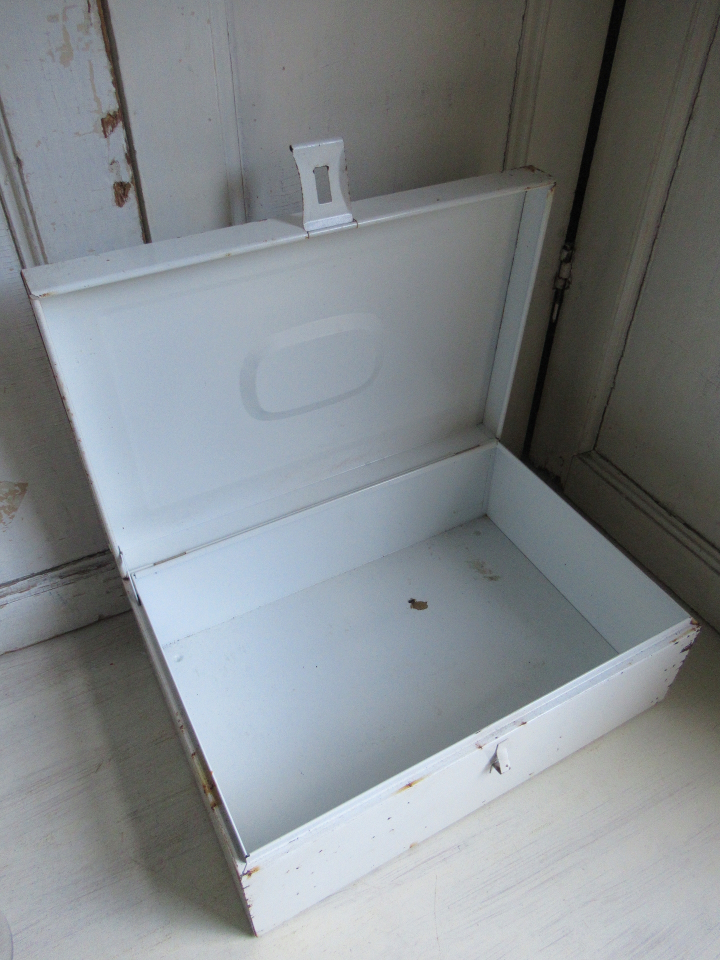 oud metalen blik, wit met lichte roestplekjes, ik vind dat juist mooi bij dit blik (36,5 bij 25 cm, hoogte 13 cm exclusief handvat)