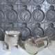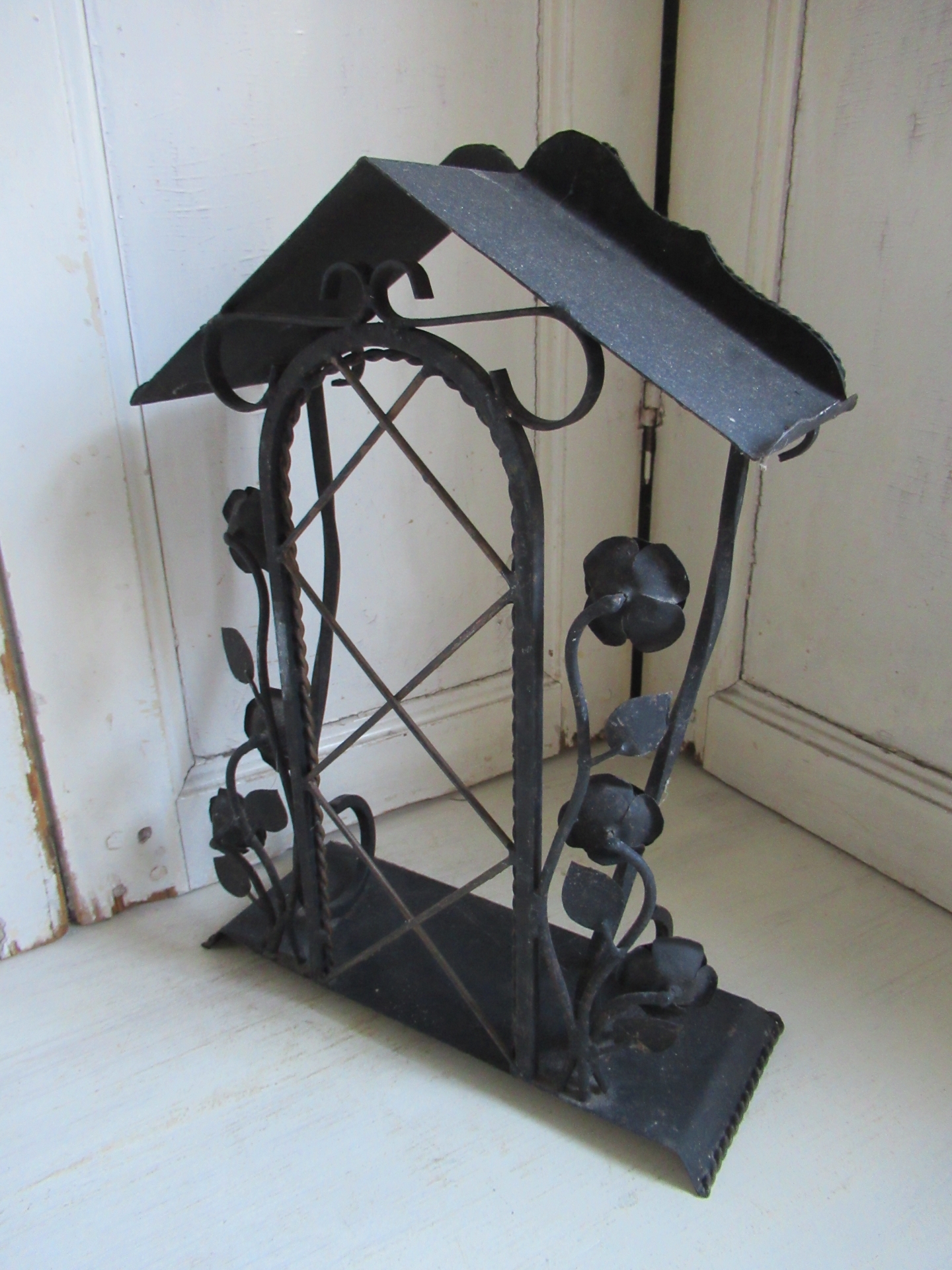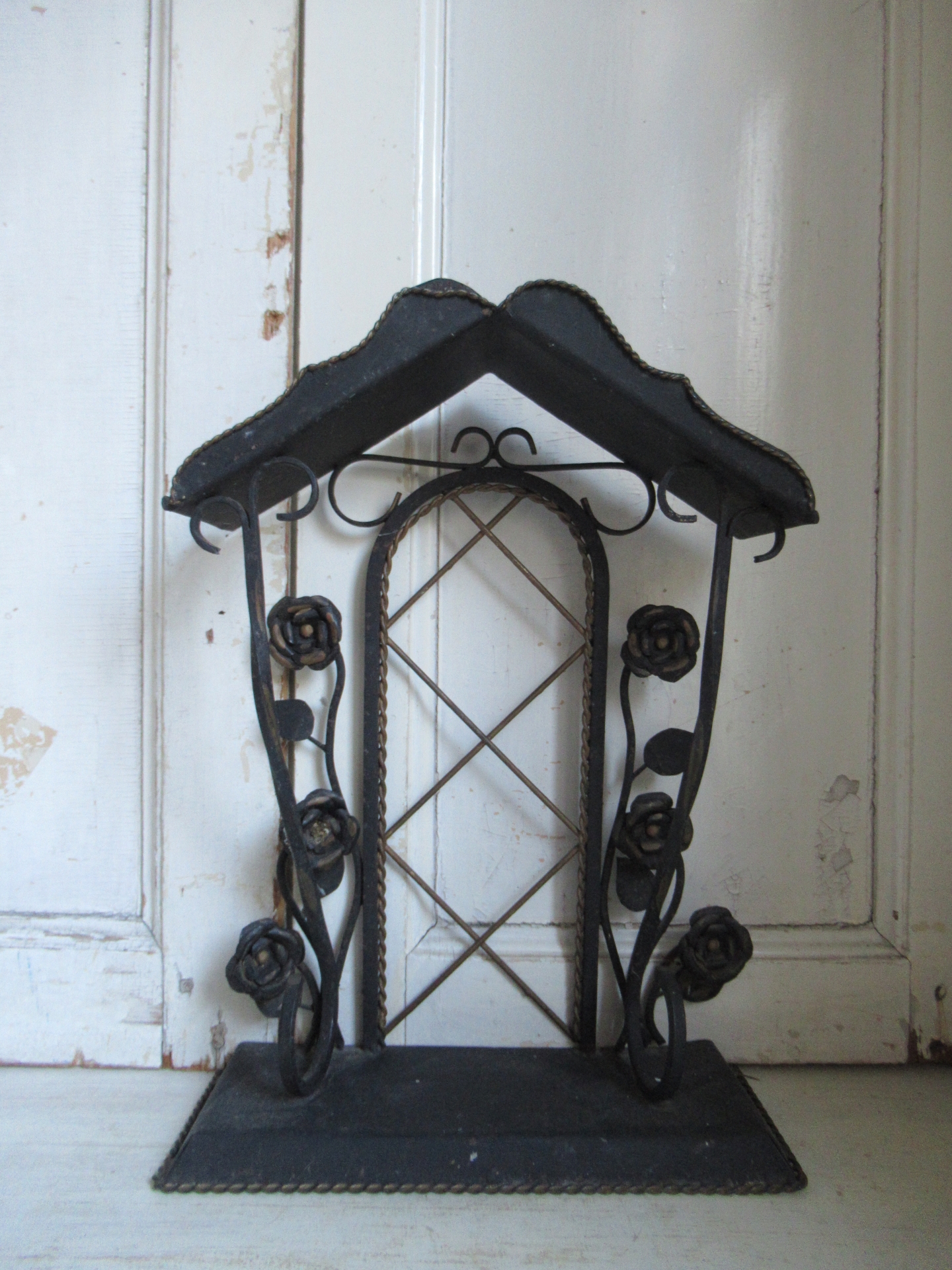 oud metalen kapelletje, met bloemen, ook leuk te gebruiken als kerststal (36 cm hoog, 26 cm breed en 10 cm diep)