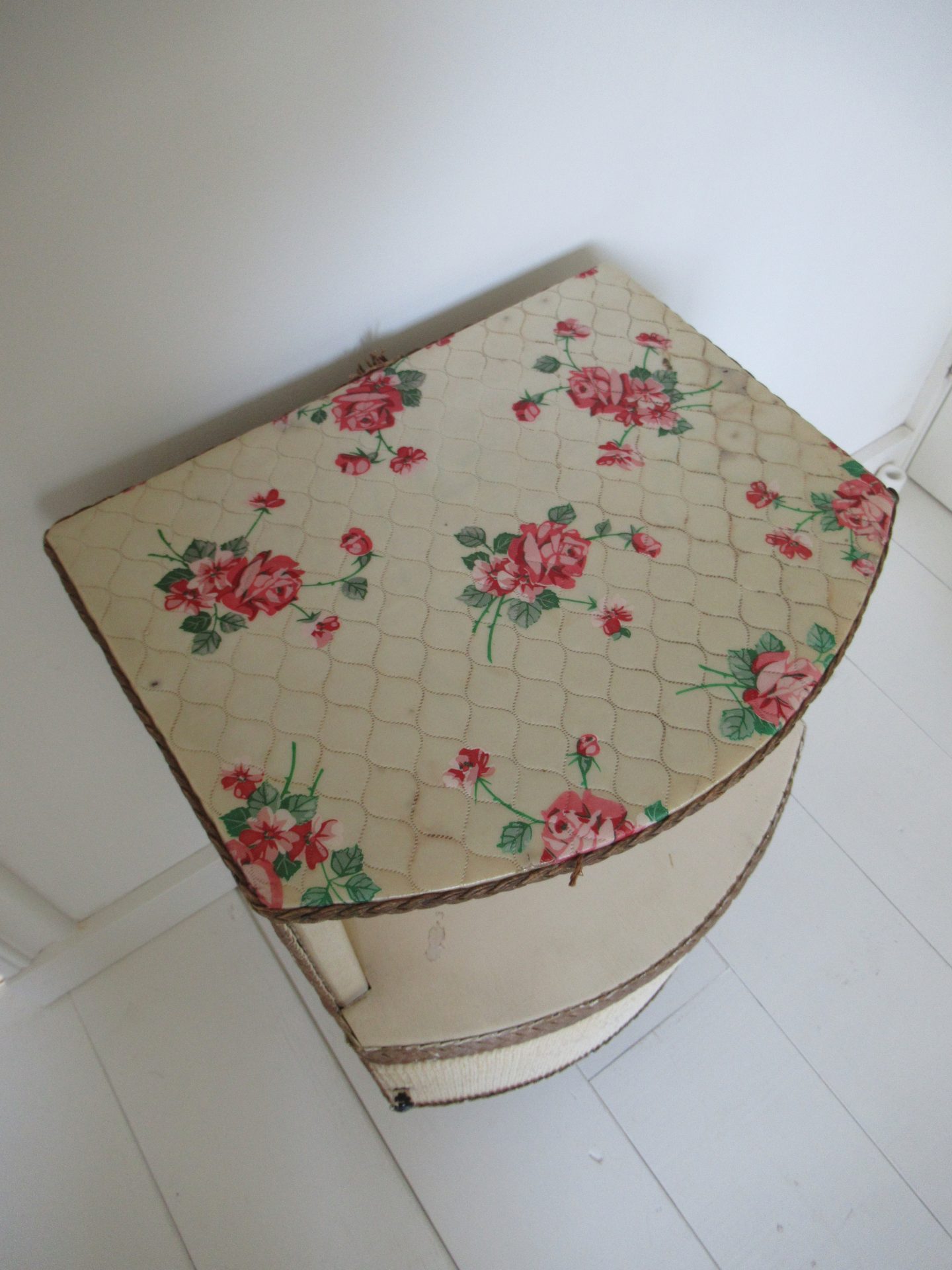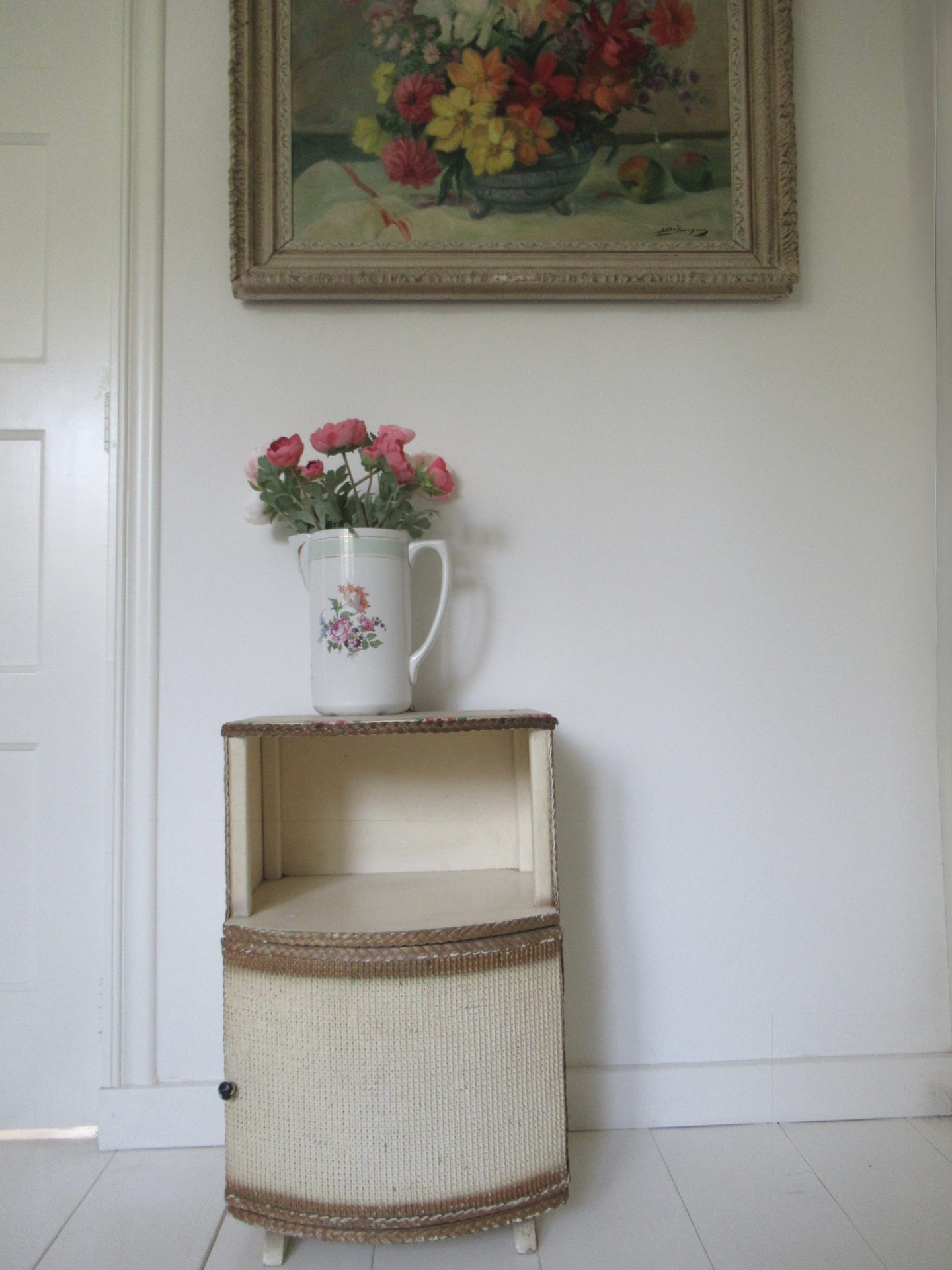oud nachtkastje, Lloyd Loom, meegenomen uit Engeland (