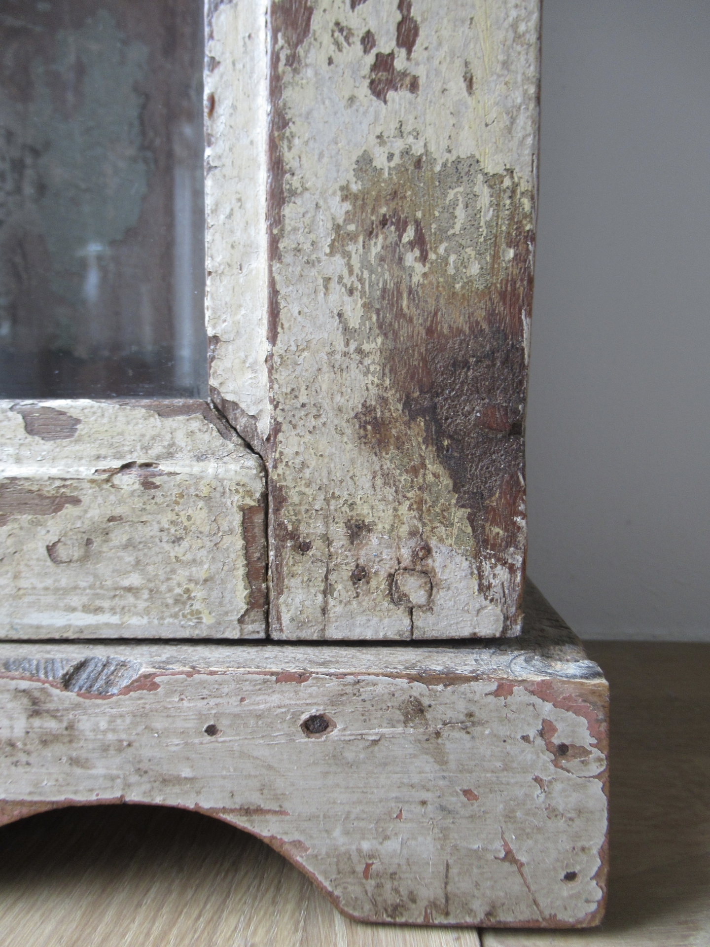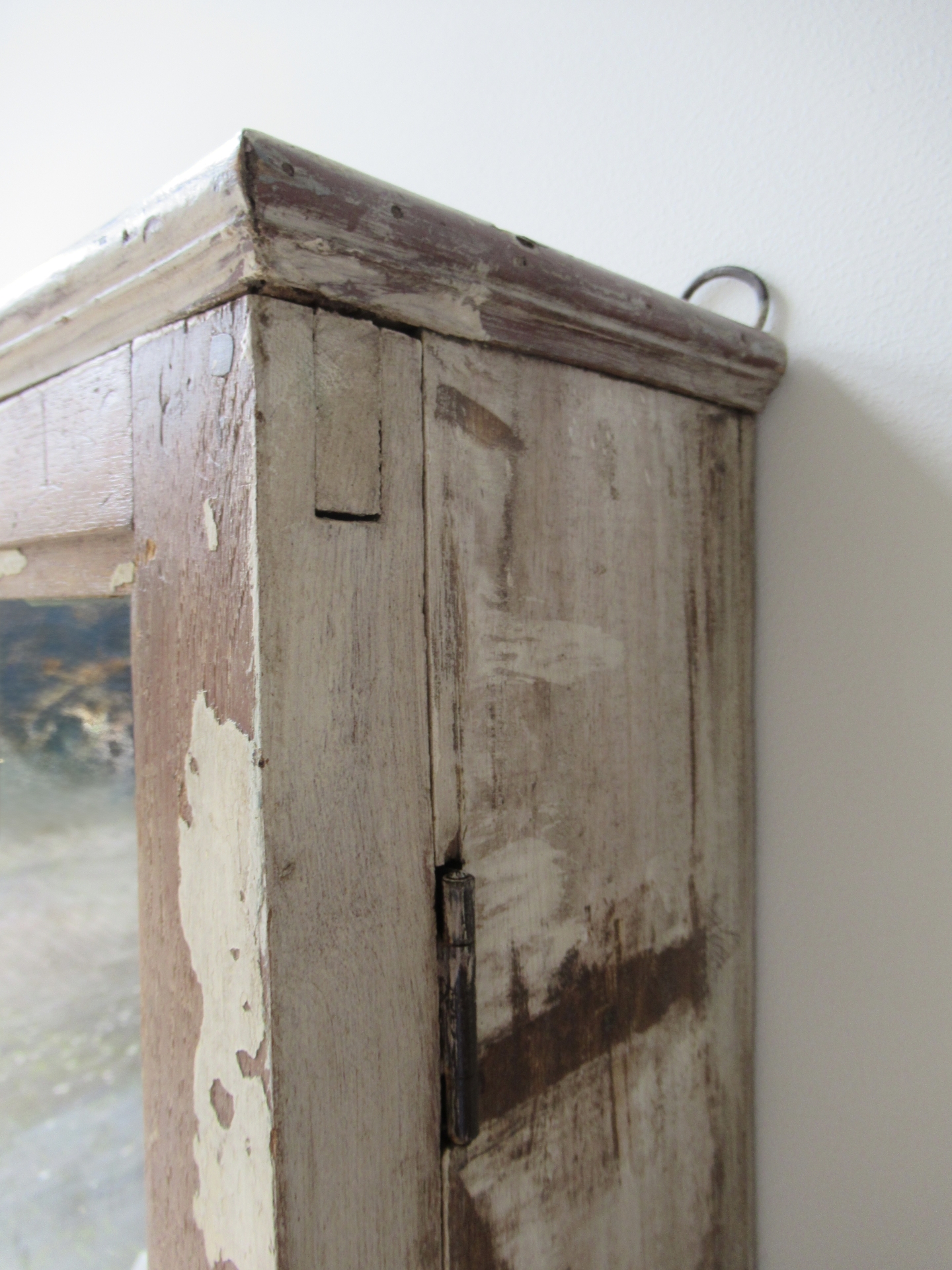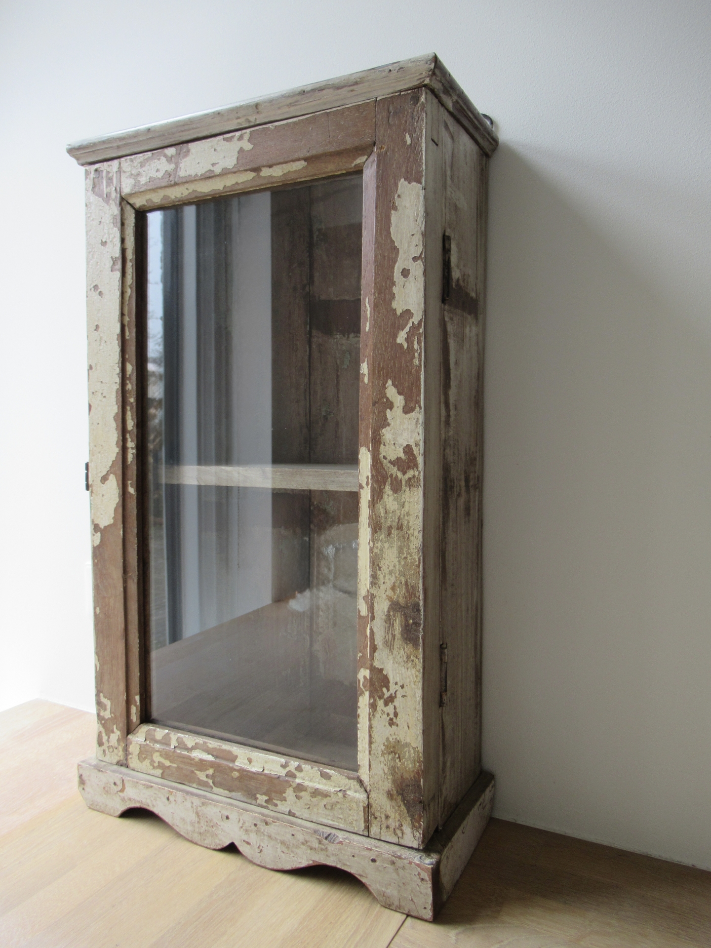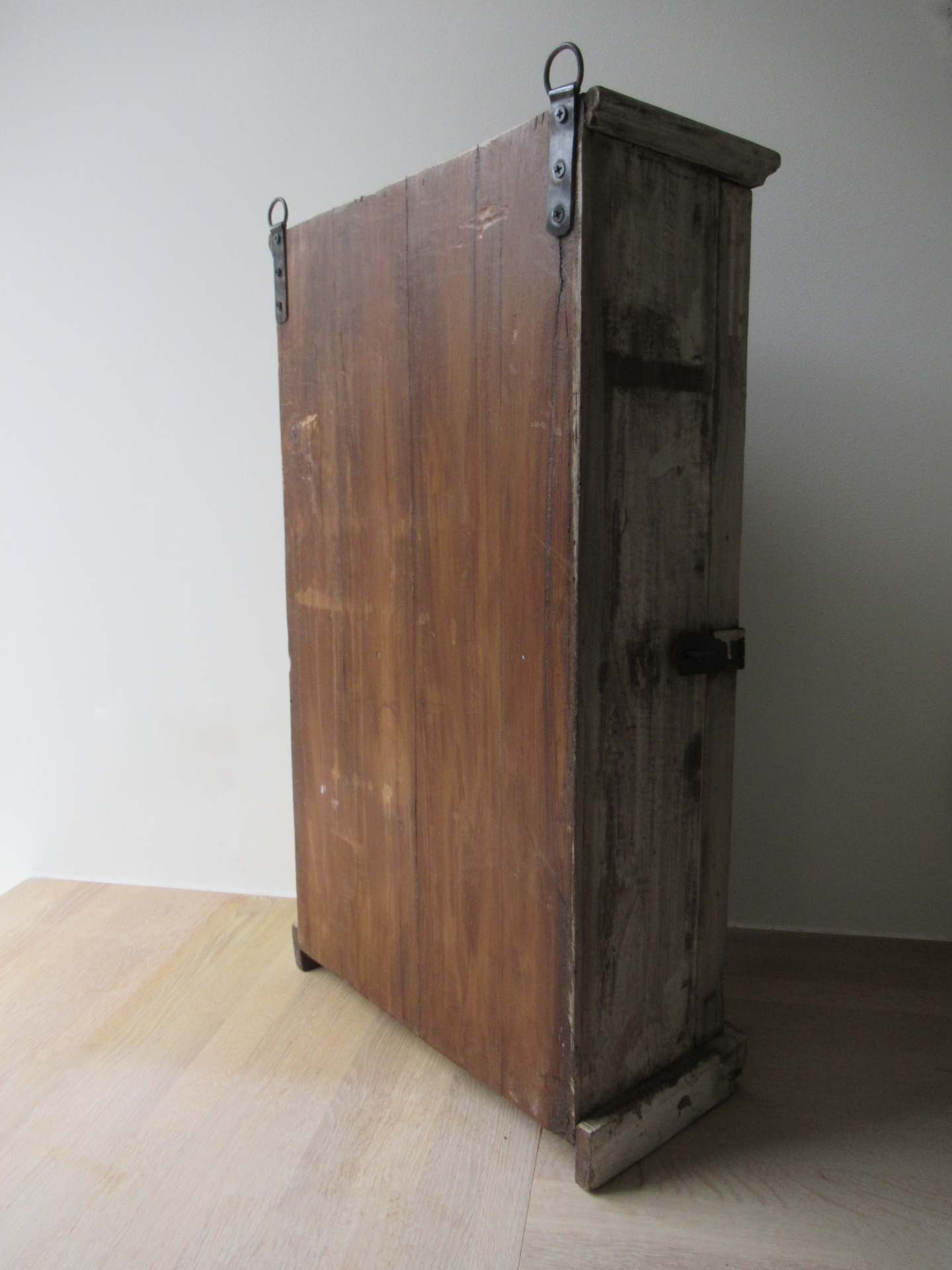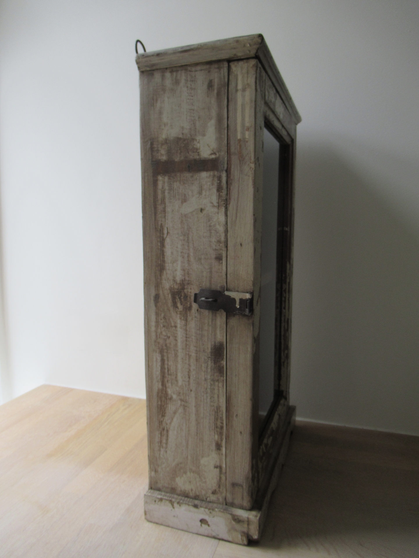 vitrinekastje, nieuw gemaakt van oud hout, denk ik, prachtige oude uitstraling, de scharnieren en ophang-ogen lijken nieuw, kan zowel hangen als staan, maar als het kastje staat kan het deurtje niet open staan, omdat het kastje dan topzwaar wordt en omvalt (