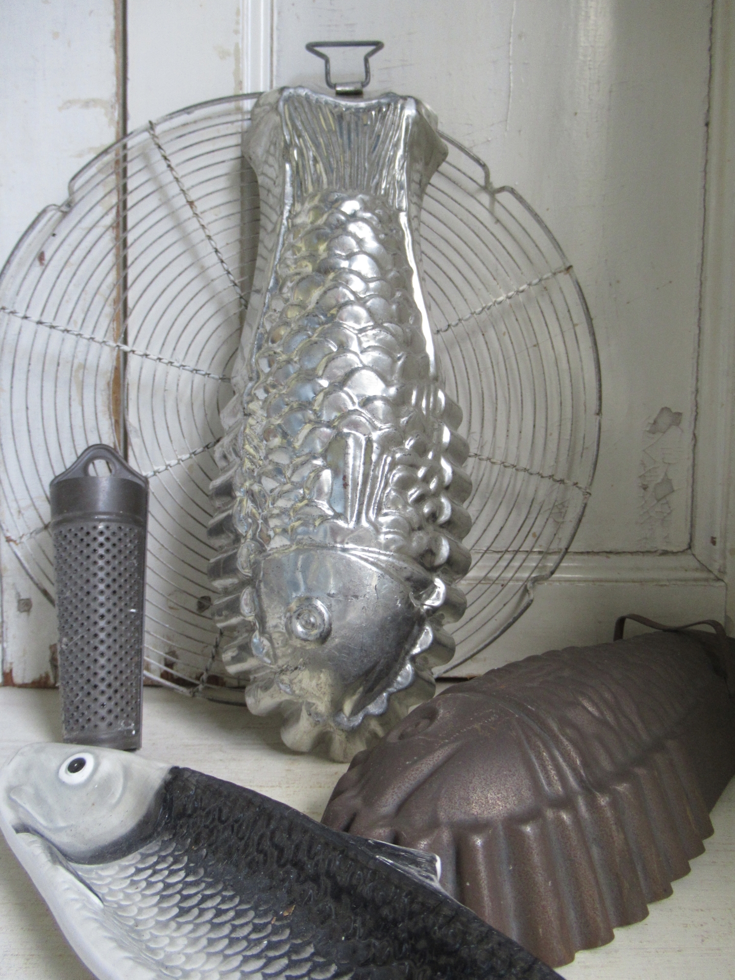 oude bakvorm, vis, kan hangen (31 bij 11,5 cm)