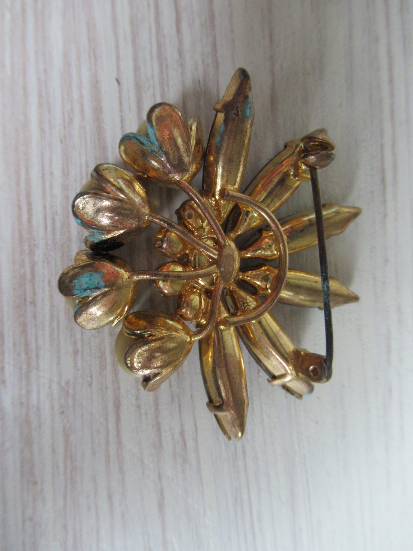 oude broche, prachtig, maar heeft wat verweerde plekjes op het metaal, dat is waarschijnlijk met wat geduld wel voorzichtig te verwijderen, sluiting is niet heel stevig (5 bij 4,5 cm)