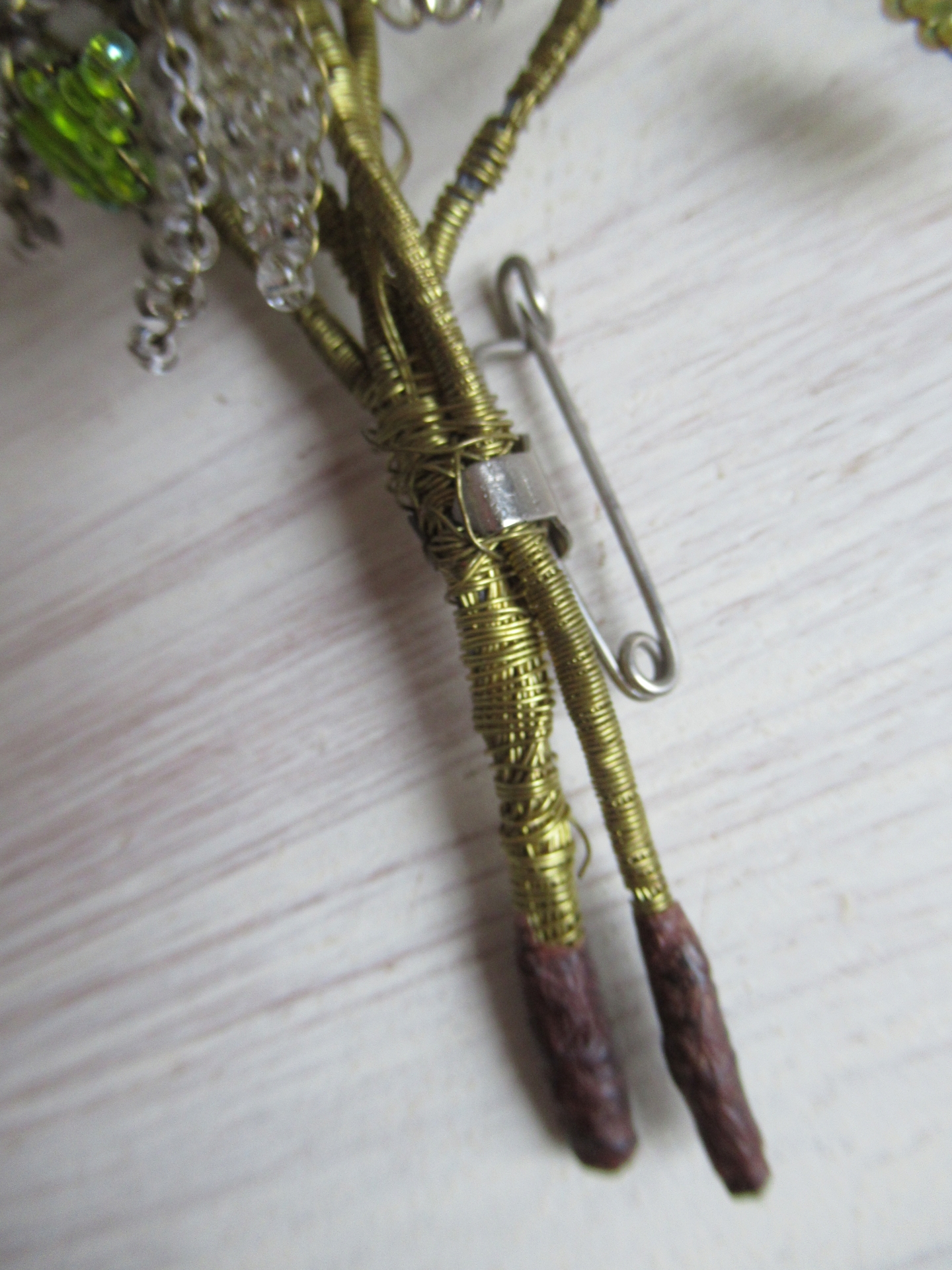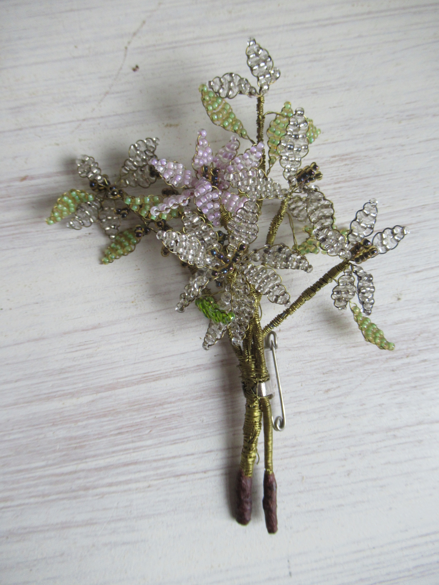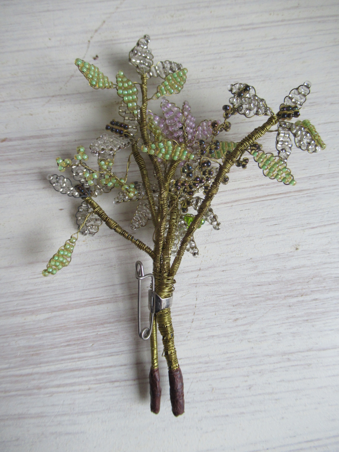 oude broche, bundeltje kralentakjes, lichtgroene, lichtroze, zwarte en zilverkleurige kraaltjes, de takjes zijn met gouddraad omwikkeld, schattig! (lengte 12 cm)
