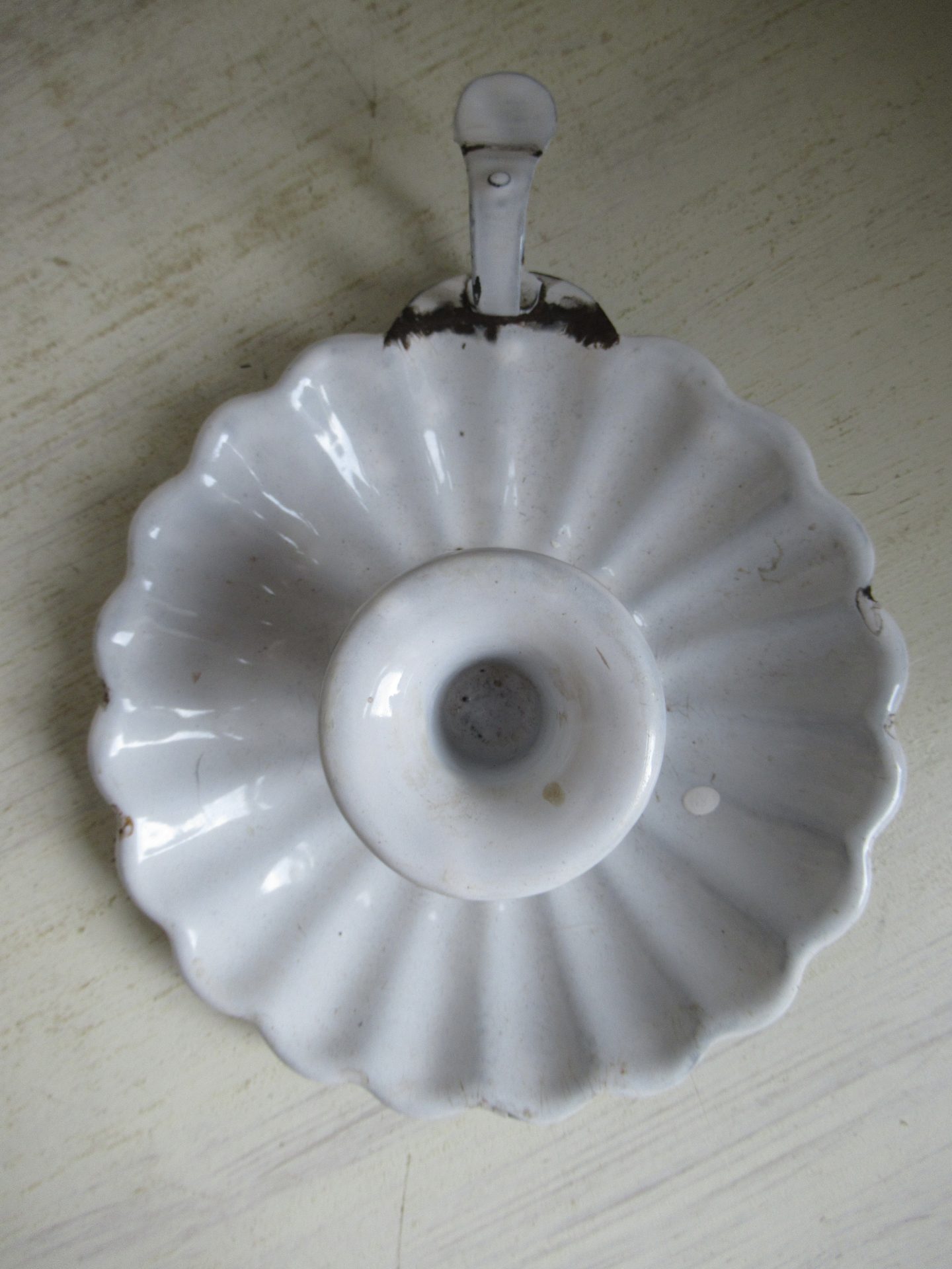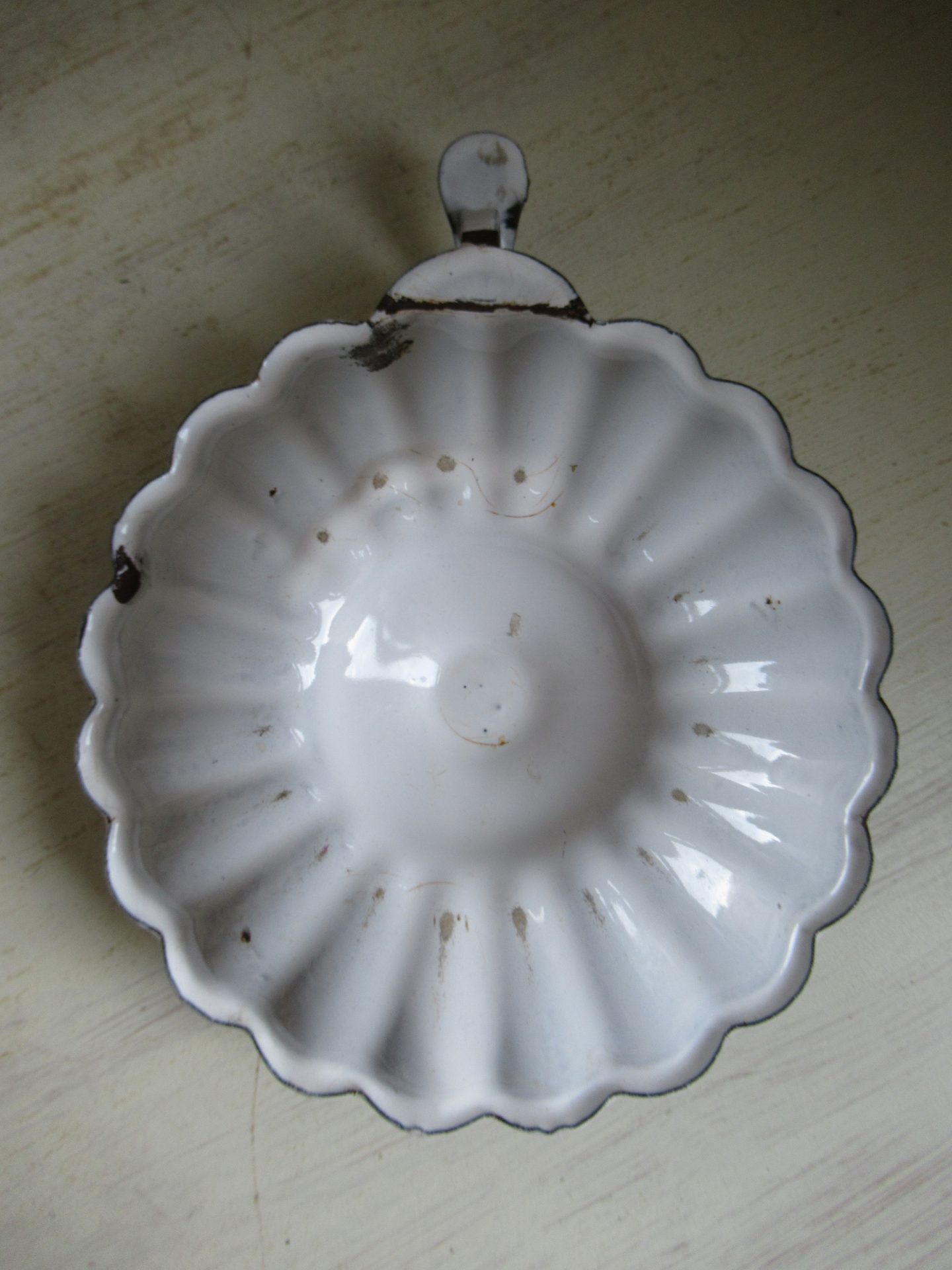 oude emaille blaker, bij het handvat ontbreekt een beetje emaille (doorsnede 16 cm)